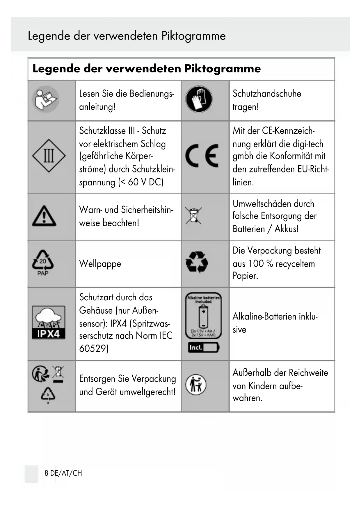 Frequenzband: 433,92 MHz maximale Sendeleistung: 0,824 mW Maße: ca. 156 x 114,6 x 31 mm Gewicht (exkl. Batterien): ca. 256 g Außensensor: Messbereich der Temperatur: -20 °C bis +50 °C (-4,0 °F bis + 122 °F) Messbereich der Luftfeuchtigkeit: 20 % bis 95 % Reichweite der Funkübertragung: max. 100 m (freies Feld) Batterien: 2 x LR03, 1,5V (AAA) DE/AT/CH 13 Legende der Display-SymboleSchutzart: IPX 4 Frequenzband: 433,92 MHz maximale Sendeleistung: 0,0165 W Maße: ca. 102,5 x 42 x 26 mm Gewicht (exkl. Batterien): ca. 42 g Angaben zu Batterie LR03 (AAA): Erzeuger: Zhongyin (Ningbo) Battery Co., Ltd Batteriekategorie: Gerätebatterie Kennzeichnung: JYSD152.2024 Ort der Erzeugung: 128 Xingguang Road, Hi-Tech Park Ningbo, China Datum der Erzeugung: Diese Angabe finden Sie auf der Batterie. Gewicht: 12g Kapazität: Diese Angabe finden Sie auf der Batterie. Chemische Zusammensetzung: Zink-Mangandioxid In der Batterie enthaltene gefährlichen Stoffe: keine zu verwendendes Feuerlöschmittel: Jede Brandklasse (keine Einschränkung) kritische Rohstoffe: Mangan, Graphit, Nickel Angaben zu Batterie LR6 (AA): Erzeuger: Zhongyin (Ningbo) Battery Co., Ltd Batteriekategorie: Gerätebatterie Kennzeichnung: JYSD151.2024 Ort der Erzeugung: 128 Xingguang Road, Hi-Tech Park Ningbo, China Datum der Erzeugung: Diese Angabe finden Sie auf der Batterie. Gewicht: 23 g Kapazität: Diese Angabe finden Sie auf der Batterie. Chemische Zusammensetzung: Zink-Mangandioxid 14 DE/AT/CH Legende der Display-SymboleIn der Batterie enthaltene gefährlichen Stoffe: keine zu verwendendes Feuerlöschmittel: Jede Brandklasse (keine Einschränkung) kritische Rohstoffe: Mangan, Graphit, Nickel ● Sicherheit Bei Schäden, die durch Nichtbeachtung dieser Bedienungsanleitung verursacht werden, erlischt der Garantieanspruch! Für Folgeschäden wird keine Haftung übernommen! Bei Sach- oder Personenschäden, die durch unsachgemäße Handhabung oder Nichtbeachtung der Sicherheitshinweise verur sacht werden, wird keine Haftung übernommen! ● Erklärung der Signalwörter Die folgenden Signalworte werden in dieser Anleitung verwendet: WARNUNG! Dieses Symbol mit dem Signalwort „WARNUNG" bezeichnet eine Gefährdung mit einem mittleren Risikograd, die, wenn sie nicht vermieden wird, den Tod oder eine schwere Verletzung zur Folge haben kann. VORSICHT! Dieses Symbol mit dem Signalwort „VORSICHT" bezeichnet eine Gefährdung mit einem geringen Risikograd, die, wenn sie nicht vermieden wird, geringe oder mäßige Verletzungen zur Folge haben kann. ACHTUNG: Dieses Signalwort warnt vor möglichen Sachschäden. Hinweis: Dieses Signalwort zeigt nützliche Informationen an. ● Allgemeine Sicherheitshinweise