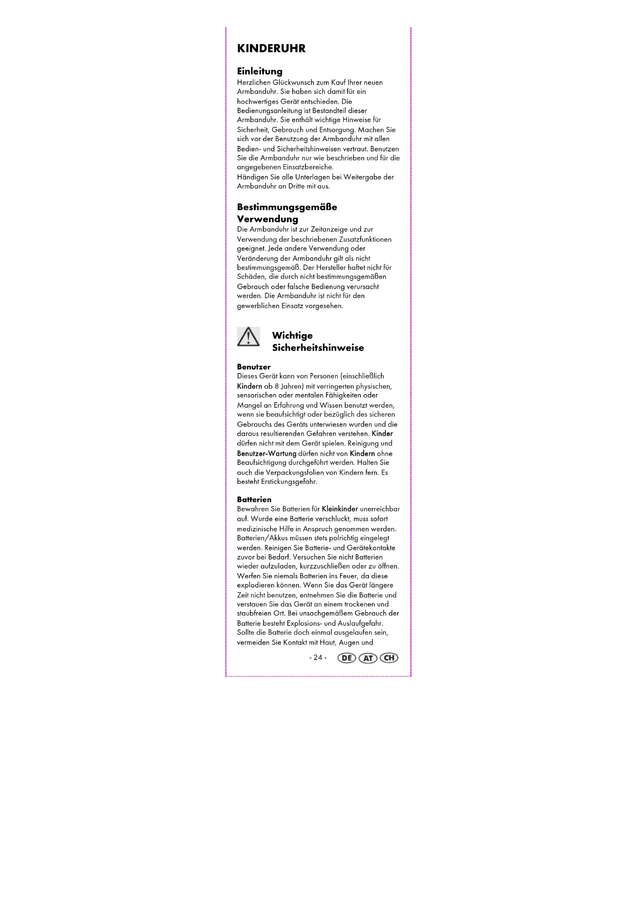KINDERUHR Einleitung Herzlichen Glückwunsch zum Kauf Ihrer neuen Armbanduhr. Sie haben sich damit für ein hochwertiges Gerät entschieden. Die Bedienungsanleitung ist Bestandteil dieser Armbanduhr. Sie enthält wichtige Hinweise für Sicherheit, Gebrauch und Entsorgung. Machen Sie sich vor der Benutzung der Armbanduhr mit allen Bedien- und Sicherheitshinweisen vertraut. Benutzen Sie die Armbanduhr nur wie beschrieben und für die angegebenen Einsatzbereiche. Händigen Sie alle Unterlagen bei Weitergabe der Armbanduhr an Dritte mit aus. Bestimmungsgemäße Verwendung Die Armbanduhr ist zur Zeitanzeige und zur Verwendung der beschriebenen Zusatzfunktionen geeignet. Jede andere Verwendung oder Veränderung der Armbanduhr gilt als nicht bestimmungsgemäß. Der Hersteller haftet nicht für Schäden, die durch nicht bestimmungsgemäßen Gebrauch oder falsche Bedienung verursacht werden. Die Armbanduhr ist nicht für den gewerblichen Einsatz vorgesehen.