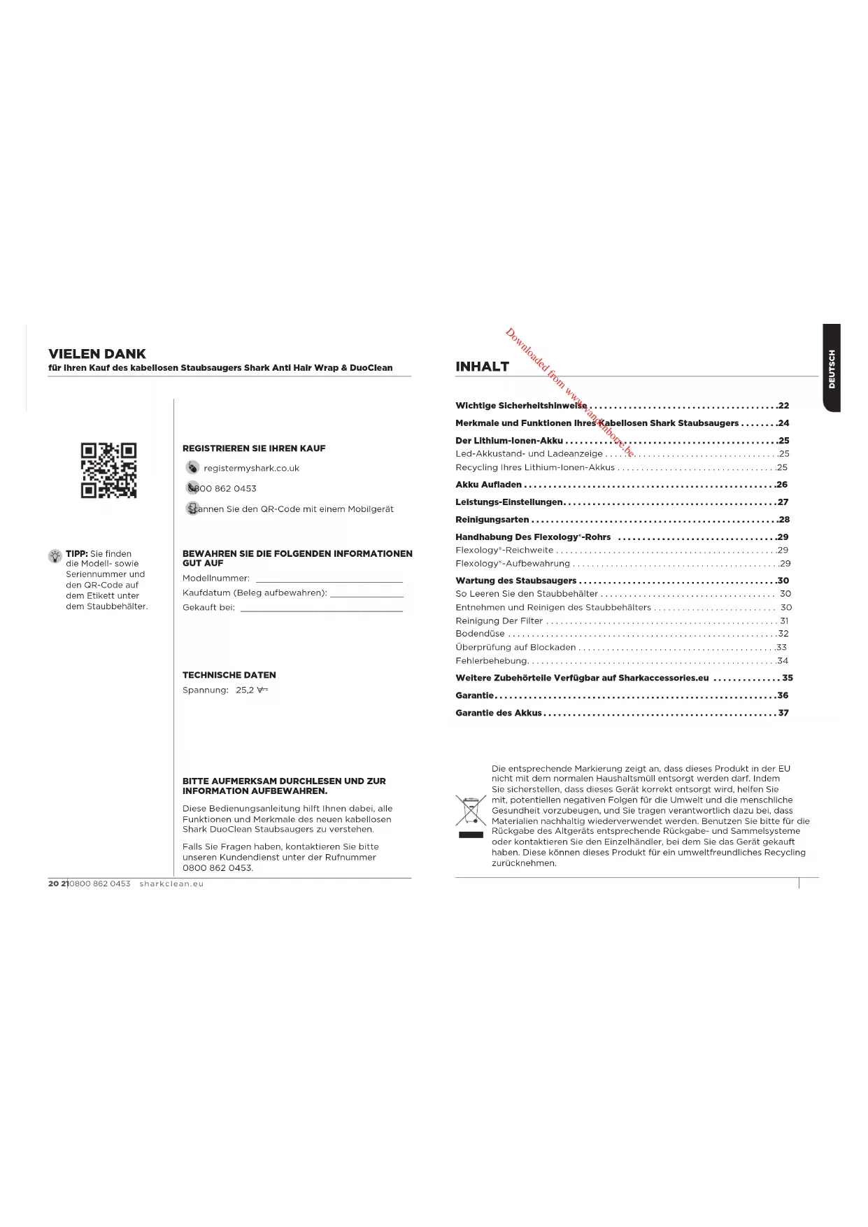 Ladekabel Abb. A Abb. CAbb. B Abb. D HINWEIS: Sollte der Staubsauger noch immer nicht ordnungsgemäß funktionieren, kontaktieren Sie den Kundendienst. DEUTSCH 34 350800 862 0453 sharkclean.eu Downloaded from www.vandenborre.beFÜNF (5) JAHRE EINGESCHRÄNKTE GARANTIE Wenn Sie als Verbraucher ein Produkt in Deutschland kaufen, erhalten Sie automatisch Gewährleistungsrechte hinsichtlich der Produktqualität (Ihre „gesetzlichen Rechte“). Sie können diese gesetzlichen Rechte Ihrem Einzelhändler gegenüber geltend machen. Allerdings haben wir bei Shark so großes Vertrauen in die Qualität unserer Produkte (die „Produkte“), dass wir Ihnen eine zusätzliche Herstellergarantie von bis zu 5 Jahren bieten (2 Jahre Standardgarantie plus 3 weitere Jahre nach Registrierung (die „Erweiterte Garantie“)). Diese Garantie gilt nur, wenn das Produkt neu und unbenutzt gekauft wird. Diese Bedingungen beziehen sich nur auf unsere Garantien - Ihre gesetzlichen Rechte als Käufer bleiben davon unberührt. Bitte beachten Sie, dass die 5-Jahres-Garantie in allen EU-Ländern und dem Vereinigten Königreich angeboten wird, auch für den Fall, dass das Vereinigte Königreich während des Garantiezeitraums kein EU- Mitgliedsland mehr sein wird. In den nachstehenden Bedingungen werden die Bedingungen und der Umfang unserer Garantien beschrieben, die von der SharkNinja Germany GmbH, Kurt-Blaum-Platz 8, 63450 Hanau (Deutschland) („uns“, „unser“, „wir“) gegeben werden. Sie beeinträchtigen keine gesetzlichen Rechte aus dem Kaufvertrag mit dem Einzelhändler, bei dem Sie das Produkt erworben haben, oder die Verpflichtungen Ihres Einzelhändlers aus dem Kauf und die Ihres Kaufvertrags mit ihm. Das gilt auch, wenn Sie das Produkt direkt von Shark erworben haben. Die 5-Jahres-Garantie gilt nicht für das Lithium-Ionen-Akku-Pack (siehe Akku-Garantie auf der nächsten Seite). Shark