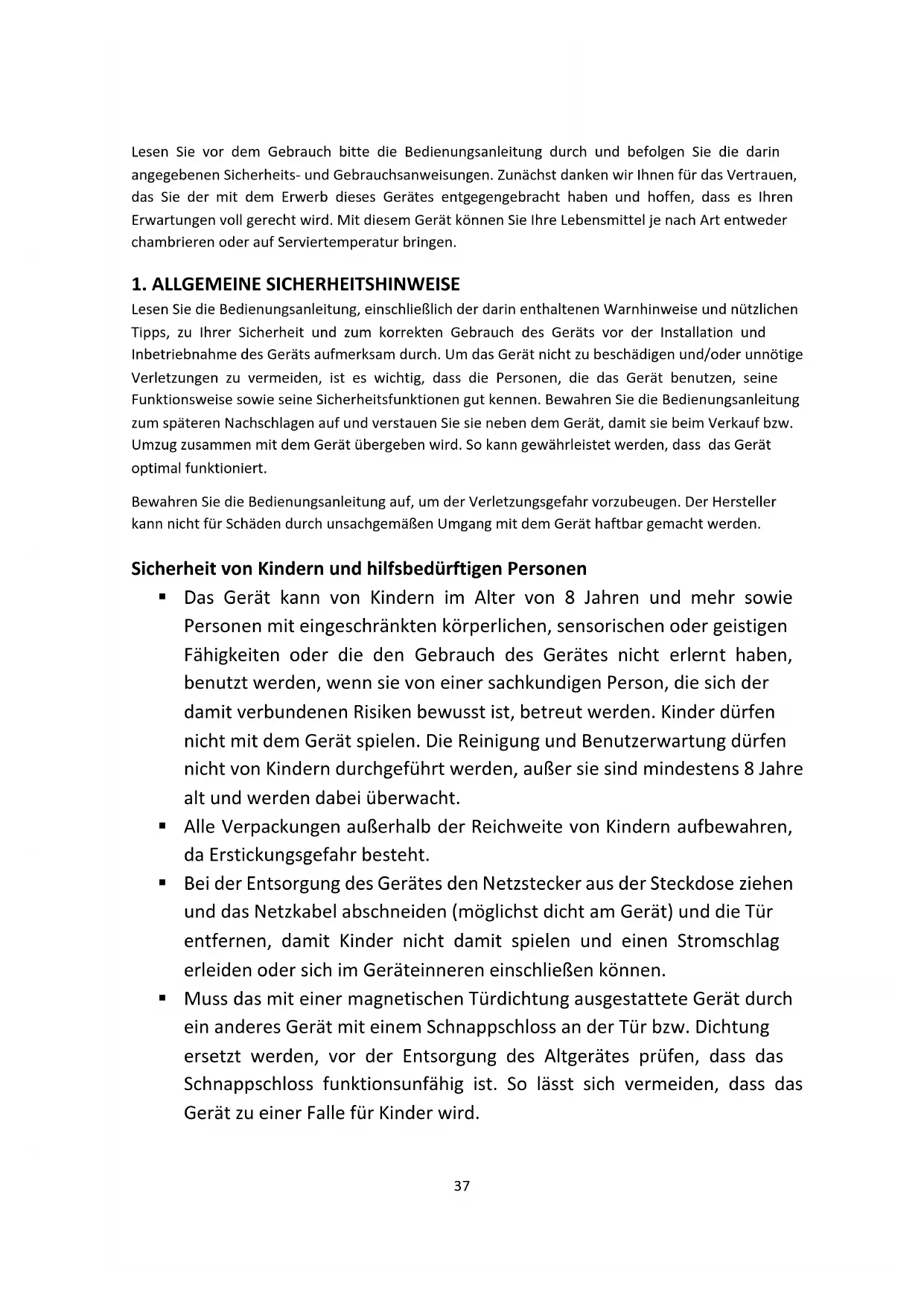 Lesen Sie die Bedienungsanleitung, einschließlich der darin enthaltenen Warnhinweise und nützlichen Tipps, zu Ihrer Sicherheit und zum korrekten Gebrauch des Geräts vor der Installation und Inbetriebnahme des Geräts aufmerksam durch. Um das Gerät nicht zu beschädigen und/oder unnötige Verletzungen zu vermeiden, ist es wichtig, dass die Personen, die das Gerät benutzen, seine Funktionsweise sowie seine Sicherheitsfunktionen gut kennen. Bewahren Sie die Bedienungsanleitung zum späteren Nachschlagen auf und verstauen Sie sie neben dem Gerät, damit sie beim Verkauf bzw. Umzug zusammen mit dem Gerät übergeben wird. So kann gewährleistet werden, dass das Gerät optimal funktioniert. Bewahren Sie die Bedienungsanleitung auf, um der Verletzungsgefahr vorzubeugen. Der Hersteller kann nicht für Schäden durch unsachgemäßen Umgang mit dem Gerät haftbar gemacht werden. Sicherheit von Kindern und hilfsbedürftigen Personen
