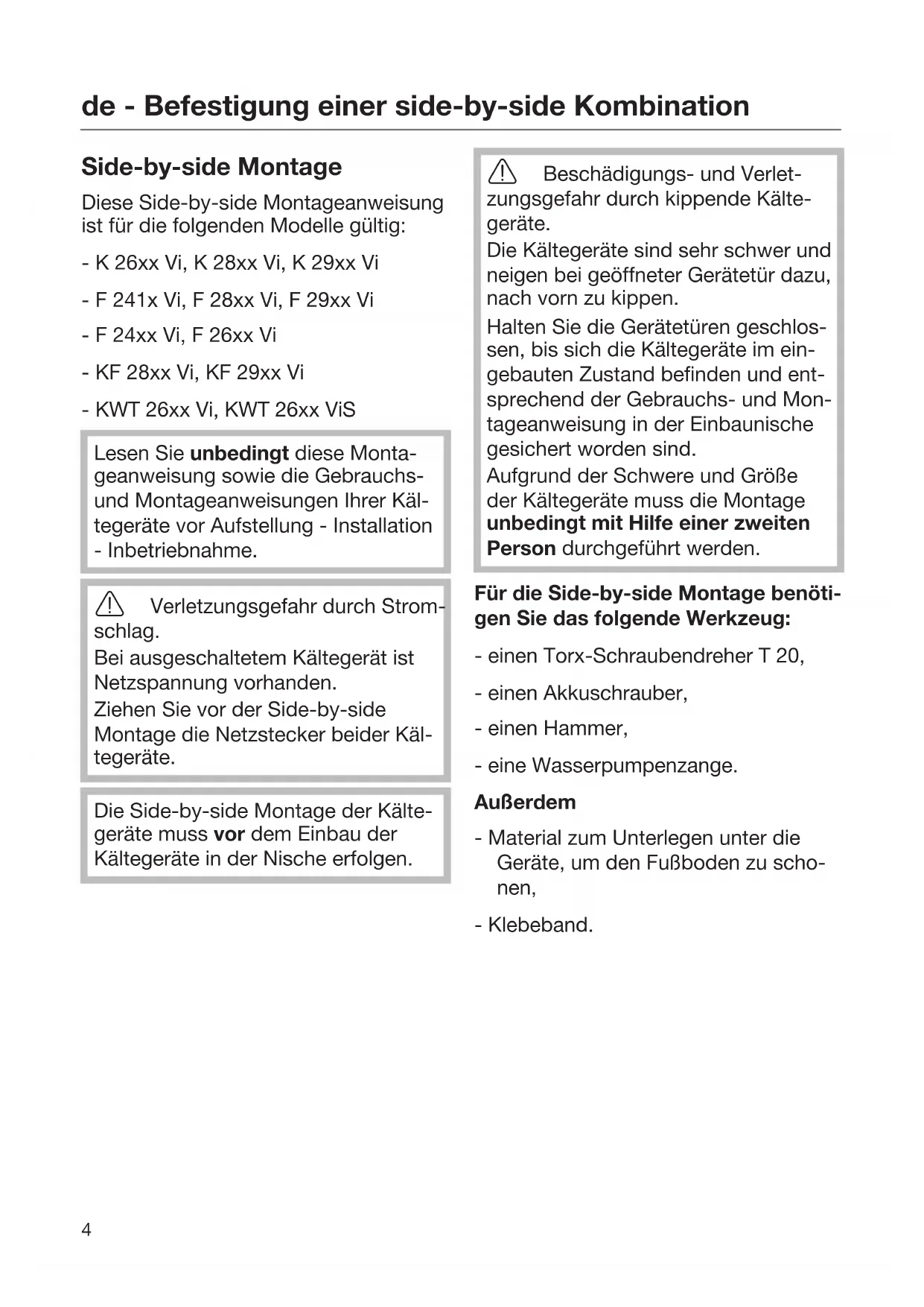 Side-by-side Montage Diese Side-by-side Montageanweisung ist für die folgenden Modelle gültig: - K 26xx Vi, K 28xx Vi, K 29xx Vi - F 241x Vi, F 28xx Vi, F 29xx Vi - F 24xx Vi, F 26xx Vi - KF 28xx Vi, KF 29xx Vi - KWT 26xx Vi, KWT 26xx ViS Lesen Sie unbedingt diese Monta- geanweisung sowie die Gebrauchs- und Montageanweisungen Ihrer Käl- tegeräte vor Aufstellung - Installation - Inbetriebnahme. Verletzungsgefahr durch Strom- schlag. Bei ausgeschaltetem Kältegerät ist Netzspannung vorhanden. Ziehen Sie vor der Side-by-side Montage die Netzstecker beider Käl- tegeräte. Die Side-by-side Montage der Kälte- geräte muss vor dem Einbau der Kältegeräte in der Nische erfolgen. Beschädigungs- und Verlet- zungsgefahr durch kippende Kälte- geräte. Die Kältegeräte sind sehr schwer und neigen bei geöffneter Gerätetür dazu, nach vorn zu kippen. Halten Sie die Gerätetüren geschlos- sen, bis sich die Kältegeräte im ein- gebauten Zustand befinden und ent- sprechend der Gebrauchs- und Mon- tageanweisung in der Einbaunische gesichert worden sind. Aufgrund der Schwere und Größe der Kältegeräte muss die Montage unbedingt mit Hilfe einer zweiten Person durchgeführt werden. Für die Side-by-side Montage benöti- gen Sie das folgende Werkzeug: - einen Torx-Schraubendreher T 20, - einen Akkuschrauber, - einen Hammer, - eine Wasserpumpenzange. Außerdem - Material zum Unterlegen unter die Geräte, um den Fußboden zu scho- nen, - Klebeband.de - Befestigung einer side-by-side Kombination