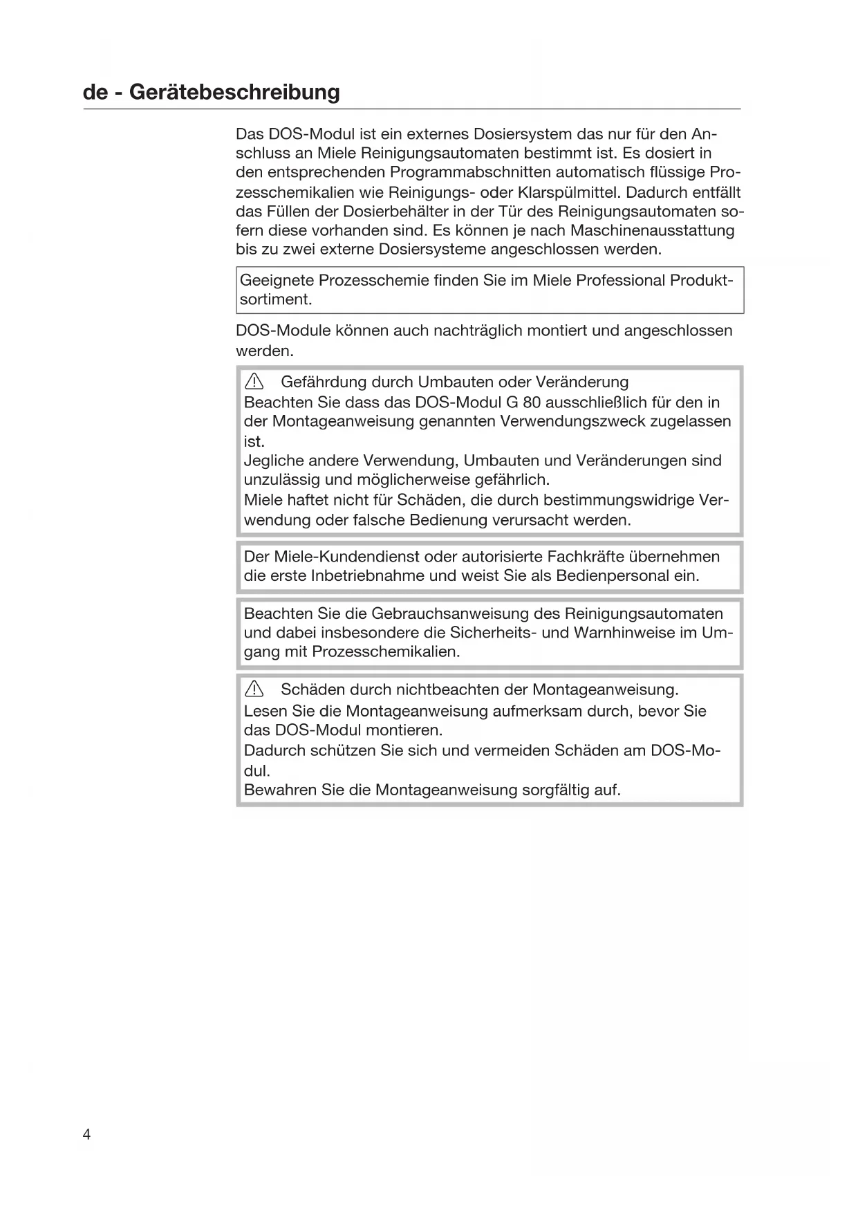 Das DOS-Modul ist ein externes Dosiersystem das nur für den An- schluss an Miele Reinigungsautomaten bestimmt ist. Es dosiert in den entsprechenden Programmabschnitten automatisch flüssige Pro- zesschemikalien wie Reinigungs- oder Klarspülmittel. Dadurch entfällt das Füllen der Dosierbehälter in der Tür des Reinigungsautomaten so- fern diese vorhanden sind. Es können je nach Maschinenausstattung bis zu zwei externe Dosiersysteme angeschlossen werden. Geeignete Prozesschemie finden Sie im Miele Professional Produkt- sortiment. DOS-Module können auch nachträglich montiert und angeschlossen werden. Gefährdung durch Umbauten oder Veränderung Beachten Sie dass das DOS-Modul G 80 ausschließlich für den in der Montageanweisung genannten Verwendungszweck zugelassen ist. Jegliche andere Verwendung, Umbauten und Veränderungen sind unzulässig und möglicherweise gefährlich. Miele haftet nicht für Schäden, die durch bestimmungswidrige Ver- wendung oder falsche Bedienung verursacht werden. Der Miele-Kundendienst oder autorisierte Fachkräfte übernehmen die erste Inbetriebnahme und weist Sie als Bedienpersonal ein. Beachten Sie die Gebrauchsanweisung des Reinigungsautomaten und dabei insbesondere die Sicherheits- und Warnhinweise im Um- gang mit Prozesschemikalien. Schäden durch nichtbeachten der Montageanweisung. Lesen Sie die Montageanweisung aufmerksam durch, bevor Sie das DOS-Modul montieren. Dadurch schützen Sie sich und vermeiden Schäden am DOS-Mo- dul. Bewahren Sie die Montageanweisung sorgfältig auf.de - Gerätebeschreibung