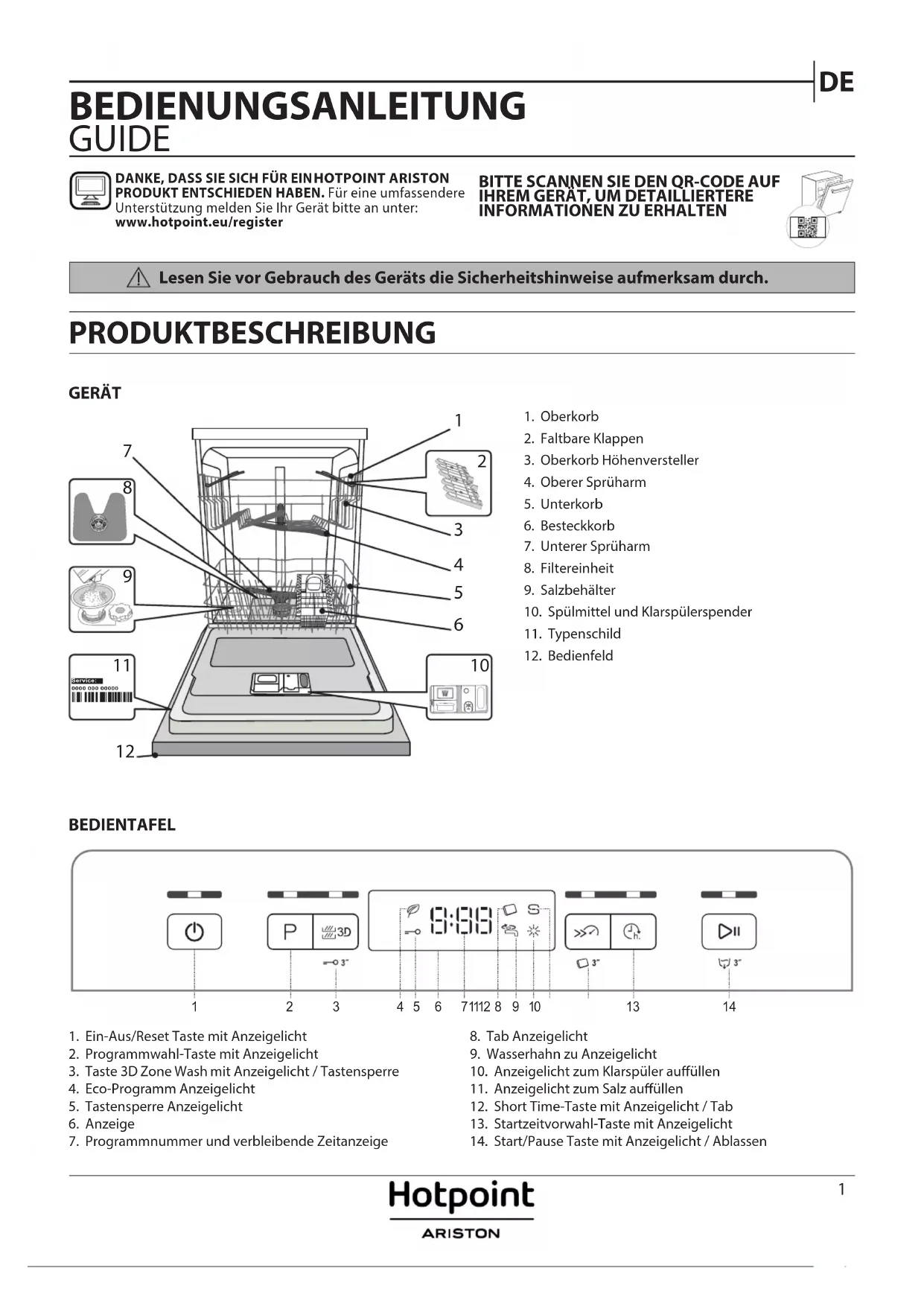 DANKE, DASS SIE SICH FÜR EIN HOTPOINT ARISTON PRODUKT ENTSCHIEDEN HABEN. Für eine umfassendere Unterstützung melden Sie Ihr Gerät bitte an unter: www.hotpoint.eu/registerLesen Sie vor Gebrauch des Geräts die Sicherheitshinweise aufmerksam durch. BITTE SCANNEN SIE DEN QR-CODE AUF IHREM GERÄT, UM DETAILLIERTERE INFORMATIONEN ZU ERHALTEN2 ERSTER GEBRAUCH