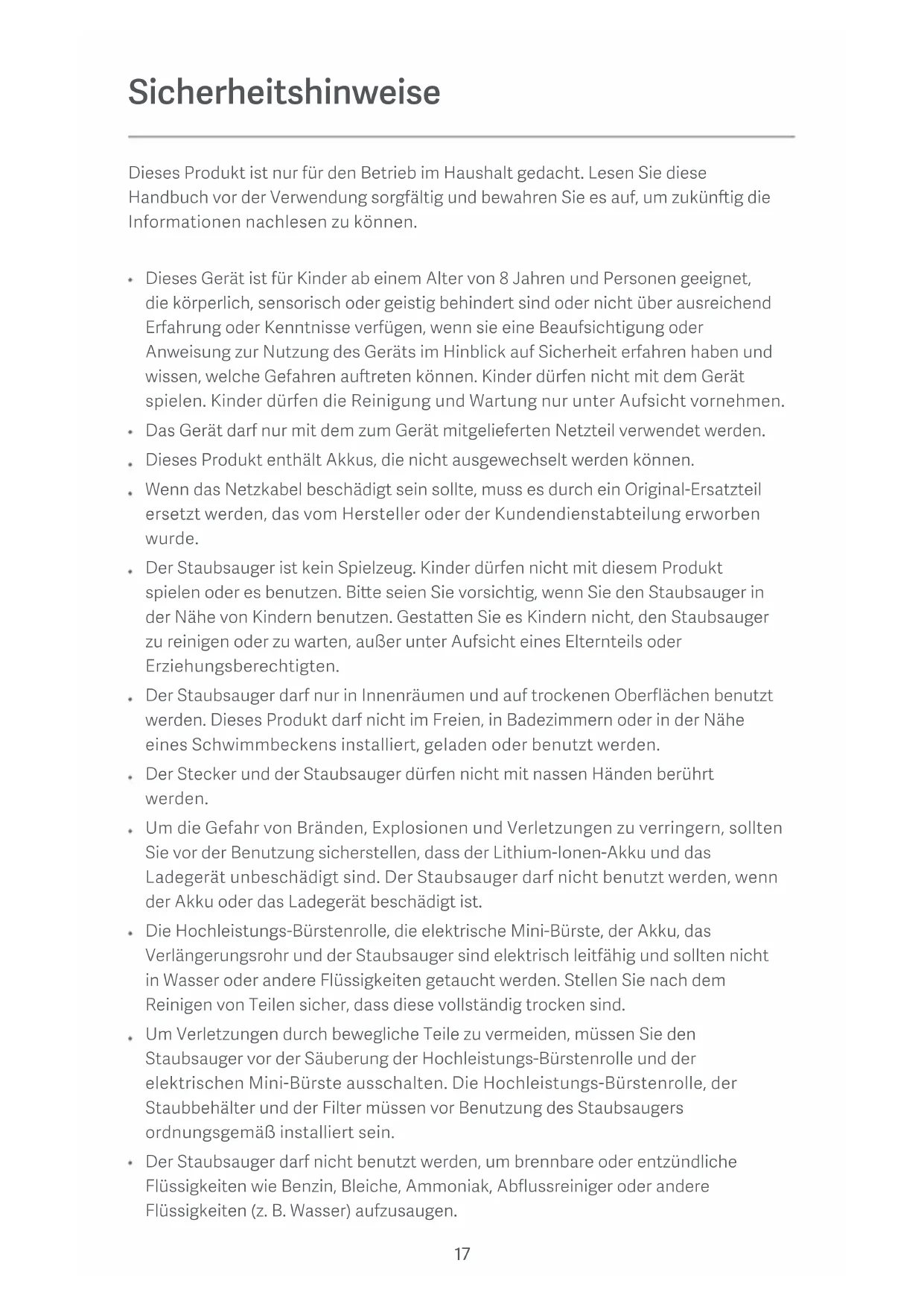 Precautions for Baery Use The vacuum cleaner is in standby mode and cannot be used during charging. The lithium-on baery pack contains substances that are hazardous to the environment. Before disposing of the vacuum cleaner, please first remove the baery pack, then discard, or recycle it in accordance with local laws and regulations of the country or region it is used in. Note: The vacuum cleaner must be turned off before removing the baery. The baery should be disposed of in a safe manner.17 Sicherheitshinweise Dieses Gerät ist für Kinder ab einem Alter von 8 Jahren und Personen geeignet, die körperlich, sensorisch oder geistig behindert sind oder nicht über ausreichend Erfahrung oder Kenntnisse verfügen, wenn sie eine Beaufsichtigung oder Anweisung zur Nutzung des Geräts im Hinblick auf Sicherheit erfahren haben und wissen, welche Gefahren aureten können. Kinder dürfen nicht mit dem Gerät spielen. Kinder dürfen die Reinigung und Wartung nur unter Aufsicht vornehmen. Das Gerät darf nur mit dem zum Gerät mitgelieferten Netzteil verwendet werden. Dieses Produkt enthält Akkus, die nicht ausgewechselt werden können. Wenn das Netzkabel beschädigt sein sollte, muss es durch ein Original-Ersatzteil ersetzt werden, das vom Hersteller oder der Kundendienstabteilung erworben wurde. Der Staubsauger ist kein Spielzeug. Kinder dürfen nicht mit diesem Produkt spielen oder es benutzen. Bie seien Sie vorsichtig, wenn Sie den Staubsauger in der Nähe von Kindern benutzen. Gestaen Sie es Kindern nicht, den Staubsauger zu reinigen oder zu warten, außer unter Aufsicht eines Elternteils oder Erziehungsberechtigten. Der Staubsauger darf nur in Innenräumen und auf trockenen Oberflächen benutzt werden. Dieses Produkt darf nicht im Freien, in Badezimmern oder in der Nähe eines Schwimmbeckens installiert, geladen oder benutzt werden. Der Stecker und der Staubsauger dürfen nicht mit nassen Händen berührt werden. Um die Gefahr von Bränden, Explosionen und Verletzungen zu verringern, sollten Sie vor der Benutzung sicherstellen, dass der Lithium-Ionen-Akku und das Ladegerät unbeschädigt sind. Der Staubsauger darf nicht benutzt werden, wenn der Akku oder das Ladegerät beschädigt ist. Die Hochleistungs-Bürstenrolle, die elektrische Mini-Bürste, der Akku, das Verlängerungsrohr und der Staubsauger sind elektrisch leitfähig und sollten nicht in Wasser oder andere Flüssigkeiten getaucht werden. Stellen Sie nach dem Reinigen von Teilen sicher, dass diese vollständig trocken sind. Um Verletzungen durch bewegliche Teile zu vermeiden, müssen Sie den Staubsauger vor der Säuberung der Hochleistungs-Bürstenrolle und der elektrischen Mini-Bürste ausschalten. Die Hochleistungs-Bürstenrolle, der Staubbehälter und der Filter müssen vor Benutzung des Staubsaugers ordnungsgemäß installiert sein. Der Staubsauger darf nicht benutzt werden, um brennbare oder entzündliche Flüssigkeiten wie Benzin, Bleiche, Ammoniak, Abflussreiniger oder andere Flüssigkeiten (z.B. Wasser) aufzusaugen. Dieses Produkt ist nur für den Betrieb im Haushalt gedacht. Lesen Sie diese Handbuch vor der Verwendung sorgfältig und bewahren Sie es auf, um zukünig die Informationen nachlesen zu können.18 Der Staubsauger darf nicht benutzt werden, um Rigipspartikel, Asche (z.B. Kaminasche) oder Rauch- oder Brennmaterialien wie Kohle, Zigareenstummel oder Streichhölzer aufzusaugen. Der Staubsauger darf nicht benutzt werden, um scharfe oder harte Objekte wie Glas, Nägel, Schrauben oder Münzen aufzusaugen, da dies zu Schäden am Produkt führen kann. Halten Sie Ihre Haare, Kleidung, Finger und anderen Körperteile von den Öffnungen und beweglichen Teilen fern. Richten Sie die Saugöffnung, das Verlängerungsrohr oder anderes Zubehör nicht auf Ihre Augen oder Ohren und nehmen Sie sie nicht in den Mund. Stecken Sie keine Gegenstände in die Öffnungen des Staubsaugers und benutzen Sie den Staubsauger nicht, wenn Öffnungen blockiert sind. Halten Sie das Gerät frei von Staub, Fusseln, Haaren oder anderen Gegenständen, die den Lustrom behindern könnten. Lehnen Sie den Staubsauger nicht gegen einen Stuhl, Tisch oder andere instabile Oberflächen, da dies zu Schäden am Produkt oder zu Verletzungen führen kann. Wenn der Staubsauger aufgrund von Stößen oder Beschädigungen nicht mehr funktioniert, wenden Sie sich bie an die autorisierte Serviceabteilung. Versuchen Sie nicht, den Staubsauger selbst zu zerlegen. Das Produkt darf ausschließlich mit dem Original-Ladegerät und nur in Umgebungen mit einer Umgebungstemperatur von 0 °C bis 35 °C geladen werden. Andernfalls kann der Akku beschädigt werden. Der Staubbehälter, die Filterwae, der Zyklonabscheider und der Filter müssen vor dem Gebrauch des Staubsaugers ordnungsgemäß installiert sein. Stellen Sie sicher, dass der Staubsauger nicht mit dem Stromnetz verbunden ist, wenn Sie ihn über längere Zeit nicht benutzen. Der Staubsauger muss außerdem vom Stromnetz getrennt werden, bevor Wartungs- und Reparaturarbeiten erfolgen. Bie seien Sie besonders vorsichtig, wenn Sie den Staubsauger zur Treppenreinigung verwenden. WARNUNG: Auf den Filter des Staubsaugers dürfen keinesfalls Dustoffe aufgetragen werden. Diese Art von Produkten enthält häufig brennbare Chemikalien, die dazu führen könnten, dass das Gerät Feuer fängt. Setzen Sie das Gerät auf KEINEN Fall Feuer aus, da dies zur Explosion führen kann. Sie dürfen das Gerät NICHT in Wasser, Salzwasser oder andere Flüssigkeiten eintauchen oder diesen aussetzen. Bie halten Sie sich bei der Benutzung des Staubsaugers streng an die Anweisungen dieses Benutzerhandbuchs. Benutzer sind für jeglichen Verlust und Schaden verantwortlich, die durch den unsachgemäßen Gebrauch dieses Staubsaugers entstehen. Ein detailliertes elektronisches Handbuch finden Sie unter www.mi.com/global/service/userguideVerpackungsinhalt Bürstenloser Hochgeschwindigkeitsmotor: Läu schnell mit einer konstanten, starken Saugkra für schnell