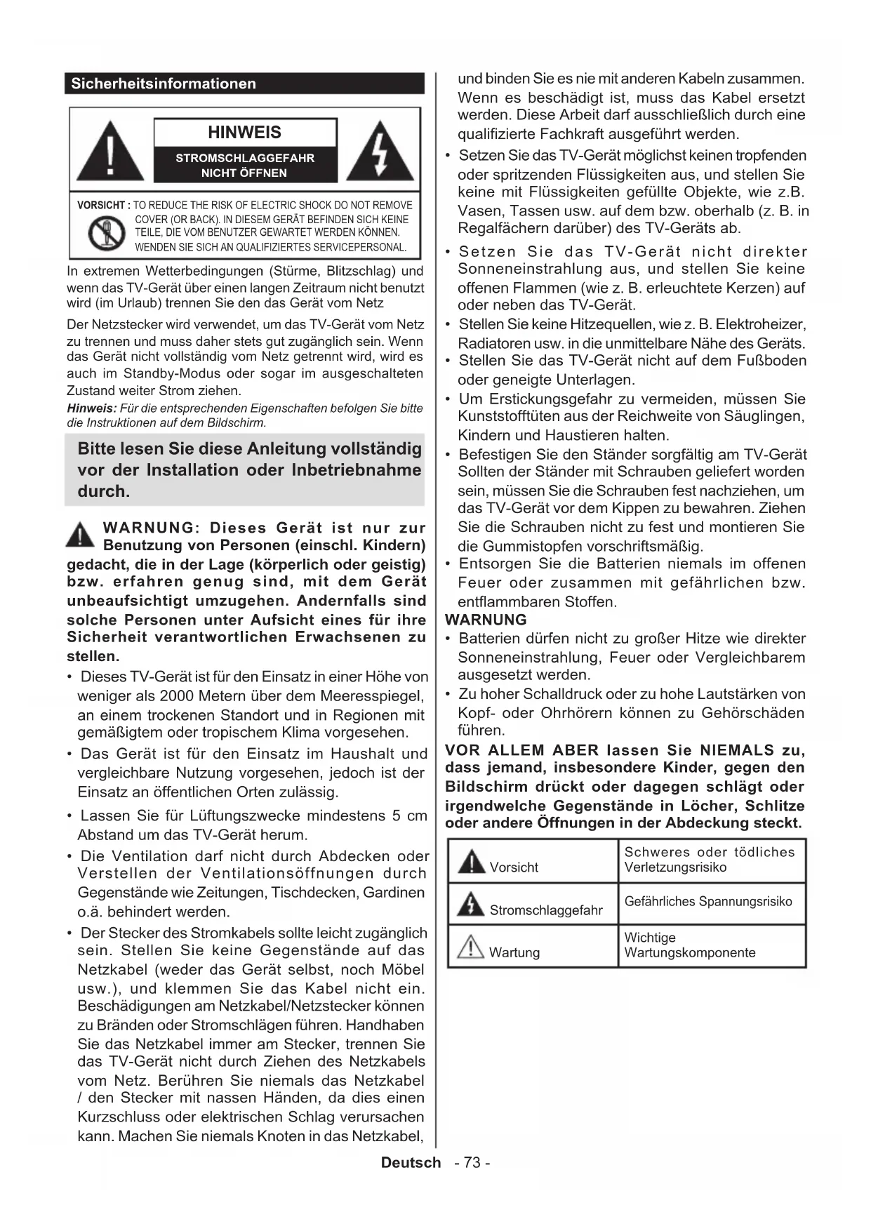 - Um ein Herabfallen und Verletzungen zu verhindern, sollten Sie das TV-Gerät von der Wand abnehmen, wenn es nicht länger verwendet wird. Abbildungen und Illustrationen in diesem Benutzerhandbuch dienen nur der Anschauung und können sich in der Erscheinung vom eigentlichen Gerät unterscheiden. Das Produktdesign und die Technischen Daten können ohne vorherige Ankündigung geändert werden. WARTUNG Ziehen Sie zuerst den Stecker aus Steckdose. Bildschirm, Gehäuse, Ständer Normale Pflege: Wischen Sie die Oberfläche des Bildschirms, des Gehäuse bzw. Ständers mit einem weichen Tuch ab, um Schmutz oder Fingerabdrücke zu beseitigen. Bei hartnäckigem Schmutz: