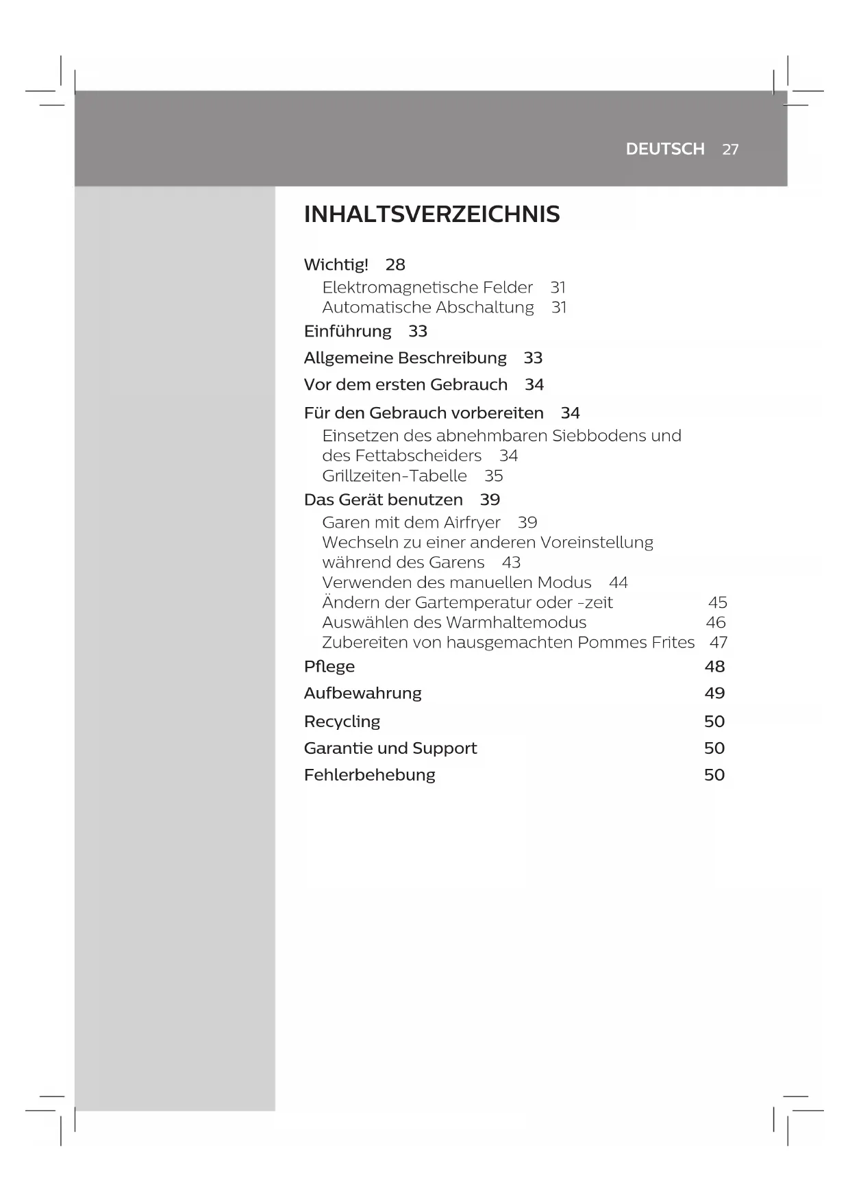 - Always make sure that the removable parts of the Airfryer e.g. removable mesh bottom, etc. are xed before you carry and/or store it. Recycling - This symbol means that this product shall not be disposed of with normal household waste (2012/19/EU). - Follow your country’s rules for the separate collection of electrical and electronic products. Correct disposal helps prevent negative consequences for the environment and human health. Guarantee and support If you need information or support, please visit www.philips.com/support or read the separate worldwide guarantee leaet. Troubleshooting This chapter summarizes the most common problems you could encounter with the appliance. If you are unable to solve the problem with the information below, visit www.philips.com/support for a list of frequently asked questions or contact the Consumer Care Center in your country.25 ENGLISH Problem Possible cause Solution The outside of the appliance becomes hot during use. The heat inside radiates to the outside walls. This is normal. All handles and knobs that you need to touch during use stay cool enough to touch. The pan, basket, fat reducer, and the inside of the appliance always become hot when the appliance is switched on to ensure the food is properly cooked. These parts are always too hot to touch. If you leave the appliance switched on for a longer time, some areas get too hot to touch. These areas are marked on the appliance with the following icon: As long as you are aware of the hot areas and avoid touching them, the appliance is completely safe to use. My home-made fries do not turn out as I expected. You did not use the right potato type. To get the best results, use fresh (slightly) oury potatoes. If you need to store the potatoes, do not store them in a cold environment like in a fridge. Choose potatoes whose package states that they are suitable for frying. The amount of ingredients in the basket is too big. Follow the instructions in this user manual to prepare home-made fries (see ‘Food table’ or download the free Airfryer App). Certain types of ingredients need to be shaken halfway through the cooking time. Follow the instructions in this user manual to prepare home-made fries (see ‘Food table’ or download the free Airfryer App). The Airfryer does not switch on. The appliance is not plugged in. When you switch on the appliance, you hear the sound of the working fan. If you do not hear this sound, check if the plug is inserted in the wall outlet properly. Several appliances are connected to one outlet. The Airfryer has a high wattage. Try a dierent outlet and check the fuses.26 ENGLISH Problem Possible cause Solution I see some peeling o spots inside my Airfryer. Some small spots can appear inside the pan of the Airfryer due to the incidental touching or scratching of the coating (e.g. during cleaning with harsh cleaning tools and/or while inserting the basket). You can prevent damage by lowering the basket into the pan properly. If you insert the basket at an angle, its side may knock against the wall of the pan, causing small pieces of coating to chip o. If this occurs, please be informed that this is not harmful as all materials used are food-safe. White smoke comes out of the appliance. You are cooking fatty ingredients and the fat reducer is not put in the pan. Carefully pour o any excess oil or fat from the pan, place the fat reducer in the pan and then continue cooking. The pan still contains greasy residues from previous use. White smoke is caused by greasy residues heating up in the pan. Always clean the pan, basket and fat reducer thoroughly after every use. Breading or coating did not adhere properly to the food. Tiny pieces of airborne breading can cause white smoke. Firmly press breading or coating to food to ensure it sticks. Marinade, liquid or meat juices are splattering in the rendered fat or grease Pat food dry before placing it in the basket. My display shows 5 dashes as illustrated in the picture below. Safety feature has been activated due to overheating of the appliance. Unplug the appliance and let it cool down for 1 minute before plugging in again.27 DEUTSCH INHALTSVERZEICHNIS Wichtig! 28 Elektromagnetische Felder 31 Automatische Abschaltung 31 Einführung 33 Allgemeine Beschreibung 33 Vor dem ersten Gebrauch 34 Für den Gebrauch vorbereiten 34 Einsetzen des abnehmbaren Siebbodens und des Fettabscheiders 34 Grillzeiten-Tabelle 35 Das Gerät benutzen 39 Garen mit dem Airfryer 39 Wechseln zu einer anderen Voreinstellung während des Garens 43 Verwenden des manuellen Modus 44 Ändern der Gartemperatur oder -zeit 45 Auswählen des Warmhaltemodus 46 Zubereiten von hausgemachten Pommes Frites 47 Pege 48 Aufbewahrung 49 Recycling 50 Garantie und Support 50 Fehlerbehebung 5028 DEUTSCH Wichtig! Lesen Sie diese wichtigen Informationen vor dem Gebrauch des Geräts aufmerksam durch, und bewahren Sie sie für eine spätere Verwendung auf. Achtung! - Geben Sie die zu bratenden Zutaten in den Korb, damit sie nicht mit den Heizelementen in Kontakt kommen. - Lufteinlass und Luftaustrittsönungen müssen unbedeckt bleiben, während das Gerät in Betrieb ist. - Füllen Sie die Pfanne nicht mit Öl, da sonst Brandgefahr besteht. - Tauchen Sie das Gerät niemals in Wasser oder andere Flüssigkeiten; spülen Sie es auch nicht unter ießendem Wasser ab. - Achten Sie darauf, dass kein Wasser oder andere Flüssigkeiten in das Gerät gelangen, um das Risiko eines Stromschlags zu vermeiden. - Befüllen Sie den Korb nie über den angegebenen Maximalpegel. - Berühren Sie nie die Innenseite des Geräts, während es in Betrieb ist. Achtung - Prüfen Sie, bevor Sie das Gerät in Betrieb nehmen, ob die Spannungsangabe auf dem Gerät mit der örtlichen Netzspannung übereinstimmt. - Verwenden Sie das Gerät nicht, wenn der Netzstecker, das Netzkabel oder das Gerät selbst defekt oder beschädigt sind. - Um Gefährdungen zu vermeiden, darf ein defektes Netzkabel nur von einem Philips 