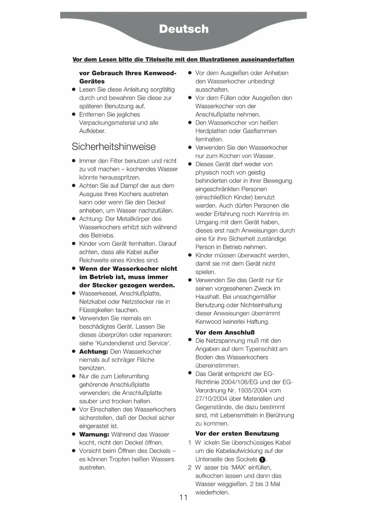 Das Gerät entspricht der EG- Richtlinie 2004/108/EG und der EG- Verordnung Nr. 1935/2004 vom 27/10/2004 über Materialien und Gegenstände, die dazu bestimmt sind, mit Lebensmitteln in Berührung zu kommen. Vor der ersten Benutzung 1Wickeln Sie überschüssiges Kabel um die Kabelaufwicklung auf der Unterseite des Sockels . 2Wasser bis ‘MAX’ einfüllen, aufkochen lassen und dann das Wasser weggießen. 2 bis 3 Mal wiederholen. Deutsch