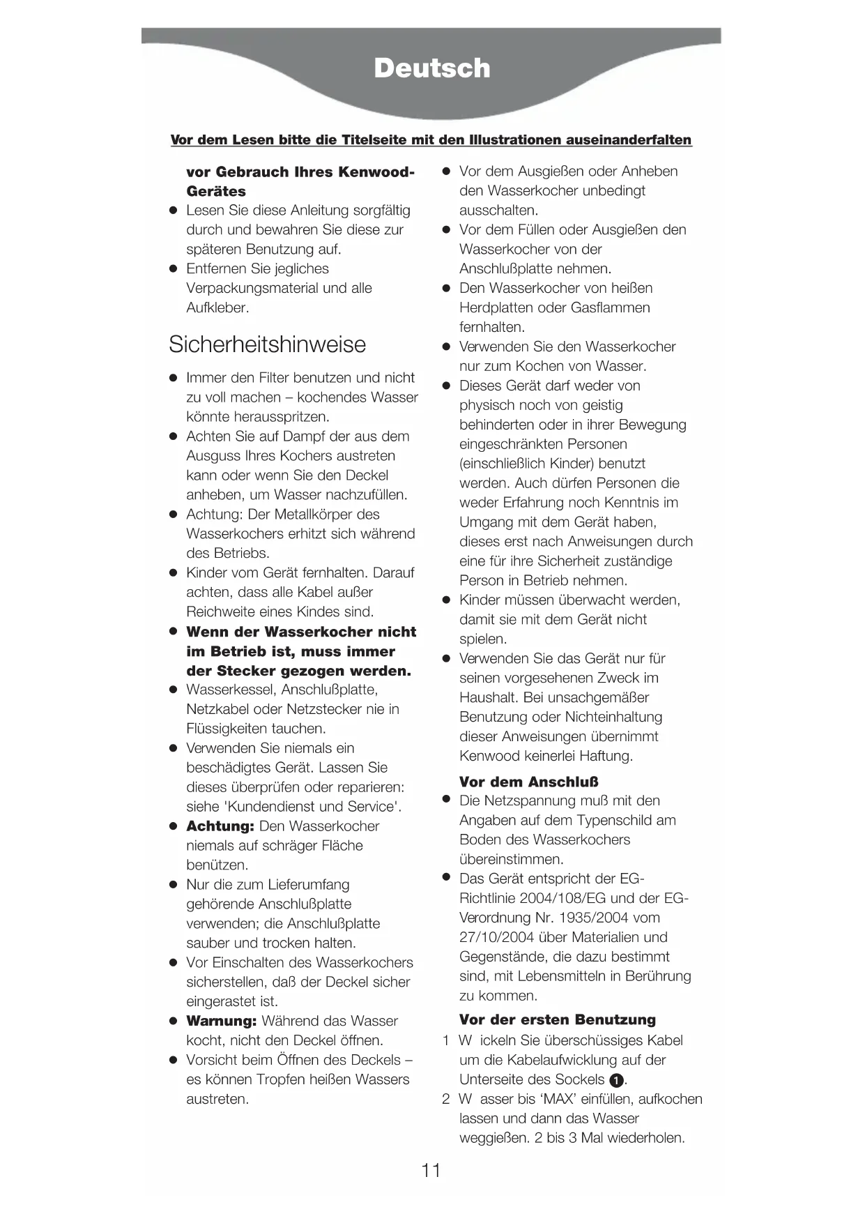 Das Gerät entspricht der EG- Richtlinie 2004/108/EG und der EG- Verordnung Nr. 1935/2004 vom 27/10/2004 über Materialien und Gegenstände, die dazu bestimmt sind, mit Lebensmitteln in Berührung zu kommen. Vor der ersten Benutzung 1Wickeln Sie überschüssiges Kabel um die Kabelaufwicklung auf der Unterseite des Sockels . 2Wasser bis ‘MAX’ einfüllen, aufkochen lassen und dann das Wasser weggießen. 2 bis 3 Mal wiederholen. Deutsch