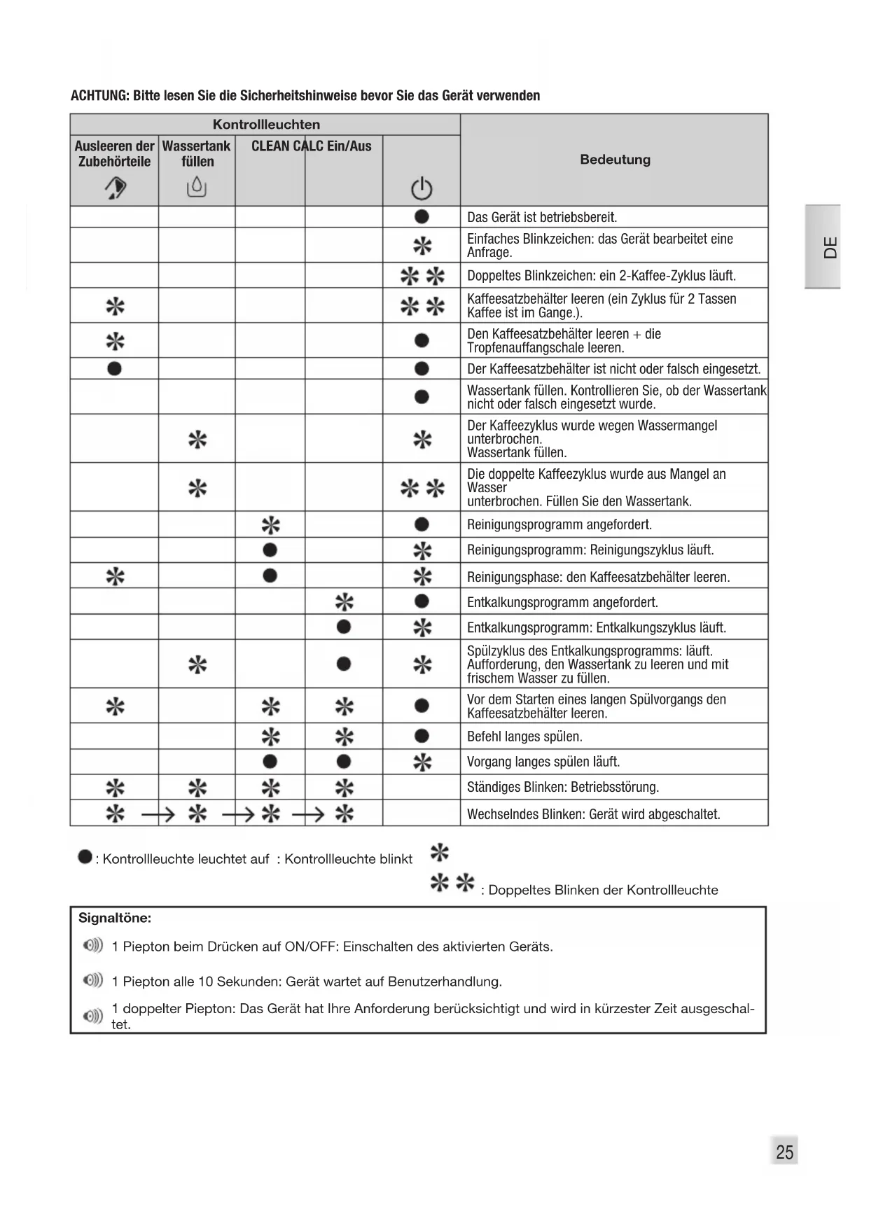 Gefahr: Warnung vor Gefahren, die zu schweren oder tödlichen Körperverletzungen führen können. Ein Blitz-Symbol warnt vor Gefahren im Zusammenhang mit elektrischem Strom. Achtung: Warnung vor Einüssen, die zu Funktionsstörungen, Schäden oder zur Zerstörung des Gerätes führen können. Wichtig: Allgemeiner oder wichtiger Hinweis zur Sicherung der Funktionsfähigkeit des Gerätes. Piktogramme und Warnsignale Kaffeesatz-Auffangbehälter und Tropfschale entleeren: Die Betriebsanzeige leuchtet weiter, wenn der Kaffeesatz- behälter nicht korrekt eingeschoben ist oder wenn er vor Ablauf von 4 Sekunden an seinen Platz zurückgestellt wird. Wasserbehälter füllen Einstellung des Mahlgrades der Kaffeebohnen CLEAN Reinigen Standard-Kaffee Starker Kaffee CALC Entkalken Dampftaste CLEAN + CALC Langspülung durchführen Spülen/Pegen27
