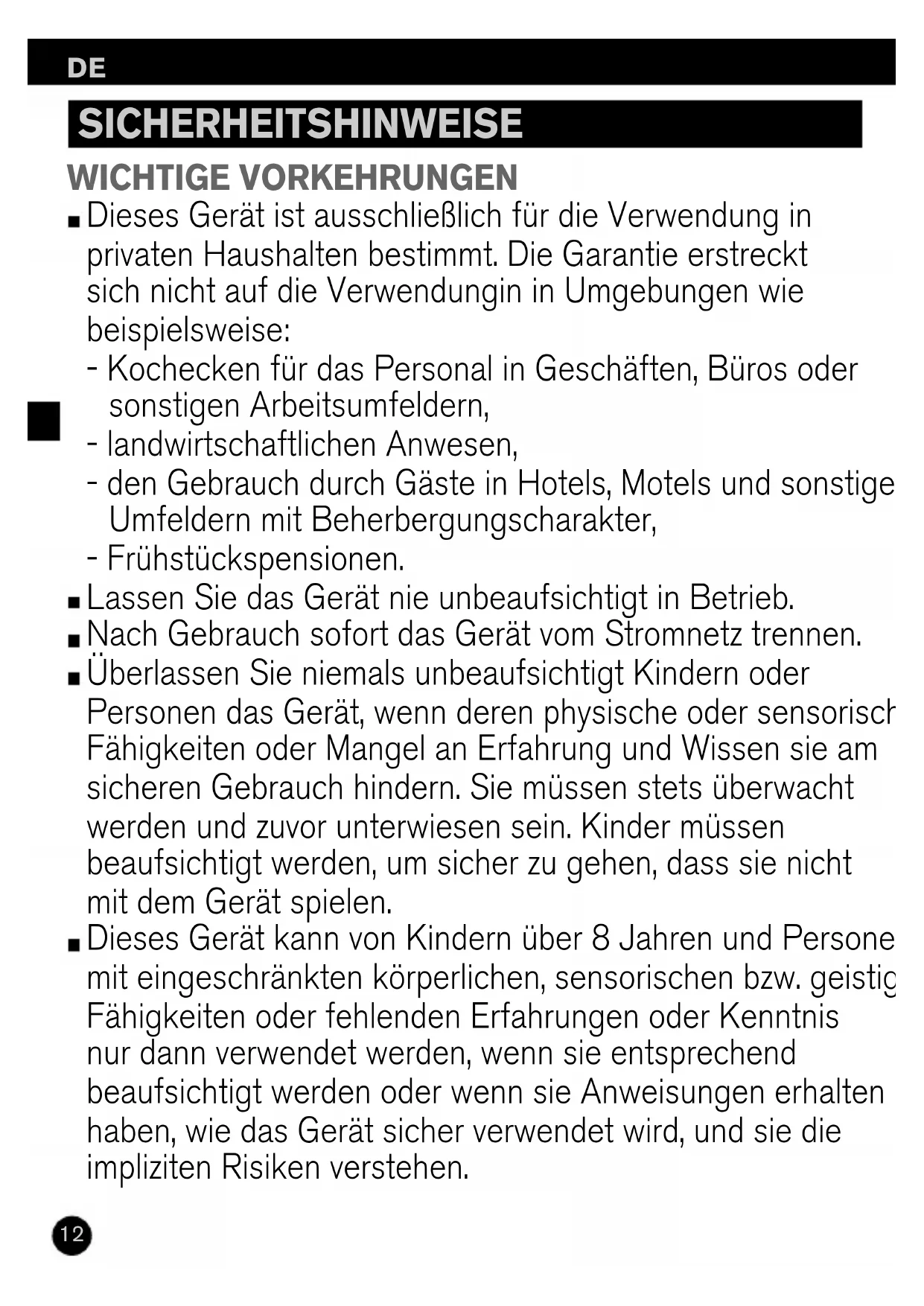 Achtung: Die mitgelieferte Bürste kann schmelzen, wenn sie auf dem heißen Grill benutzt wird. Der mitgelieferte Schaber kann schmelzen, wenn er auf der heißen Grillplatte benutzt wird - Fig 5. Der abnehmbare Spritzschutz - A, sowie der Auffangbehälter - D sind spülmaschinenfest. Nachdem die Rückstände mit Hilfe der mitgelieferten Bürste oder des Schabers in die Reini- gungsrinne geschoben wurden, können das Kochfeld und das Gerätegehäuse mit einem Schwamm, heißem Wasser und Reinigungsmittel gereinigt werden - Fig 5. Verwenden Sie keine Backofenreiniger oder Reinigungsmittel, die Chlor oder Bleichwasser enthalten. Verwenden Sie keine Scheuerpads. Verwenden Sie keine Metallschwämme und kein Scheuerpulver. Das Gerät darf nicht in der Geschirrspülmaschine gereinigt werden. Reinigung des äußeren Gehäuses des Grills/des Planchas: - Polieren Sie das Gehäuse gegebenenfalls mit einem handelsüblichen Edelstahlreinigungs- mittel. - Vergewissern Sie sich, dass diese Produkte für Gargeräte geeignet sind und halten Sie sich an die Anweisungen; wischen Sie das Gehäuse des Grills/des Planchas anschließend mit einem feuchten Schwamm ab. - Benutzen Sie für das äußere Gehäuse des Grills/des Planchas keine scheuernden Reini- gungsmittel und Schwämme, da dieses Schaden davontragen würden. Denken Sie an den Schutz der Umwelt! Ihr Gerät enthält wertvolle Rohstoffe, die wieder verwertet werden können. Geben Sie Ihr Gerät deshalb bitte bei einer Sammelstelle Ihrer Stadt oder Gemeinde ab. KRPS-GRILPLANCH-2100075680 19/02/13 11:40 Page17IT PRECAUZIONI IMPORTANTI Questo apparecchio è stato concepito per uso unicamente domestico. Non è stato ideato per essere utilizzato nei seguenti casi, che restano esclusi dalla garanzia: - in angoli cottura riservati al personale nei negozi, negli uffici e in altri ambienti professionali, - nelle fabbriche, - dai clienti di alberghi, motel e altre strutture ricettive residenziali, - in ambienti tipo camere per vacanze. Non utilizzare mai l’apparecchio senza sorvegliarlo. Questo apparecchio non dovrebbe essere utilizzato da persone (compresi i bambini) le cui capacità fisiche, sensoriali o mentali sono ridotte, o da persone prive di esperienza o di conoscenza, tranne se hanno potuto beneficiare, tramite una persona responsabile della loro sicurezza, di una supervisione o di istruzioni preliminari relative all’utilizzo dell’apparecchio. È opportuno sorvegliare i bambini per assicurarsi che non giochino con l’apparecchio. Questo apparecchio può essere utilizzato da bambini di almeno 8 anni e da persone le cui capacità fisiche, sensoriali o mentali sono ridotte, o da persone prive di esperienza o di conoscenza, posto che siano opportunamente sorvegliate, siano state loro impartite le istruzioni di sicurezza per l'utilizzo dell'apparecchio e siano consapevoli dei rischi. Evitare che i bambini giochino con l'apparecchio. La pulizia e la manutenzione ordinaria non possono essere eseguite da bambini senza sorveglianza.