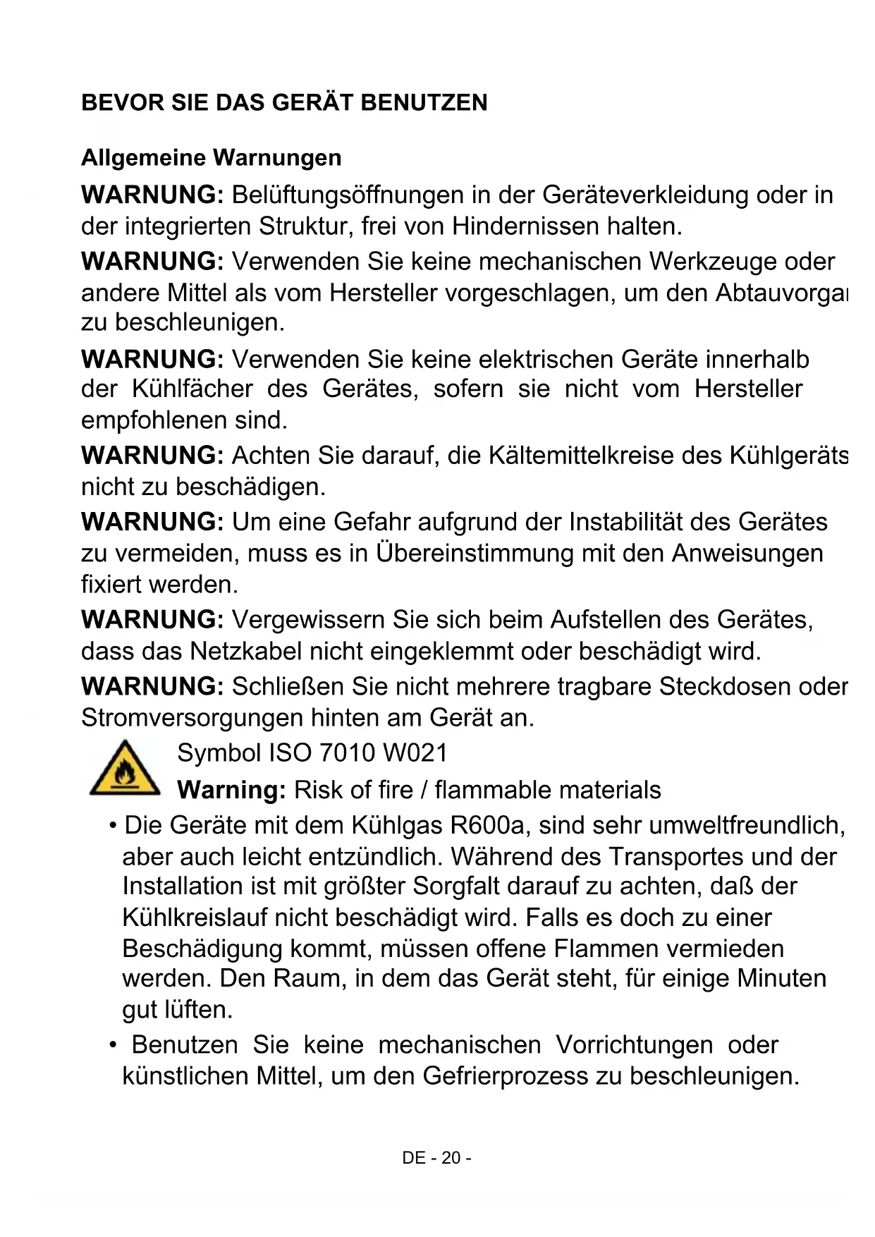 Allgemeine Warnungen WARNUNG: Belüftungsöffnungen in der Geräteverkleidung oder in der integrierten Struktur, frei von Hindernissen halten. WARNUNG: Verwenden Sie keine mechanischen Werkzeuge oder andere Mittel als vom Hersteller vorgeschlagen, um den Abtauvorgang zu beschleunigen. WARNUNG: Verwenden Sie keine elektrischen Geräte innerhalb der Kühlfächer des Gerätes, sofern sie nicht vom Hersteller empfohlenen sind. WARNUNG: Achten Sie darauf, die Kältemittelkreise des Kühlgeräts nicht zu beschädigen. WARNUNG: Um eine Gefahr aufgrund der Instabilität des Gerätes zu vermeiden, muss es in Übereinstimmung mit den Anweisungen fixiert werden. WARNUNG: Vergewissern Sie sich beim Aufstellen des Gerätes, dass das Netzkabel nicht eingeklemmt oder beschädigt wird. WARNUNG: Schließen Sie nicht mehrere tragbare Steckdosen oder Stromversorgungen hinten am Gerät an. Symbol ISO 7010 W021