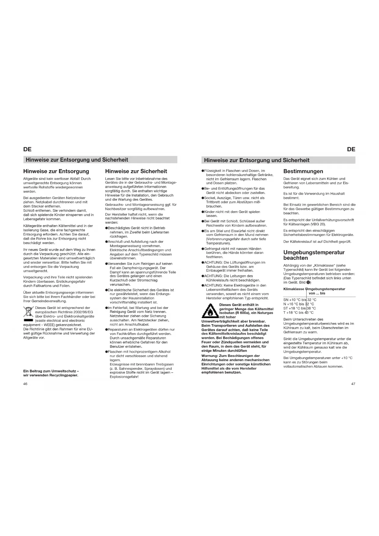 Klimaklasse Umgebungstemperatur von ... bis SN +10 °C bis 32 °C N +16 °C bis 32 °C ST +18 °C bis 38 °C T +18 °C bis 43 °C Beim Unterschreiten des Umgebungstemperaturbereiches wird es im Kühlraum zu kalt, beim Überschreiten im Gefrierraum zu warm. Sinkt die Umgebungstemperatur unter die eingestellte Temperatur im Kühlraum ab, wird der Kühlraum genauso kalt wie die Umgebungstemperatur. Bei Umgebungstemperaturen unter +10 °C kann es zu Störungen beim vollautomatischen Abtauen kommen. ● Flüssigkeit in Flaschen und Dosen, im besonderen kohlensäurehaltige Getränke, nicht im Gefrierraum lagern. Flaschen und Dosen platzen. ● Be- und Entlüftungsöffnungen für das Gerät nicht abdecken oder zustellen. ● Sockel, Auszüge, Türen usw. nicht als Trittbrett oder zum Abstützen miß- brauchen. ● Kinder nicht mit dem Gerät spielen lassen. ● Bei Gerät mit Schloß, Schlüssel außer Reichweite von Kindern aufbewahren. ● Eis am Stiel und Eiswürfel nicht direkt vom Gefrierraum in den Mund nehmen (Verbrennungsgefahr durch sehr tiefe Temperaturen). ● Gefriergut nicht mit nassen Händen berühren, die Hände könnten daran festfrieren. ● ACHTUNG: Die Lüftungsöffnungen im Gehäuse des Geräts bzw. am Einbaugerät immer freihalten. ● ACHTUNG: Die Leitungen des Kühlkreislaufs nicht beschädigen. ● ACHTUNG: Keine Elektrogeräte in den Lebensmittelfächern des Geräts verwenden, soweit es nicht einem vom Hersteller empfohlenen Typ entspricht. Dieses Gerät enthält in geringer Menge das Kältemittel Isobutan (R 600a), ein Naturgas mit hoher Umweltverträglichkeit aber brennbar. Beim Transportieren und Aufstellen des Gerätes darauf achten, daß keine Teile des Kältemittelkreislaufes beschädigt werden. Bei Bechädigungen offenes Feuer oder Zündquellen vermeiden und den Raum, in dem das Gerät steht, für einige Minuten durchlüften Warnung: Zum Beschleunigen der Abtauung keine anderen mechanischen Einrichtungen oder sonstige künstlichen Hilfsmittel als die vom Hersteller empfohlenen benutzen. Hinweise zur Entsorgung und Sicherheit