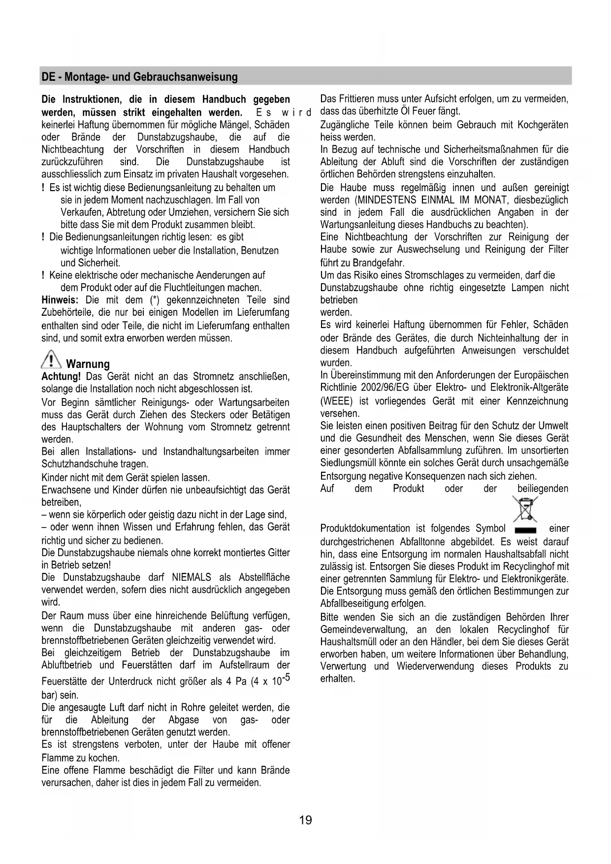 bar) sein. Die angesaugte Luft darf nicht in Rohre geleitet werden, die für die Ableitung der Abgase von gas- oder brennstoffbetriebenen Geräten genutzt werden. Es ist strengstens verboten, unter der Haube mit offener Flamme zu kochen. Eine offene Flamme beschädigt die Filter und kann Brände verursachen, daher ist dies in jedem Fall zu vermeiden. Das Frittieren muss unter Aufsicht erfolgen, um zu vermeiden, dass das überhitzte Öl Feuer fängt. Zugängliche Teile können beim Gebrauch mit Kochgeräten heiss werden. In Bezug auf technische und Sicherheitsmaßnahmen für die Ableitung der Abluft sind die Vorschriften der zuständigen örtlichen Behörden strengstens einzuhalten. Die Haube muss regelmäßig innen und außen gereinigt werden (MINDESTENS EINMAL IM MONAT, diesbezüglich sind in jedem Fall die ausdrücklichen Angaben in der Wartungsanleitung dieses Handbuchs zu beachten). Eine Nichtbeachtung der Vorschriften zur Reinigung der Haube sowie zur Auswechselung und Reinigung der Filter führt zu Brandgefahr. Um das Risiko eines Stromschlages zu vermeiden, darf die Dunstabzugshaube ohne richtig eingesetzte Lampen nicht betrieben werden. Es wird keinerlei Haftung übernommen für Fehler, Schäden oder Brände des Gerätes, die durch Nichteinhaltung der in diesem Handbuch aufgeführten Anweisungen verschuldet wurden. In Übereinstimmung mit den Anforderungen der Europäischen Richtlinie 2002/96/EG über Elektro- und Elektronik-Altgeräte (WEEE) ist vorliegendes Gerät mit einer Kennzeichnung versehen. Sie leisten einen positiven Beitrag für den Schutz der Umwelt und die Gesundheit des Menschen, wenn Sie dieses Gerät einer gesonderten Abfallsammlung zuführen. Im unsortierten Siedlungsmüll könnte ein solches Gerät durch unsachgemäße Entsorgung negative Konsequenzen nach sich ziehen. Auf dem Produkt oder der beiliegenden Produktdokumentation ist folgendes Symbol einer durchgestrichenen Abfalltonne abgebildet. Es weist darauf hin, dass eine Entsorgung im normalen Haushaltsabfall nicht zulässig ist. Entsorgen Sie dieses Produkt im Recyclinghof mit einer getrennten Sammlung für Elektro- und Elektronikgeräte. Die Entsorgung muss gemäß den örtlichen Bestimmungen zur Abfallbeseitigung erfolgen. Bitte wenden Sie sich an die zuständigen Behörden Ihrer Gemeindeverwaltung, an den lokalen Recyclinghof für Haushaltsmüll oder an den Händler, bei dem Sie dieses Gerät erworben haben, um weitere Informationen über Behandlung, Verwertung und Wiederverwendung dieses Produkts zu erhalten.20 Betriebsart Die Haube kann sowohl als Abluftgërat als auch als Umluftgërat eingesetzt werden. Abluftbetrieb Die Haube verfügt über einen oberen Luftaustritt B zum Ableiten der Küchengerüche nach außen (Abluftrohr und Rohrschellen werden nicht geliefert). Bild 1 Umluftbetrieb Für den Fall, dass es nicht möglich sein sollte, die Kochdämpfe und Gerüche nach Außen zu leiten, kann die Dunstabzugshaube mit Umluftbetrieb in Gebrauch genommen werden, indem ein oder zwei Aktivkohlefilter eingesetzt werden (*). Die Kochdämpfe und Gerüche werden in die Küche zurückgeleitet. Bild 2 Modelle ohne Saugmotor funktionieren nur mit Abluftbetrieb und müssen an eine externe Saugeinheit (nicht im Lieferumfang enthalten) angeschlossen werden. Die Anschlussanleitungen liegen der externe Saugeinheit bei. Befestigung Bild 3-4-5-6-7-8-9-10 Der Abstand zwischen der Abstellfläche auf dem Kochfeld und der Unterseite der Dunstabzugshaube darf 50cm im Fall von elektrischen Kochfeldern und 65cm im Fall von Gas- oder kombinierten Herden nicht unterschreiten. Wenn die Installationsanweisungen des Gaskochgeräts einen größeren Abstand vorgeben, ist dieser zu berücksichtigen. Elektrischer Anschluss Die Netzspannung muss der Spannung entsprechen, die auf dem Betriebsdatenschild im Innern der Haube angegeben ist. Sofern die Haube einen Netzstecker hat, ist dieser an zugänglicher Stelle an eine den geltenden Vorschriften entsprechende Steckdose auch nach der Montage anzuschließen. Bei einer Haube ohne Stecker (direkter Netzanschluss) oder falls der Stecker nicht zugänglich ist, ist ein normgerechter zweipoliger Schalter auch nach der Montage anzubringen, der unter Umständen der Überspannung Kategorie III entsprechend den Installationsregeln ein vollständiges Trennen vom Netz garantiert. Hinweis! Vor der Inbetriebnahme muss sichergestellt sein, dass die Netzversorgung (Steckdose) ordnungsgemäß montiert wurde. Montage Die Abzugshaube ist mit Dübeln ausgestattet, die für die meisten Wände/Decken geeignet sind. Trotzdem sollte ein qualifizierter Techniker hinzugezogen werden, der entscheidet, ob die Materialien für die jeweilige Wand/Decke geeignet sind. Außerdem muß die Wand/Decke das Gewicht der Abzugshaube tragen muss.