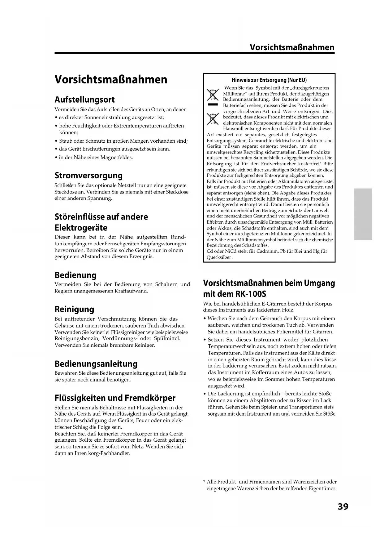 BEDIENUNGSANLEITUNG RK100S KORG