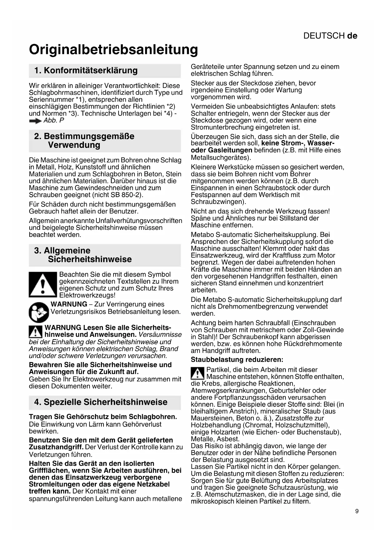 bb. P Die Maschine ist geeignet zum Bohren ohne Schlag in Metall, Holz, Kunststoff und ähnlichen Materialien und zum Schlagbohren in Beton, Stein und ähnlichen Materialien. Darüber hinaus ist die Maschine zum Gewindeschneiden und zum Schrauben geeignet (nicht SB 850-2). Für Schäden durch nicht bestimmungsgemäßen Gebrauch haftet allein der Benutzer. Allgemein anerkannte Unfallverhütungsvorschriften und beigelegte Sicherheitshinweise müssen beachtet werden. Beachten Sie die mit diesem Symbol gekennzeichneten Textstellen zu Ihrem eigenen Schutz und zum Schutz Ihres Elektrowerkzeugs! WARNUNG – Zur Verringerung eines Verletzungsrisikos Betriebsanleitung lesen. WARNUNG Lesen Sie alle Sicherheits- hinweise und Anweisungen. Versäumnisse bei der Einhaltung der Sicherheitshinweise und Anweisungen können elektrischen Schlag, Brand und/oder schwere Verletzungen verursachen. Bewahren Sie alle Sicherheitshinweise und Anweisungen für die Zukunft auf. Geben Sie Ihr Elektrowerkzeug nur zusammen mit diesen Dokumenten weiter. Tragen Sie Gehörschutz beim Schlagbohren. Die Einwirkung von Lärm kann Gehörverlust bewirken. Benutzen Sie den mit dem Gerät gelieferten Zusatzhandgriff. Der Verlust der Kontrolle kann zu Verletzungen führen. Halten Sie das Gerät an den isolierten Griffflächen, wenn Sie Arbeiten ausführen, bei denen das Einsatzwerkzeug verborgene Stromleitungen oder das eigene Netzkabel treffen kann. Der Kontakt mit einer spannungsführenden Leitung kann auch metallene Geräteteile unter Spannung setzen und zu einem elektrischen Schlag führen. Stecker aus der Steckdose ziehen, bevor irgendeine Einstellung oder Wartung vorgenommen wird. Vermeiden Sie unbeabsichtigtes Anlaufen: stets Schalter entriegeln, wenn der Stecker aus der Steckdose gezogen wird, oder wenn eine Stromunterbrechung eingetreten ist. Überzeugen Sie sich, dass sich an der Stelle, die bearbeitet werden soll, keine Strom-, Wasser- oder Gasleitungen befinden (z.B. mit Hilfe eines Metallsuchgerätes). Kleinere Werkstücke müssen so gesichert werden, dass sie beim Bohren nicht vom Bohrer mitgenommen werden können (z.B. durch Einspannen in einen Schraubstock oder durch Festspannen auf dem Werktisch mit Schraubzwingen). Nicht an das sich drehende Werkzeug fassen! Späne und Ähnliches nur bei Stillstand der Maschine entfernen. Metabo S-automatic Sicherheitskupplung. Bei Ansprechen der Sicherheitskupplung sofort die Maschine ausschalten! Klemmt oder hakt das Einsatzwerkzeug, wird der Kraftfluss zum Motor begrenzt. Wegen der dabei auftretenden hohen Kräfte die Maschine immer mit beiden Händen an den vorgesehenen Handgriffen festhalten, einen sicheren Stand einnehmen und konzentriert arbeiten. Die Metabo S-automatic Sicherheitskupplung darf nicht als Drehmomentbegrenzung verwendet werden. Achtung beim harten Schraubfall (Einschrauben von Schrauben mit metrischem oder Zoll-Gewinde in Stahl)! Der Schraubenkopf kann abgerissen werden, bzw. es können hohe Rückdrehmomente am Handgriff auftreten. Staubbelastung reduzieren: Partikel, die beim Arbeiten mit dieser Maschine entstehen, können Stoffe enthalten, die Krebs, allergische Reaktionen, Atemwegserkrankungen, Geburtsfehler oder andere Fortpflanzungsschäden verursachen können. Einige Beispiele dieser Stoffe sind: Blei (in bleihaltigem Anstrich), mineralischer Staub (aus Mauersteinen, Beton o. ä.), Zusatzstoffe zur Holzbehandlung (Chromat, Holzschutzmittel), einige Holzarten (wie Eichen- oder Buchenstaub), Metalle, Asbest. Das Risiko ist abhängig davon, wie lange der Benutzer oder in der Nähe befindliche Personen der Belastung ausgesetzt sind. Lassen Sie Partikel nicht in den Körper gelangen. Um die Belastung mit diesen Stoffen zu reduzieren: Sorgen Sie für gute Belüftung des Arbeitsplatzes und tragen Sie geeignete Schutzausrüstung, wie z.B. Atemschutzmasken, die in der Lage sind, die mikroskopisch kleinen Partikel zu filtern.