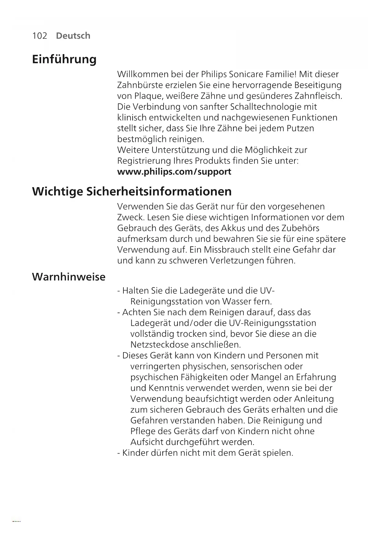 Deutsch Einführung Willkommen bei der Philips Sonicare Familie! Mit dieser Zahnbürste erzielen Sie eine hervorragende Beseitigung von Plaque, weißere Zähne und gesünderes Zahnfleisch. Die Verbindung von sanfter Schalltechnologie mit klinisch entwickelten und nachgewiesenen Funktionen stellt sicher, dass Sie Ihre Zähne bei jedem Putzen bestmöglich reinigen. Weitere Unterstützung und die Möglichkeit zur Registrierung Ihres Produkts finden Sie unter: www.philips.com/support Wichtige Sicherheitsinformationen Verwenden Sie das Gerät nur für den vorgesehenen Zweck. Lesen Sie diese wichtigen Informationen vor dem Gebrauch des Geräts, des Akkus und des Zubehörs aufmerksam durch und bewahren Sie sie für eine spätere Verwendung auf. Ein Missbrauch stellt eine Gefahr dar und kann zu schweren Verletzungen führen. Warnhinweise - Halten Sie die Ladegeräte und die UV- Reinigungsstation von Wasser fern. - Achten Sie nach dem Reinigen darauf, dass das Ladegerät und/oder die UV-Reinigungsstation vollständig trocken sind, bevor Sie diese an die Netzsteckdose anschließen. - Dieses Gerät kann von Kindern und Personen mit verringerten physischen, sensorischen oder psychischen Fähigkeiten oder Mangel an Erfahrung und Kenntnis verwendet werden, wenn sie bei der Verwendung beaufsichtigt werden oder Anleitung zum sicheren Gebrauch des Geräts erhalten und die Gefahren verstanden haben. Die Reinigung und Pflege des Geräts darf von Kindern nicht ohne Aufsicht durchgeführt werden. - Kinder dürfen nicht mit dem Gerät spielen.103 Deutsch - Verwenden Sie nur Original-Zubehörteile oder - Verbrauchsmaterialien von Philips. Verwenden Sie nur das Ladegerät, das im Lieferumfang des Produkts enthalten ist. Falls vorhanden, verwenden Sie nur das Original-USB-Kabel und -Netzteil. - Dieses Gerät enthält keine Teile, die vom Benutzer repariert werden können. Wenn das Gerät beschädigt ist, verwenden Sie es nicht mehr, und wenden Sie sich bitte an das Service‑Center in Ihrem Land. Nur für Geräte mit Kabel: Wenn das Kabel beschädigt ist, ersetzen Sie das Ladegerät mit Reinigungsstation durch ein neues. - Verwenden Sie das Ladegerät und/oder die UV- Reinigungsstation nie im Freien oder in der Nähe von heißen Oberflächen. - Die Produktteile dürfen nicht in der Spülmaschine gereinigt werden. - Dieses Gerät ist ausschließlich zum Reinigen von Zähnen, Zahnfleisch und Zunge gedacht. - Bewahren Sie die Reinigungsstation immer außerhalb der Reichweite von Kindern auf. - Verwenden Sie die Reinigungsstation nicht mehr, wenn die UV-Lampe bei geöffneter Klappe weiterhin leuchtet. UV-Licht kann für das menschliche Auge und die Haut schädlich sein. - Bedienen Sie die Reinigungsstation nur mit Schutzscheibe. - Berühren Sie die UV-Lampe der UV-Reinigungsstation nicht, wenn sie heiß ist. - Unterlassen Sie es, einen Bürstenkopf mit abgeknickten oder zerdrückten Borsten zu verwenden. Ersetzen Sie den Bürstenkopf alle 3Monate oder früher, falls Anzeichen von Abnutzung auftreten. - Vermeiden Sie direkten Kontakt mit Produkten, die ätherische Öle oder Kokosnussöl enthalten. Der Kontakt kann zum Lösen von Borsten führen.104 Deutsch - Verwenden Sie das Gerät nicht mehr, und konsultieren Sie Ihren Zahnarzt/Arzt, wenn übermäßiges Zahnfleischbluten auftritt oder Zahnfleischbluten länger als eine Woche anhält oder wenn Sie beim Gebrauch Unbehagen oder Schmerzen verspüren. - Wenn in den vergangenen 2Monaten ein chirurgischer Eingriff an Ihren Zähnen oder am Zahnfleisch vorgenommen wurde, sollten Sie vor Benutzung des Geräts Ihren Zahnarzt konsultieren. - Wenden Sie sich als Träger eines Herzschrittmachers oder eines anderen Implantats vor der Verwendung dieses Geräts an Ihren Arzt oder den Hersteller des implantierten Gerätes. - Sollten Sie Bedenken wegen Ihrer Gesundheit haben, konsultieren Sie vor Benutzung dieses Geräts Ihren Arzt. - Dieses Gerät ist ein Gerät zur individuellen Mundpflege und nicht für die Verwendung durch mehrere Patienten in einer Zahnarztpraxis oder Zahnklinik geeignet. Batterie-Sicherheitsanweisungen - Dieses Gerät verwendet Batterien, die nur von fachkundigen Personen entfernt werden dürfen. - Verwenden Sie das Gerät nur für den vorgesehenen Zweck. Lesen Sie diese Informationen vor dem Gebrauch des Geräts, des Akkus und des Zubehörs aufmerksam durch und bewahren Sie sie für eine spätere Verwendung auf. Ein Missbrauch stellt eine Gefahr dar und kann zu schweren Verletzungen führen. Das mitgelieferte Zubehör kann für verschiedene Produkte variieren. - Verwenden Sie nur Original-Zubehörteile und - Verbrauchsmaterialien von Philips. Verwenden Sie nur das abnehmbare Netzteil TCBxxxx, HX6100, HX6110, HX6160 oder WAAxxxx. - Halten Sie das Produkt und die Akkus von Feuer fern und setzen Sie sie keinem direkten Sonnenlicht oder hohen Temperaturen aus.105 Deutsch - Wenn das Produkt ungewöhnlich heiß wird, einen ungewöhnlichen Geruch entwickelt, die Farbe ändert oder wenn das Laden viel länger dauert als üblich, beenden Sie die Verwendung und das Laden des Produkts und wenden Sie sich an Philips. - Legen Sie die Produkte und die Batterien nicht in Mikrowellen oder auf Induktionsherde. - Um die Aufheizung oder die Freisetzung giftiger oder gefährlicher Substanzen aus den Akkus zu verhindern, sollten Sie das Produkt oder die Akkus nicht öffnen, modifizieren, durchbohren, beschädigen oder zerlegen. Überladen Sie die Akkus nicht, verursachen Sie keinen Kurzschluss und laden Sie sie nicht umgekehrt auf. - Dieses Gerät verwendet Akkus, die nicht austauschbar sind. Wenn der Akku das Ende seiner Lebenszeit erreicht hat, muss das Gerät ordnungsgemäß entsorgt werden (siehe Abschnitt zum Recycling). - Wenn Batterien beschädigt oder undicht sind, vermeiden Sie den Kontakt mit der Haut oder dem Auge. Wenn dies der Fall ist, spülen Sie die entsprechende Stelle sofort gründlich mit Wasser. Suchen Sie medizinische Hilfe. - Achten Sie beim Umgang mit Batter