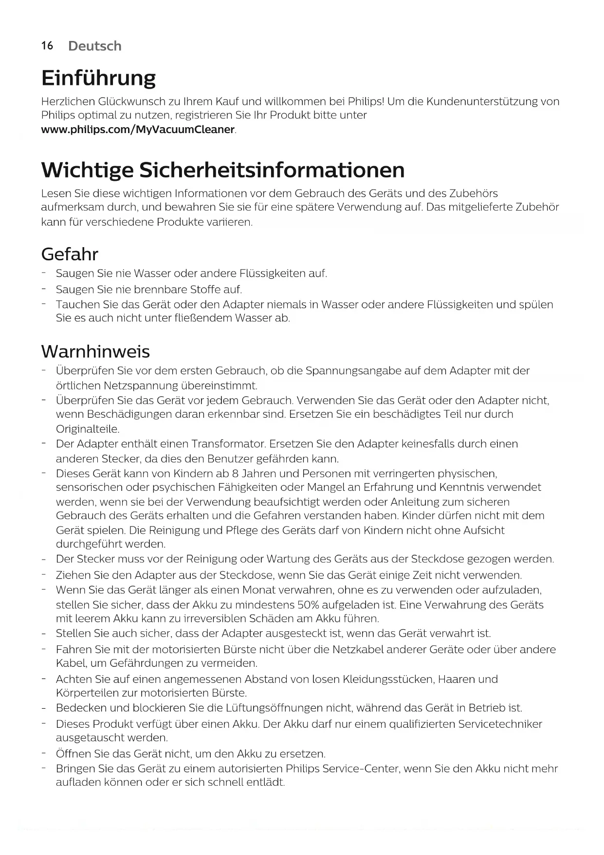 Deutsch Einführung Herzlichen Glückwunsch zu Ihrem Kauf und willkommen bei Philips! Um die Kundenunterstützung von Philips optimal zu nutzen, registrieren Sie Ihr Produkt bitte unter www.philips.com/MyVacuumCleaner. Wichtige Sicherheitsinformationen Lesen Sie diese wichtigen Informationen vor dem Gebrauch des Geräts und des Zubehörs aufmerksam durch, und bewahren Sie sie für eine spätere Verwendung auf. Das mitgelieferte Zubehör kann für verschiedene Produkte variieren. Gefahr