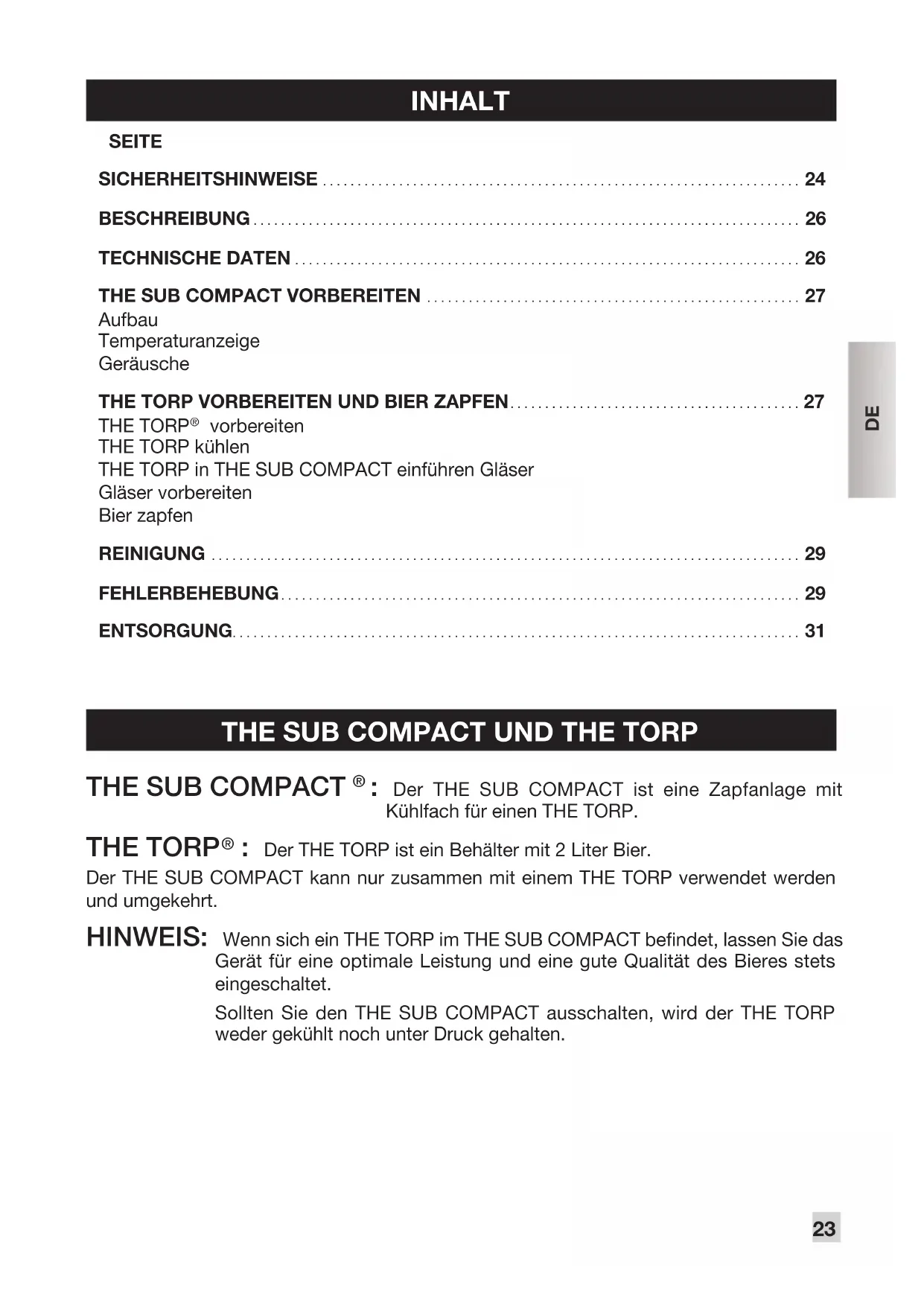 : Der THE TORP ist ein Behälter mit 2 Liter Bier. Der THE SUB COMPACT kann nur zusammen mit einem THE TORP verwendet werden und umgekehrt. HINWEIS: Wenn sich ein THE TORP im THE SUB COMPACT bendet, lassen Sie das Gerät für eine optimale Leistung und eine gute Qualität des Bieres stets eingeschaltet. Sollten Sie den THE SUB COMPACT ausschalten, wird der THE TORP weder gekühlt noch unter Druck gehalten.24 SICHERHEITSHINWEISE