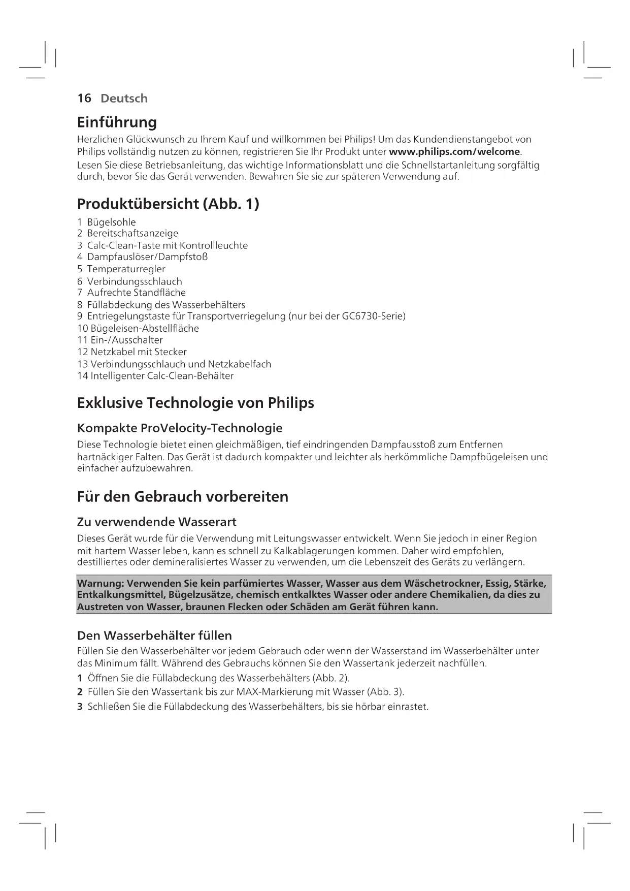 1 Bügelsohle 2 Bereitschaftsanzeige 3 Calc-Clean-Taste mit Kontrollleuchte 4 Dampfauslöser/Dampfstoß 5 Temperaturregler 6 Verbindungsschlauch 7 Aufrechte Standäche 8 Füllabdeckung des Wasserbehälters 9 Entriegelungstaste für Transportverriegelung )nur bei der GC6730-Serie( 10 Bügeleisen-Abstelläche 11 Ein-/Ausschalter 12 Netzkabel mit Stecker 13 Verbindungsschlauch und Netzkabelfach 14 Intelligenter Calc-Clean-Behälter Exklusive Technologie von Philips Kompakte ProVelocity-Technologie Diese Technologie bietet einen gleichmäßigen, tief eindringenden Dampfausstoß zum Entfernen hartnäckiger Falten. DasGerät ist dadurch kompakter und leichter als herkömmliche Dampfbügeleisen und einfacher aufzubewahren. Für den Gebrauch vorbereiten Zu verwendende Wasserart Dieses Gerät wurde für die Verwendung mit Leitungswasser entwickelt. Wenn Sie jedoch in einer Region mit hartem Wasser leben, kann es schnell zu Kalkablagerungen kommen. Daher wird empfohlen, destilliertes oder demineralisiertes Wasser zu verwenden, um die Lebenszeit des Geräts zu verlängern. Warnung: Verwenden Sie kein parfümiertes Wasser, Wasser aus dem Wäschetrockner, Essig, Stärke, Entkalkungsmittel, Bügelzusätze, chemisch entkalktes Wasser oder andere Chemikalien, da dies zu Austreten von Wasser, braunen Flecken oder Schäden am Gerät führen kann. Den Wasserbehälter füllen Füllen Sie den Wasserbehälter vor jedem Gebrauch oder wenn der Wasserstand im Wasserbehälter unter das Minimum fällt. Während des Gebrauchs können Sie den Wassertank jederzeit nachfüllen. 1 Önen Sie die Füllabdeckung des Wasserbehälters )Abb. 2(. 2 Füllen Sie den Wassertank bis zur MAX-Markierung mit Wasser )Abb. 3(. 3 Schließen Sie die Füllabdeckung des Wasserbehälters, bis sie hörbar einrastet.17 Deutsch Verwendung des Geräts Rund ums Bügeln Temperatureinstellung Automatische Dampfeinstellung Gewebeart SYNTH auf Synthetikfasern )z.B. Azetat, Acryl, Nylon, Viskose, Polyamid, Polyester(