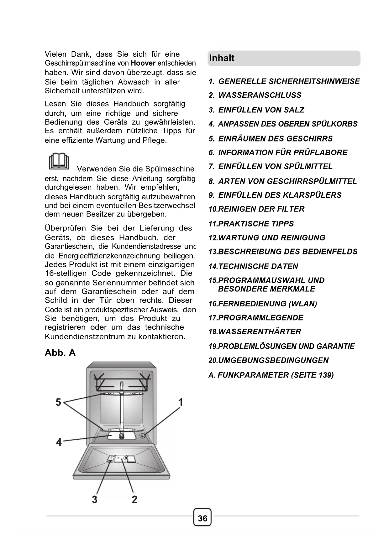 Vielen Dank, dass Sie sich für eine Geschirrspülmaschine von Hoover entschieden haben. Wir sind davon überzeugt, dass sie Sie beim täglichen Abwasch in aller Sicherheit unterstützen wird. Lesen Sie dieses Handbuch sorgfältig durch, um eine richtige und sichere Bedienung des Geräts zu gewährleisten. Es enthält außerdem nützliche Tipps für eine effiziente Wartung und Pflege.