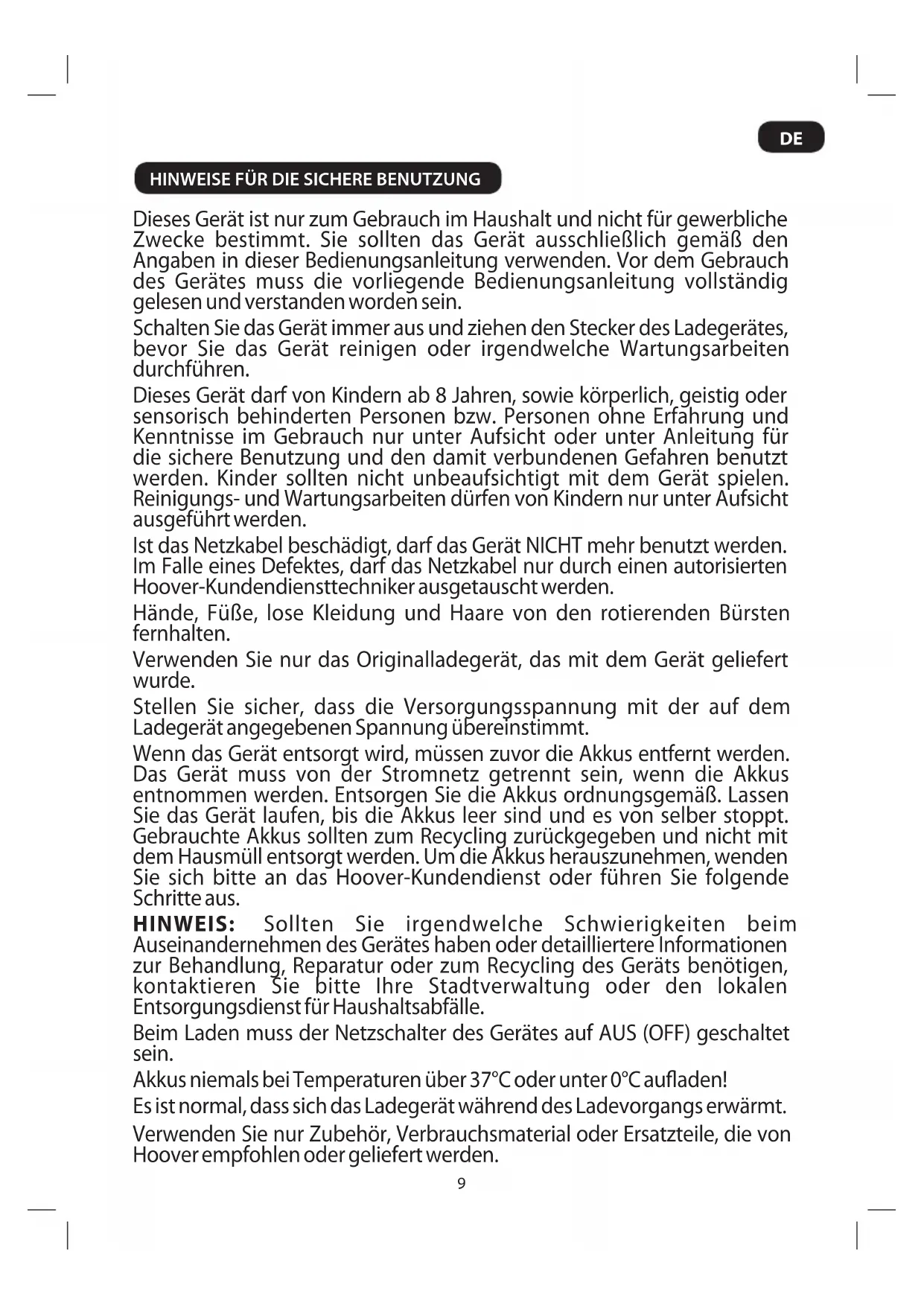Aus Sicherheitsgründen dürfen die Lithium-Ionen-Akkus dieses Staubsaugers nur von einem Techniker des Hoover-Kundendienstes ausgetauscht werden. Wenden Sie sich, wenn sich die Batterien nicht mehr aufladen lassen, bitte an den Hoover-Kundendienst, um einen Austausch zu veranlassen.
