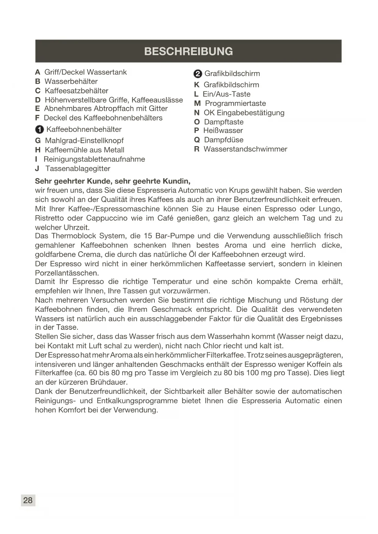 The appliance is working but no liquid is coming out. Check that the water container is in the correct position and that the cord is not jammed between the appliance itself and the water container. Coffee grains have found their way into the drip tray. This happens if coffee grains fall outside the percolation tank; this keeps the machine clean. Here are some recipes you can make using your Espresseria Automatic: Cappuccino For a cappuccino in the rules of the art, the ideal proportions are as follows: 1/3 hot milk, 1/3 coffee, 1/3 milk froth. Caffe Latte To make coffee with milk, also often called Latte Macchiato, the proportions are as follows: 3/5 hot milk, 1/5 coffee, 1/5 milk froth. – For these milk-based preparations, it is best to use cold skimmed milk straight from the refrigerator (ideally between 6 and 8° C). – To nish off, you can sprinkle with cocoa. Café Crème Prepare a conventional espresso in a large cup. Add a little cream to get a café crème. Café corretto* Prepare a cup of espresso as usual. Then add 1/4 or 1/2 of a liqueur glass of Cognac to taste. – You can also use anisette, brandy, Sambuca, Kirsch or Cointreau. – There are many other ways to give some punch to your espresso. – Just use your imagination. Coffee liqueur* Mix 3 cups of espresso, 250 g of brown sugar candy and 1/2 litre of Cognac or Kirsch in an empty 0.75 litre bottle. Leave the mixture to macerate for at least 2 weeks. – You will obtain a delicious liqueur. A real treat for coffee lovers. Italian style iced coffee 4 scoops of vanilla ice-cream, 2 cups of espresso with sugar to taste, 1/8 l milk, fresh cream, grated chocolate. – Mix the cold espresso with the milk. – Serve the scoops of ice-cream into the glasses, pour the coffee onto them and decorate with fresh cream and grated chocolate. Café à la frisonne* Add a small glass of rum to a cup of sweetened espresso. Decorate with a good layer of fresh cream and serve. Flambéed espresso* 2 cups of espresso, 2 small glasses of Cognac, 2 teaspoons of brown sugar, fresh cream. – Pour the Cognac into heat-resistant glasses, heat and light. – Add the sugar, mix, pour in the coffee and decorate with fresh cream. Espresso Parfait* 2 cups of espresso, 6 egg yolks, 200g sugar, 1/8 litre of sweetened fresh cream, 1 small glass of orange liqueur.27 ENGLISH – Beat the egg yolks with the sugar until it forms a thick, frothy mass. – Add the cold espresso and the orange liqueur. – Then mix in the whipped fresh cream. – Pour the mix into saucer champagne glasses or ordinary. – Put the champagne glasses in the freezer. (*: Remember, over-indulgence in alcohol is bad for the health.)28 Sehr geehrter Kunde, sehr geehrte Kundin, wir freuen uns, dass Sie diese Espresseria Automatic von Krups gewählt haben. Sie werden sich sowohl an der Qualität ihres Kaffees als auch an ihrer Benutzerfreundlichkeit erfreuen. Mit Ihrer Kaffee-/Espressomaschine können Sie zu Hause einen Espresso oder Lungo, Ristretto oder Cappuccino wie im Café genießen, ganz gleich an welchem Tag und zu welcher Uhrzeit. Das Thermoblock System, die 15 Bar-Pumpe und die Verwendung ausschließlich frisch gemahlener Kaffeebohnen schenken Ihnen bestes Aroma und eine herrlich dicke, goldfarbene Crema, die durch das natürliche Öl der Kaffeebohnen erzeugt wird. Der Espresso wird nicht in einer herkömmlichen Kaffeetasse serviert, sondern in kleinen Porzellantässchen. Damit Ihr Espresso die richtige Temperatur und eine schön kompakte Crema erhält, empfehlen wir Ihnen, Ihre Tassen gut vorzuwärmen. Nach mehreren Versuchen werden Sie bestimmt die richtige Mischung und Röstung der Kaffeebohnen nden, die Ihrem Geschmack entspricht. Die Qualität des verwendeten Wassers ist natürlich auch ein ausschlaggebender Faktor für die Qualität des Ergebnisses in der Tasse. Stellen Sie sicher, dass das Wasser frisch aus dem Wasserhahn kommt (Wasser neigt dazu, bei Kontakt mit Luft schal zu werden), nicht nach Chlor riecht und kalt ist. Der Espresso hat mehr Aroma als ein herkömmlicher Filterkaffee. Trotz seines ausgeprägteren, intensiveren und länger anhaltenden Geschmacks enthält der Espresso weniger Koffein als Filterkaffee (ca. 60 bis 80 mg pro Tasse im Vergleich zu 80 bis 100 mg pro Tasse). Dies liegt an der kürzeren Brühdauer. Dank der Benutzerfreundlichkeit, der Sichtbarkeit aller Behälter sowie der automatischen Reinigungs- und Entkalkungsprogramme bietet Ihnen die Espresseria Automatic einen hohen Komfort bei der Verwendung. BESCHREIBUNG A Griff/Deckel Wassertank B Wasserbehälter C Kaffeesatzbehälter D Höhenverstellbare Griffe, Kaffeeauslässe E Abnehmbares Abtropffach mit Gitter F Deckel des Kaffeebohnenbehälters