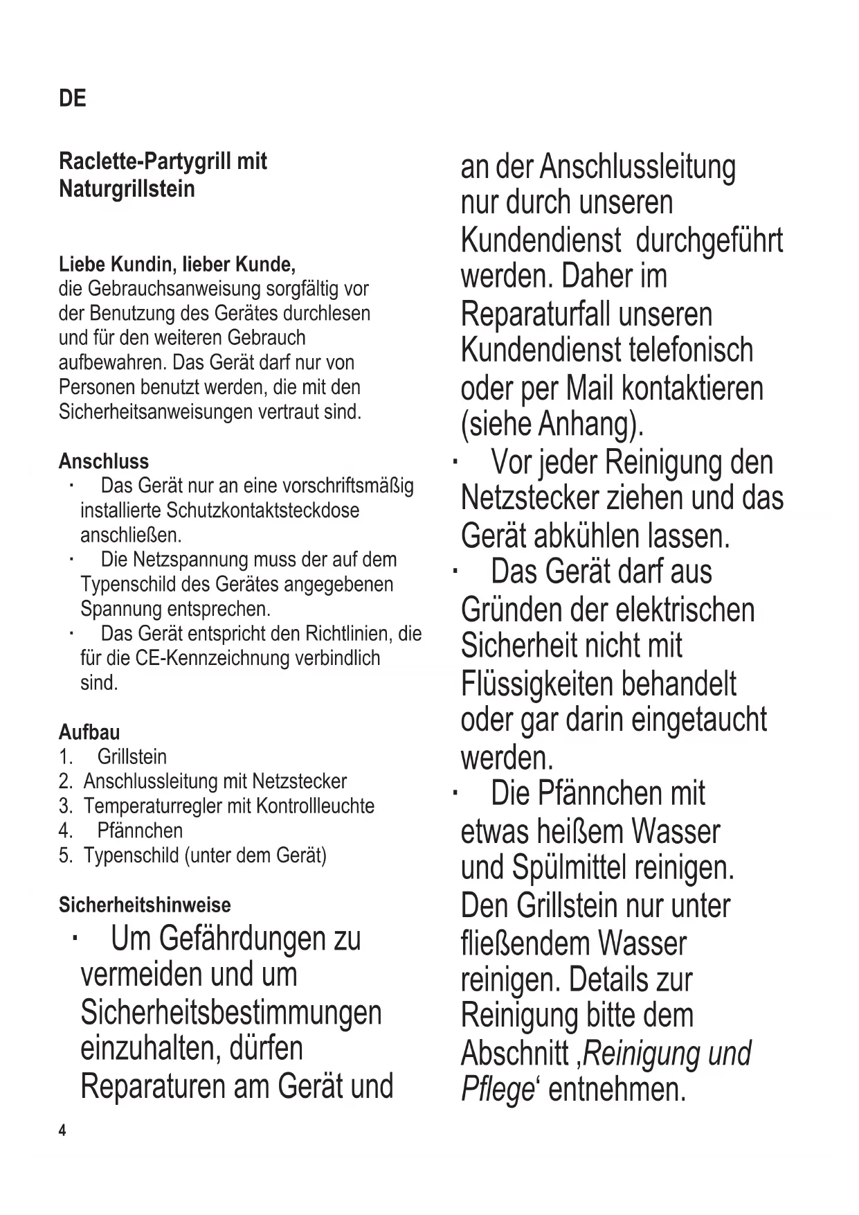 Sicherheitshinweise ∙ Um Gefährdungen zu vermeiden und um Sicherheitsbestimmungen einzuhalten, dürfen Reparaturen am Gerät und an der Anschlussleitung nur durch unseren Kundendienst durchgeführt werden. Daher im Reparaturfall unseren Kundendienst telefonisch oder per Mail kontaktieren (siehe Anhang). ∙ Vor jeder Reinigung den Netzstecker ziehen und das Gerät abkühlen lassen. ∙ Das Gerät darf aus Gründen der elektrischen Sicherheit nicht mit Flüssigkeiten behandelt oder gar darin eingetaucht werden. ∙ Die Pfännchen mit etwas heißem Wasser und Spülmittel reinigen. Den Grillstein nur unter ießendem Wasser reinigen. Details zur Reinigung bitte dem Abschnitt ‚Reinigung und Pege‘ entnehmen. DE104 x 142 mm