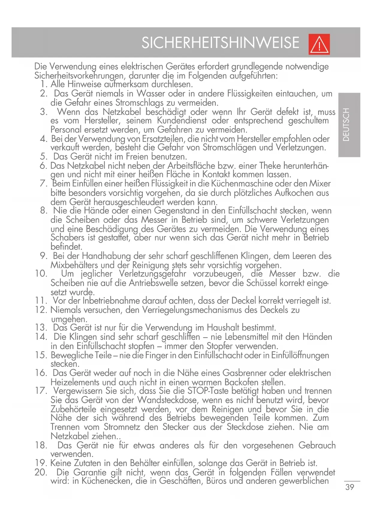 Beim Einfüllen einer heißen Flüssigkeit in die Küchenmaschine oder den Mixer bitte besonders vorsichtig vorgehen, da sie durch plötzliches Aufkochen aus dem Gerät herausgeschleudert werden kann.
