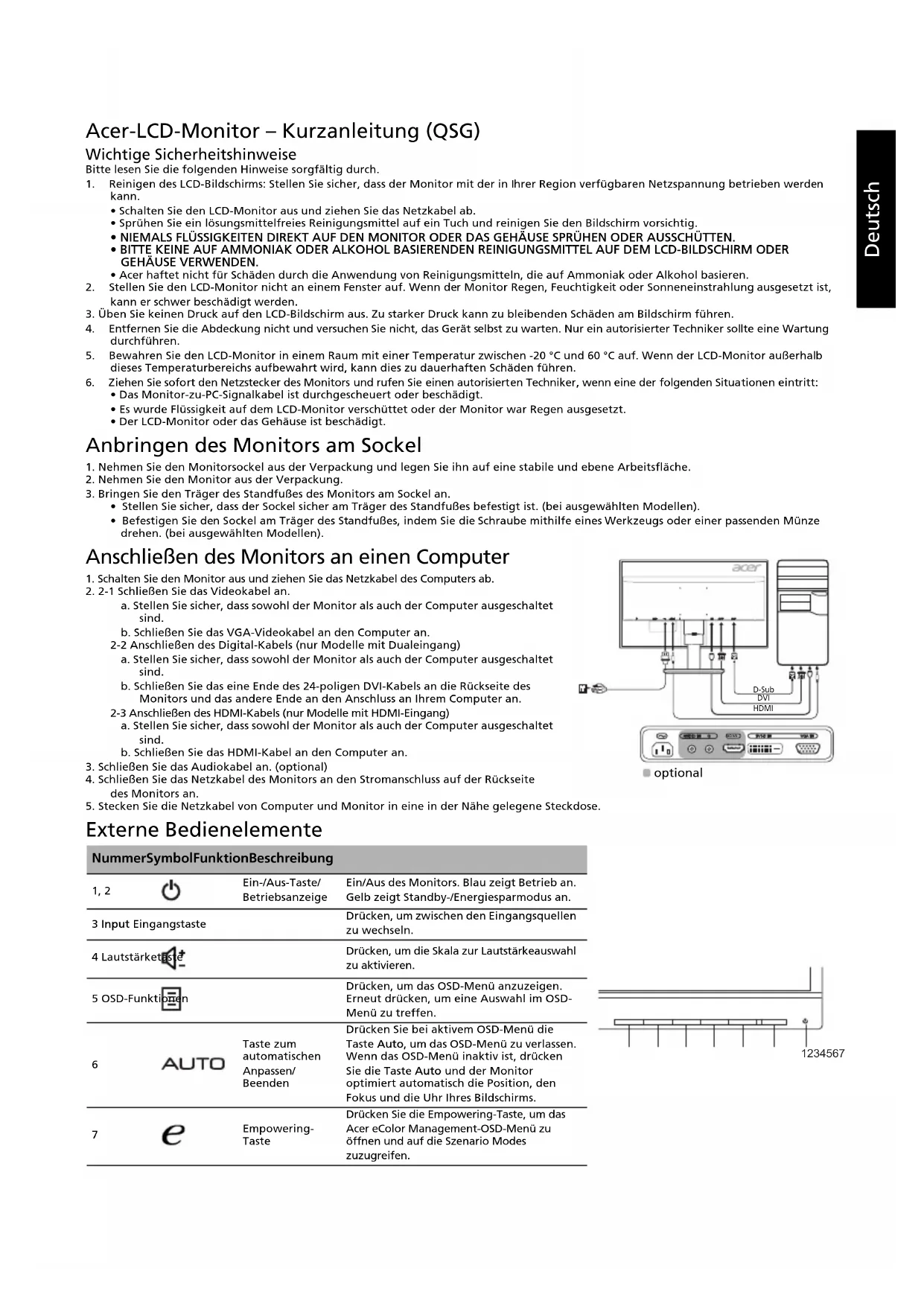 - Befestigen Sie den Sockel am Träger des Standfußes, indem Sie die Schraube mithilfe eines Werkzeugs oder einer passenden Münze drehen. (bei ausgewählten Modellen). Anschließen des Monitors an einen Computer 1. Schalten Sie den Monitor aus und ziehen Sie das Netzkabel des Computers ab.2. 2-1 Schließen Sie das Videokabel an.a. Stellen Sie sicher, dass sowohl der Monitor als auch der Computer ausgeschaltet sind.b. Schließen Sie das VGA-Videokabel an den Computer an. 2-2 Anschließen des Digital-Kabels (nur Modelle mit Dualeingang)a. Stellen Sie sicher, dass sowohl der Monitor als auch der Computer ausgeschaltet sind.b. Schließen Sie das eine Ende des 24-poligen DVI-Kabels an die Rückseite des Monitors und das andere Ende an den Anschluss an Ihrem Computer an.2-3 Anschließen des HDMI-Kabels (nur Modelle mit HDMI-Eingang)a. Stellen Sie sicher, dass sowohl der Monitor als auch der Computer ausgeschaltet sind.b. Schließen Sie das HDMI-Kabel an den Computer an.3. Schließen Sie das Audiokabel an. (optional)4. Schließen Sie das Netzkabel des Monitors an den Stromanschluss auf der Rückseite des Monitors an.5. Stecken Sie die Netzkabel von Computer und Monitor in eine in der Nähe gelegene Steckdose. Externe Bedienelemente Nummer Symbol Funktion Beschreibung 1, 2 Ein-/Aus-Taste/BetriebsanzeigeEin/Aus des Monitors. Blau zeigt Betrieb an. Gelb zeigt Standby-/Energiesparmodus an.3 Input EingangstasteDrücken, um zwischen den Eingangsquellen zu wechseln.4 LautstärketasteDrücken, um die Skala zur Lautstärkeauswahl zu aktivieren.5 OSD-FunktionenDrücken, um das OSD-Menü anzuzeigen. Erneut drücken, um eine Auswahl im OSD-Menü zu treffen. Taste zum automatischen Anpassen/BeendenDrücken Sie bei aktivem OSD-Menü die Taste Auto, um das OSD-Menü zu verlassen. Wenn das OSD-Menü inaktiv ist, drücken Sie die Taste Auto und der Monitor optimiert automatisch die Position, den Fokus und die Uhr Ihres Bildschirms. Empowering-TasteDrücken Sie die Empowering-Taste, um das Acer eColor Management-OSD-Menü zu öffnen und auf die Szenario Modes zuzugreifen. HDMI DVI D-SubHDMI optional 1234567Deutsch Vorschriften und Sicherheitshinweise FCC-Hinweis Dieses Gerät wurde getestet und erfüllt die Grenzwerte für ein digitales Gerät der Klasse B gemäß Teil 15 der FCC-Vorschriften. Diese Grenzwerte sollen einen angemessenen Schutz gegen Interferenzen bei der Installation in einem Wohngebiet bieten. Dieses Gerät erzeugt, verwendet und gibt möglicherweise Funkfrequenzenergie ab und kann, wenn es nicht gemäß den Anweisungen installiert und verwendet wird, Störungen des Funkverkehrs verursachen. Es gibt jedoch keine Garantie dafür, dass bei einer bestimmten Installation keine Störungen auftreten. Wenn dieses Gerät Störungen des Radio- oder Fernsehempfangs verursacht, was sich durch Aus- und Einschalten des Geräts feststellen lässt, kann der Benutzer versuchen, die Störungen durch eine oder mehrere der folgenden Maßnahmen zu beseitigen: Neuausrichtung oder Versetzen der Empfangsantenne Vergrößern des Abstands zwischen dem Gerät und dem Receiver Anschließen des Geräts an eine Steckdose eines anderen Stromkreises als den, an dem der Receiver angeschlossen ist Zu Rate ziehen des Händlers oder eines erfahrenen Radio-/Fernsehtechnikers CE-Konformitätserklärung Acer Inc. erklärt hiermit, dass dieser LCD-Monitor den grundlegenden Anforderungen und anderen relevanten Bestimmungen der EMV-Richtlinie 2014/30/EU, der Niederspannungsrichtlinie 2014/35/EU und der RoHS-Richtlinie 2011/65/EU sowie der Richtlinie 2009/125/EG zur Schaffung eines Rahmens für die Festlegung von Anforderungen an die umweltgerechte Gestaltung energieverbrauchsrelevanter Produkte entspricht. Hinweis: Heben Sie den Monitor nicht an der Unterseite an, um Schäden am Monitor zu vermeiden. Hinweis: Abgeschirmte Kabel Alle Verbindungen zu anderen Computing-Geräten müssen über abgeschirmte Kabel erfolgen, um die Einhaltung der EMV-Richtlinien sicherzustellen. Hinweis: Peripheriegeräte Nur Peripheriegeräte (Eingabe-/Ausgabegeräte, Terminals, Drucker usw.), die die Grenzwerte der Klasse B erfüllen, dürfen an dieses Gerät angeschlossen werden. Der Anschluss von Peripheriegeräten, die diese Grenzwerte nicht erfüllen, kann Störungen des Radio- und Fernsehempfangs hervorrufen. Vorsicht Änderungen oder Modifikationen, die nicht ausdrücklich durch den Hersteller genehmigt wurden, können dazu führen, dass die Betriebserlaubnis, die dem Benutzer von der Federal Communications Commission für dieses Produkt erteilt wurde, erlischt. Betriebsbedingungen Dieses Gerät entspricht Teil 15 der FCC-Vorschriften. Der Betrieb unterliegt folgenden zwei Bedingungen: (1) Dieses Gerät darf keine schädlichen Interferenzen verursachen und (2) dieses Gerät muss alle empfangenen Interferenzen annehmen, einschließlich Interferenzen, die zu einem unerwünschten Betrieb führen können. Hinweis: Benutzer in Kanada Dieses digitale Gerät der Klasse B entspricht der kanadischen Norm ICES-003. Remarque à l'intention des utilisateurs canadiens Cet appareil numérique de la classe B est conforme à la norme NMB-003 du Canada. Entsorgung von Elektrogeräten durch Benutzer in Privathaushalten in der EU Dieses Symbol auf dem Produkt oder seiner Verpackung weist darauf hin, dass dieses Produkt nicht über den normalen Hausmüll entsorgt werden darf. Es liegt in Ihrer Verantwortung, Ihre Altgeräte zur Entsorgung an einer Rücknahmestelle für das Recycling und die Entsorgung von elektrischen und elektronischen Geräten abzugeben. Die getrennte Sammlung und das Recycling von Altgeräten nach Ablauf der Lebensdauer tragen zur Erhaltung der natürlichen Ressourcen bei und garantieren eine Wiederverwertung, die die Gesundheit der Menschen und die Umwelt schont. Weitere Informationen dazu, wo sich Rücknahmestellen für Ihre Altgeräte befinden, erhalten Sie bei Ihrer Stadtverwaltung, den örtlichen Müllentsorgungsbetrieben oder im Geschäft, in d