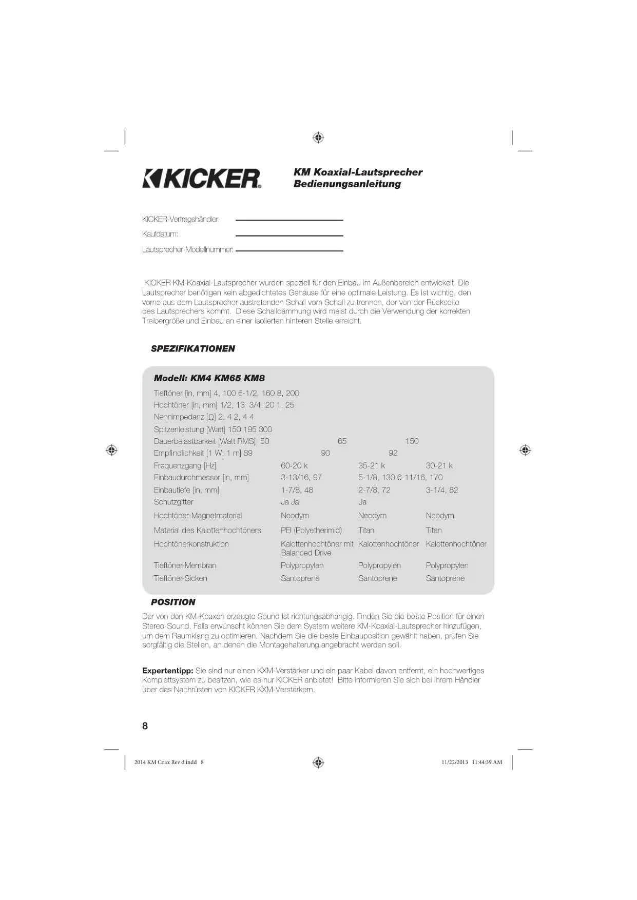Conexión a tierra +12V 2014 KM Coax Rev d.indd 72014 KM Coax Rev d.indd 7 11/22/2013 11:44:39 AM11/22/2013 11:44:39 AM8 KICKER KM-Koaxial-Lautsprecher wurden speziell für den Einbau im Außenbereich entwickelt. Die Lautsprecher benötigen kein abgedichtetes Gehäuse für eine optimale Leistung. Es ist wichtig, den vorne aus dem Lautsprecher austretenden Schall vom Schall zu trennen, der von der Rückseite des Lautsprechers kommt. Diese Schalldämmung wird meist durch die Verwendung der korrekten Treibergröße und Einbau an einer isolierten hinteren Stelle erreicht. SPEZIFIKATIONEN KICKER-Vertragshändler: Kaufdatum: Lautsprecher-Modellnummer: POSITION Der von den KM-Koaxen erzeugte Sound ist richtungsabhängig. Finden Sie die beste Position für einen Stereo-Sound. Falls erwünscht können Sie dem System weitere KM-Koaxial-Lautsprecher hinzufügen, um dem Raumklang zu optimieren. Nachdem Sie die beste Einbauposition gewählt haben, prüfen Sie sorgfältig die Stellen, an denen die Montagehalterung angebracht werden soll. Modell: KM4 KM65 KM8 Tieftöner [in, mm] 4, 100 6-1/2, 160 8, 200 Hochtöner [in, mm] 1/2, 13 3/4, 20 1, 25 Nennimpedanz [Ω] 2, 4 2, 4 4 Spitzenleistung [Watt] 150 195 300 Dauerbelastbarkeit [Watt RMS] 50 65 150 Empfi ndlichkeit [1 W, 1 m] 89 90 92 Frequenzgang [Hz] 60-20 k 35-21 k 30-21 k Einbaudurchmesser [in, mm] 3-13/16, 97 5-1/8, 130 6-11/16, 170 Einbautiefe [in, mm] 1-7/8, 48 2-7/8, 72 3-1/4, 82 Schutzgitter Ja Ja Ja Hochtöner-Magnetmaterial Neodym Neodym Neodym Material des Kalottenhochtöners PEI (Polyetherimid) Titan Titan Hochtönerkonstruktion Kalottenhochtöner mit Balanced Drive Kalottenhochtöner Kalottenhochtöner Tieftöner-Membran Polypropylen Polypropylen Polypropylen Tieftöner-Sicken Santoprene Santoprene Santoprene KM Koaxial-Lautsprecher Bedienungsanleitung Expertentipp: Sie sind nur einen KXM-Verstärker und ein paar Kabel davon entfernt, ein hochwertiges Komplettsystem zu besitzen, wie es nur KICKER anbietet! Bitte informieren Sie sich bei Ihrem Händler über das Nachrüsten von KICKER KXM-Verstärkern. 2014 KM Coax Rev d.indd 82014 KM Coax Rev d.indd 8 11/22/2013 11:44:39 AM11/22/2013 11:44:39 AM9 Befestigen Sie den Lautsprecher und das Gitter richtig herum, um die vollständige Leistung der integrierten feuchtigkeitsentziehenden Funktion des Koaxialsystems auszuschöpfen. Ösen für die Befestigung mit Kabelbindern Verschließbare Klemmenabdeckung Kabelunterteilung Mögliche Einbaupositionen für KM-Koaxial-Lautsprecher Montage im Bug Mittige Montage Heckmontage INSTALLATION Montage: Vergewissern Sie sich, dass die Montageschrauben aus Edelstahl keine Treibstofftanks, Kabel oder mechanischen Teile an der Unterseite der Einbauoberfl äche punktieren oder stören. Bohren Sie die Löcher mit einem 2,5-mm-Bohraufsatz (7/64”) vor und befestigen Sie die KM-Koaxial-Lautsprecher mit den beiliegenden Edelstahl-Grobgewindeschrauben am Boot. Wenn zutreffend, verwenden Sie die beiliegenden Edelstahl “U-Type- Speed”-Klammern. Wenn die beiliegenden Befestigungselemente sich nicht für die von Ihnen gewünschte Installation eignen, muss eine andere Methode zur sicheren Befestigung des Systems am Boot verwendet werden. Verkabelung: Positionieren Sie die Verkabelung an einem Ort, der frei von stehendem Wasser und beweglichen Bauteilen des Boots ist. Das blaue Kabel ist positiv und das silberne Kabel ist negativ. Die verschließbare Klemmenabdeckung mit wasserbeständiger Dichtung kann für die Verkabelungsinstallation abgenommen werden. Dies trägt zum Schutz der Klemmen vor Korrosion und Kurzschlüssen bei. Verbinden Sie den vergoldeten männlichen Schnellsteckverbinder am Ende des 46 cm (18 Zoll) langen Lautsprecherkabels, das aus dem versiegelten Lautsprecherkorb kommt, mit den Kabeln Ihres Verstärkers bzw. der Quelle. Positionieren Sie die verbundenen Kabel in der verschließbaren Klemme, so dass die Unterteilung die Schnellsteckverbinder des blauen und silbernen Kabels trennt und rasten Sie die Klemmenabdeckung ein. Schließen Sie das andere Ende des starken Kabels an den Verstärker an. Nutzen Sie die Bedienungsanleitung des Verstärkers als Referenz. Befestigen Sie die verschließbare Klemmenabdeckung an einem Ort, der frei von stehendem Wasser ist. Benutzen Sie die beiliegenden Kabelbinder und führen Sie diese durch die integrierten Ösen der verschließbaren Klemmenabdeckung. 2014 KM Coax Rev d.indd 92014 KM Coax Rev d.indd 9 11/22/2013 11:44:39 AM11/22/2013 11:44:39 AM10 Hinweis: KICKER Marine-Lautsprecher entsprechen den bzw. übertreffen die Industriestandards für Luftfeuchtigkeit und Korrosion sowie Materialzersetzung aufgrund von UV-Belastung. Änderungen an Spezifi kationen und Leistungswerten vorbehalten. Bitte besuchen Sie unsere Website www.kicker.com, um aktuelle Informationen zu erhalten. Bei spezifi schen oder offenen Fragen senden Sie bitte eine E-mail an support@kicker.com oder kontaktieren Sie den technischen Support telefonisch unter (405) 624-8583. Farbkombinationen: Verbinden und kombinieren Sie die Masseleiter, um eine andere Farbe zu erhalten. Rot Rot Grün Grün Blau Blau Rot/Grün Lindgrün Rot/Blau Magenta Blau/Grün Aquamarin Rot/Grün/Blau Blau-Weiß LED-Verdrahtung (Ausschließlich bei KM654LCW/KM84LCW): Bei Verkablung der RGB-Beleuchtung gilt: Der schwarze Draht ist +12V und die roten, grünen und blauen Drähte sind Erdungsdrähte. Je nach Verdrahtungskonfi guration sind sieben Farben vorhanden. KICKER empfi ehlt die Verwendung der KMLC- Beleuchtungssteuereinheit (separat erhältlich), um weitere Farben, Muster und Spezialeffekte zu erhalten.