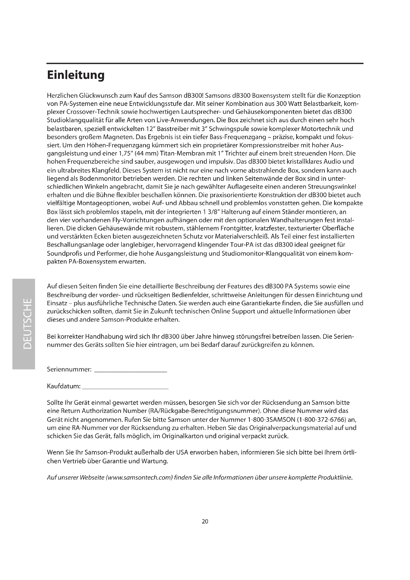 FRANÇAIS20 DEUTSCHE Herzlichen Glückwunsch zum Kauf des Samson dB300! Samsons dB300 Boxensystem stellt für die Konzeption von PA-Systemen eine neue Entwicklungsstufe dar. Mit seiner Kombination aus 300 Watt Belastbarkeit, kom- plexer Crossover-Technik sowie hochwertigen Lautsprecher- und Gehäusekomponenten bietet das dB300 Studioklangqualität für alle Arten von Live-Anwendungen. Die Box zeichnet sich aus durch einen sehr hoch belastbaren, speziell entwickelten 12” Basstreiber mit 3” Schwingspule sowie komplexer Motortechnik und besonders großem Magneten. Das Ergebnis ist ein tiefer Bass-Frequenzgang – präzise, kompakt und fokus- siert. Um den Höhen-Frequenzgang kümmert sich ein proprietärer Kompressionstreiber mit hoher Aus- gangsleistung und einer 1,75“ (44 mm) Titan-Membran mit 1” Trichter auf einem breit streuenden Horn. Die hohen Frequenzbereiche sind sauber, ausgewogen und impulsiv. Das dB300 bietet kristallklares Audio und ein ultrabreites Klangfeld. Dieses System ist nicht nur eine nach vorne abstrahlende Box, sondern kann auch liegend als Bodenmonitor betrieben werden. Die rechten und linken Seitenwände der Box sind in unter- schiedlichen Winkeln angebracht, damit Sie je nach gewählter Auflageseite einen anderen Streuungswinkel erhalten und die Bühne flexibler beschallen können. Die praxisorientierte Konstruktion der dB300 bietet auch vielfältige Montageoptionen, wobei Auf- und Abbau schnell und problemlos vonstatten gehen. Die kompakte Box lässt sich problemlos stapeln, mit der integrierten 1 3/8” Halterung auf einem Ständer montieren, an den vier vorhandenen Fly-Vorrichtungen aufhängen oder mit den optionalen Wandhalterungen fest instal- lieren. Die dicken Gehäusewände mit robustem, stählernem Frontgitter, kratzfester, texturierter Oberfläche und verstärkten Ecken bieten ausgezeichneten Schutz vor Materialverschleiß. Als Teil einer fest installierten Beschallungsanlage oder langlebiger, hervorragend klingender Tour-PA ist das dB300 ideal geeignet für Soundprofis und Performer, die hohe Ausgangsleistung und Studiomonitor-Klangqualität von einem kom- pakten PA-Boxensystem erwarten. Auf diesen Seiten finden Sie eine detaillierte Beschreibung der Features des dB300 PA Systems sowie eine Beschreibung der vorder- und rückseitigen Bedienfelder, schrittweise Anleitungen für dessen Einrichtung und Einsatz – plus ausführliche Technische Daten. Sie werden auch eine Garantiekarte finden, die Sie ausfüllen und zurückschicken sollten, damit Sie in Zukunft technischen Online Support und aktuelle Informationen über dieses und andere Samson-Produkte erhalten. Bei korrekter Handhabung wird sich Ihr dB300 über Jahre hinweg störungsfrei betreiben lassen. Die Serien- nummer des Geräts sollten Sie hier eintragen, um bei Bedarf darauf zurückgreifen zu können. Seriennummer: _____________________ Kaufdatum: _________________________ Sollte Ihr Gerät einmal gewartet werden müssen, besorgen Sie sich vor der Rücksendung an Samson bitte eine Return Authorization Number (RA/Rückgabe-Berechtigungsnummer). Ohne diese Nummer wird das Gerät nicht angenommen. Rufen Sie bitte Samson unter der Nummer 1-800-3SAMSON (1-800-372-6766) an, um eine RA-Nummer vor der Rücksendung zu erhalten. Heben Sie das Originalverpackungsmaterial auf und schicken Sie das Gerät, falls möglich, im Originalkarton und original verpackt zurück. Wenn Sie Ihr Samson-Produkt außerhalb der USA erworben haben, informieren Sie sich bitte bei Ihrem örtli- chen Vertrieb über Garantie und Wartung. Auf unserer Webseite (www.samsontech.com) finden Sie alle Informationen über unsere komplette Produktlinie. Einleitung21 DEUTSCHE dB300 Features Die Samson dB300 2-Weg-Box ist die Komplettlösung für Live-Sounds. Die wichtigsten Features sind: