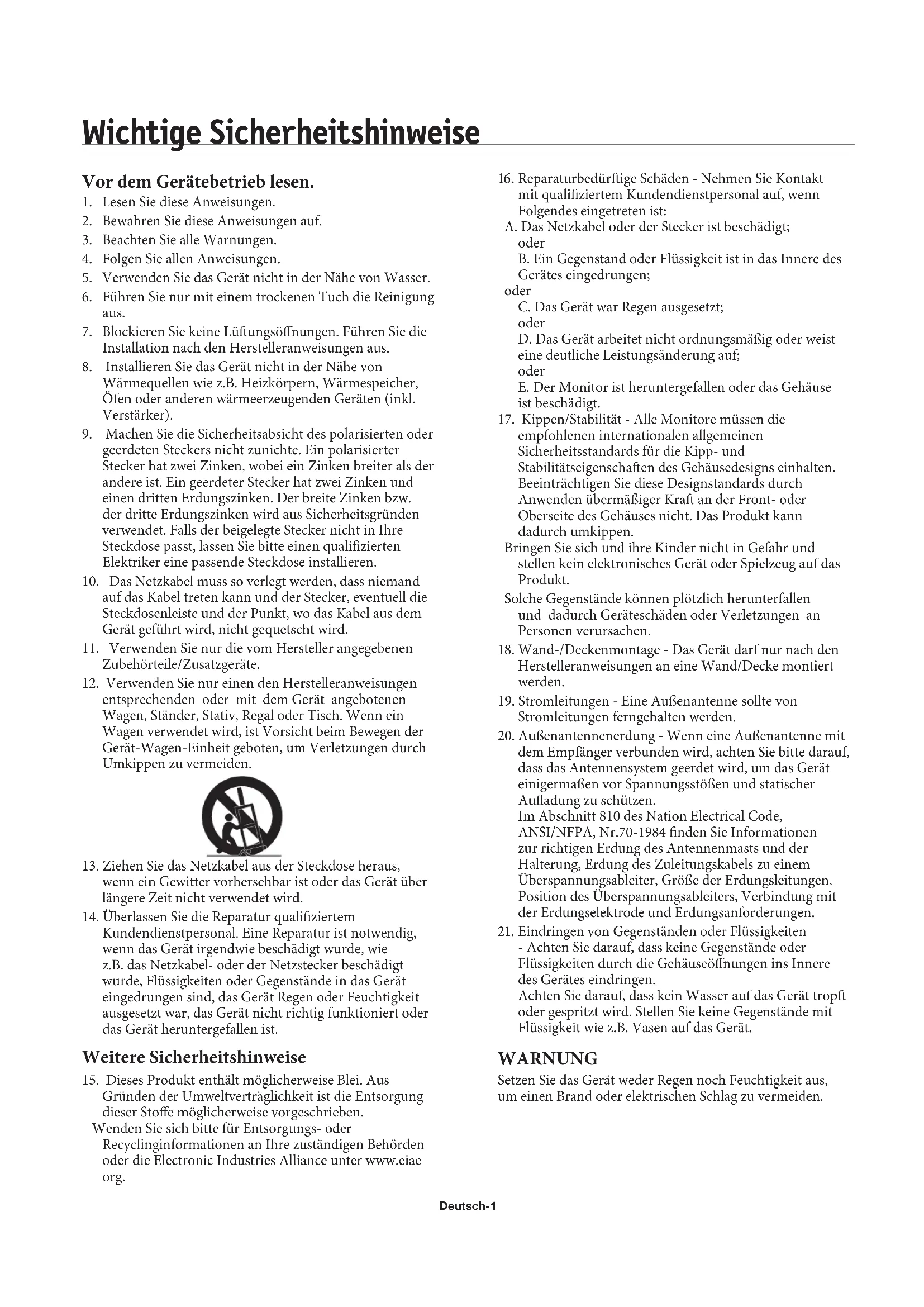entsprechenden oder mit dem Gerät angebotenen Wagen, Ständer, Stativ, Regal oder Tisch. Wenn ein Wagen verwendet wird, ist Vorsicht beim Bewegen der Gerät-Wagen-Einheit geboten, um Verletzungen durch Umkippen zu vermeiden.