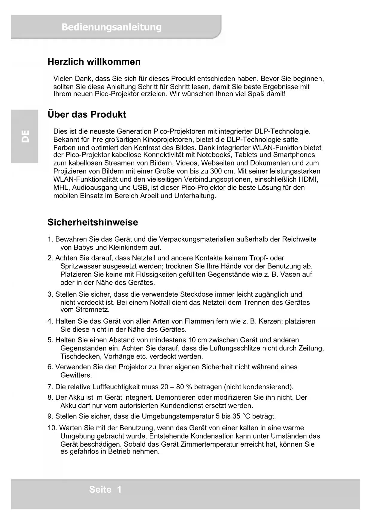 Herzlich willkommen Vielen Dank, dass Sie sich für dieses Produkt entschieden haben. Bevor Sie beginnen, sollten Sie diese Anleitung Schritt für Schritt lesen, damit Sie beste Ergebnisse mit Ihrem neuen Pico-Projektor erzielen. Wir wünschen Ihnen viel Spaß damit! Über das Produkt Dies ist die neueste Generation Pico-Projektoren mit integrierter DLP-Technologie. Bekannt für ihre großartigen Kinoprojektoren, bietet die DLP-Technologie satte Farben und optimiert den Kontrast des Bildes. Dank integrierter WLAN-Funktion bietet der Pico-Projektor kabellose Konnektivität mit Notebooks, Tablets und Smartphones zum kabellosen Streamen von Bildern, Videos, Webseiten und Dokumenten und zum Projizieren von Bildern mit einer Größe von bis zu 300 cm. Mit seiner leistungsstarken WLAN-Funktionalität und den vielseitigen Verbindungsoptionen, einschließlich HDMI, MHL, Audioausgang und USB, ist dieser Pico-Projektor die beste Lösung für den mobilen Einsatz im Bereich Arbeit und Unterhaltung. Sicherheitshinweise
