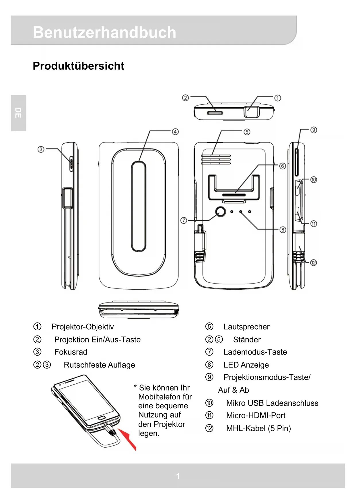 Produktübersicht ུ Lautsprecher ཱུ Ständer ྲྀ Lademodus-Taste ཷ LED Anzeige ླྀ Projektionsmodus-Taste/ Auf & Ab ཹ Mikro USB Ladeanschluss ེ Micro-HDMI-Port ཻ MHL-Kabel (5 Pin) Projektor-Objektiv ཱ Projektion Ein/Aus-Taste ི Fokusrad ཱི Rutschfeste Auflage