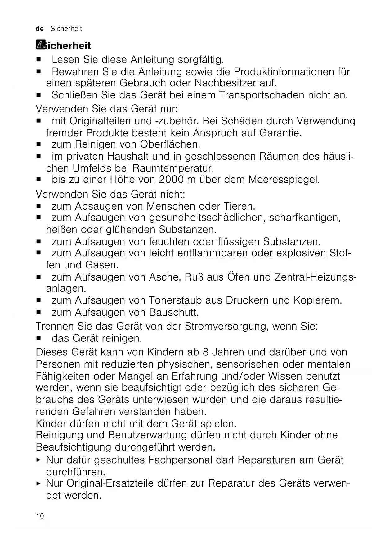 46de Sicherheit Sicherheit Sicherheit ¡ Lesen Sie diese Anleitung sorgfältig. ¡ Bewahren Sie die Anleitung sowie die Produktinformationen für einen späteren Gebrauch oder Nachbesitzer auf. ¡ Schließen Sie das Gerät bei einem Transportschaden nicht an. Verwenden Sie das Gerät nur: ¡ mit Originalteilen und -zubehör. Bei Schäden durch Verwendung fremder Produkte besteht kein Anspruch auf Garantie. ¡ zum Reinigen von Oberflächen. ¡ im privaten Haushalt und in geschlossenen Räumen des häusli- chen Umfelds bei Raumtemperatur. ¡ bis zu einer Höhe von 2000m über dem Meeresspiegel. Verwenden Sie das Gerät nicht: ¡ zum Absaugen von Menschen oder Tieren. ¡ zum Aufsaugen von gesundheitsschädlichen, scharfkantigen, heißen oder glühenden Substanzen. ¡ zum Aufsaugen von feuchten oder flüssigen Substanzen. ¡ zum Aufsaugen von leicht entflammbaren oder explosiven Stof- fen und Gasen. ¡ zum Aufsaugen von Asche, Ruß aus Öfen und Zentral-Heizungs- anlagen. ¡ zum Aufsaugen von Tonerstaub aus Druckern und Kopierern. ¡ zum Aufsaugen von Bauschutt. Trennen Sie das Gerät von der Stromversorgung, wenn Sie: ¡ das Gerät reinigen. Dieses Gerät kann von Kindern ab 8 Jahren und darüber und von Personen mit reduzierten physischen, sensorischen oder mentalen Fähigkeiten oder Mangel an Erfahrung und/oder Wissen benutzt werden, wenn sie beaufsichtigt oder bezüglich des sicheren Ge- brauchs des Geräts unterwiesen wurden und die daraus resultie- renden Gefahren verstanden haben. Kinder dürfen nicht mit dem Gerät spielen. Reinigung und Benutzerwartung dürfen nicht durch Kinder ohne Beaufsichtigung durchgeführt werden. Nur dafür geschultes Fachpersonal darf Reparaturen am Gerät durchführen. Nur Original-Ersatzteile dürfen zur Reparatur des Geräts verwen- det werden. 10Sicherheit de Wenn die Netzanschlussleitung dieses Geräts beschädigt wird, muss sie durch den Hersteller oder seinen Kundendienst oder eine ähnlich qualifizierte Person ersetzt werden, um Gefährdun- gen zu vermeiden. Nie ein beschädigtes Gerät betreiben. Nie ein Gerät mit gerissener oder gebrochener Oberfläche be- treiben. Nie an der Netzanschlussleitung ziehen, um das Gerät vom Stromnetz zu trennen. Immer am Netzstecker der Netzanschluss- leitung ziehen. Nie das Gerät an der Netzanschlussleitung ziehen oder tragen. Wenn das Gerät oder die Netzanschlussleitung beschädigt ist, sofort den Netzstecker der Netzanschlussleitung ziehen oder die Sicherung im Sicherungskasten ausschalten. Den Kundendienst rufen.