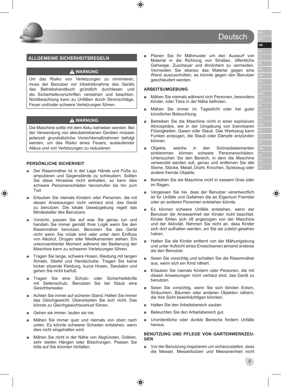 La tondeuse à gazon est capable d’amputer les mains et les pieds, ainsi que de projeter des objets. Le non respect de toutes les règles de sécurité est susceptible d’entraîner de graves blessures ou la mort.