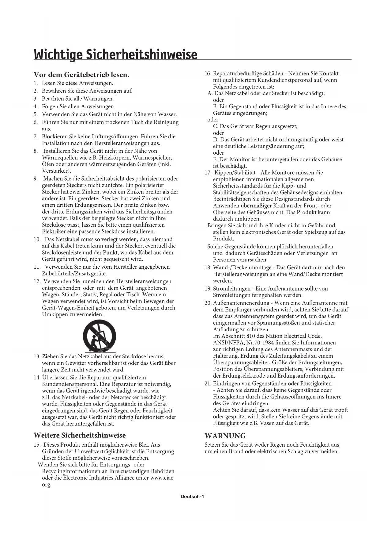 entsprechenden oder mit dem Gerät angebotenen Wagen, Ständer, Stativ, Regal oder Tisch. Wenn ein Wagen verwendet wird, ist Vorsicht beim Bewegen der Gerät-Wagen-Einheit geboten, um Verletzungen durch Umkippen zu vermeiden.