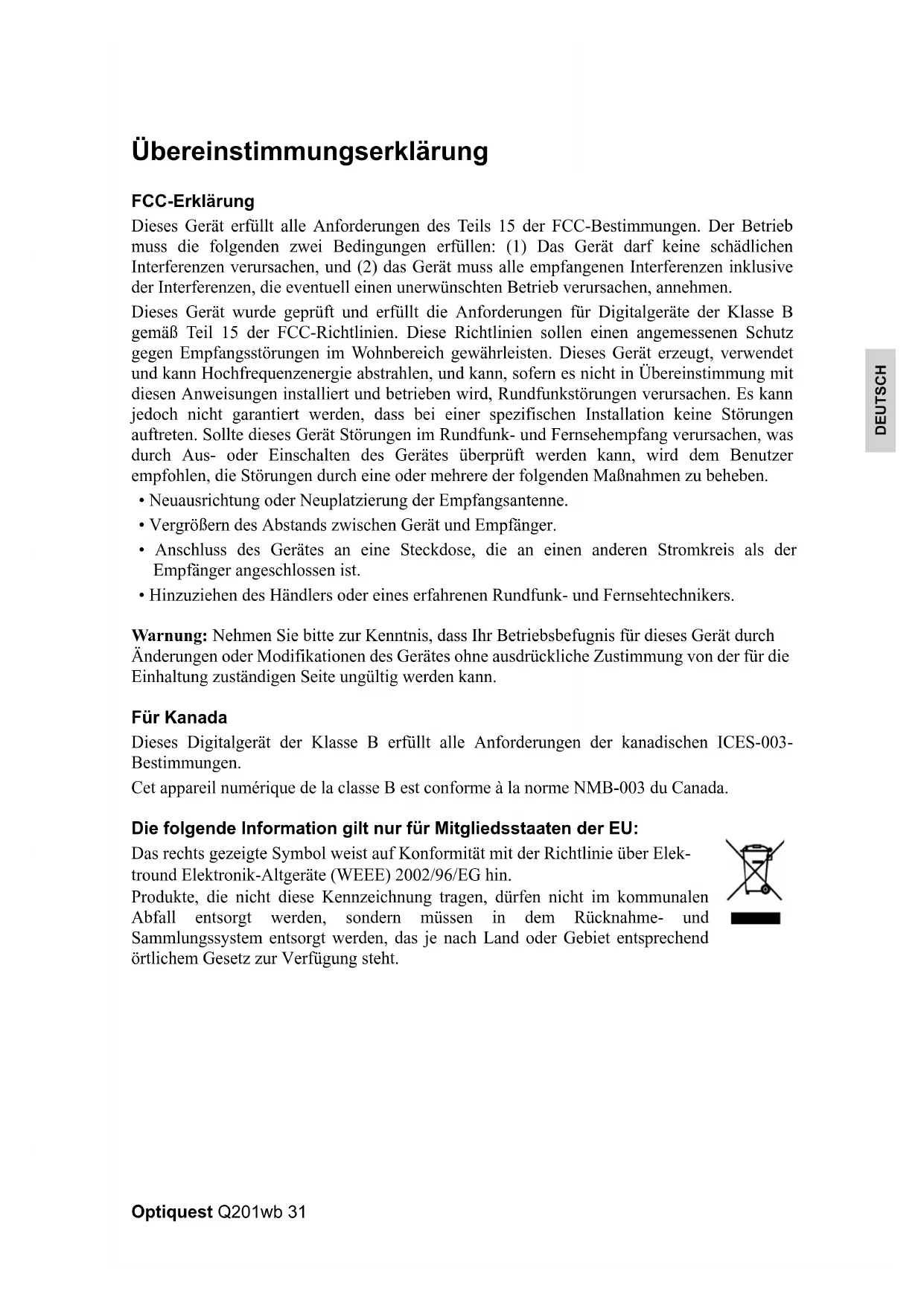 - Hinzuziehen des Händlers oder eines erfahrenen Rundfunk- und Fernsehtechnikers. Warnung: Nehmen Sie bitte zur Kenntnis, dass Ihr Betriebsbefugnis für dieses Gerät durch Änderungen oder Modifikationen des Gerätes ohne ausdrückliche Zustimmung von der für die Einhaltung zuständigen Seite ungültig werden kann. Für Kanada Dieses Digitalgerät der Klasse B erfüllt alle Anforderungen der kanadischen ICES-003- Bestimmungen. Cet appareil numérique de la classe B est conforme à la norme NMB-003 du Canada. Die folgende Information gilt nur für Mitgliedsstaaten der EU: Das rechts gezeigte Symbol weist auf Konformität mit der Richtlinie über Elek- tround Elektronik-Altgeräte (WEEE) 2002/96/EG hin. Produkte, die nicht diese Kennzeichnung tragen, dürfen nicht im kommunalen Abfall entsorgt werden, sondern müssen in dem Rücknahme- und Sammlungssystem entsorgt werden, das je nach Land oder Gebiet entsprechend örtlichem Gesetz zur Verfügung steht.32 Optiquest Q201wb DEUTSCH Wichtige Sicherheitsanweisungen