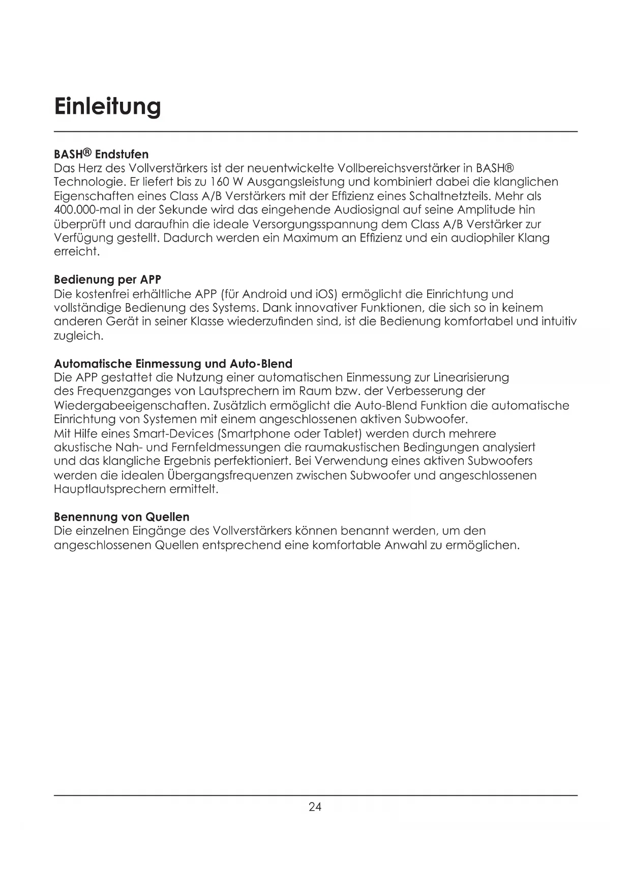 Endstufen Das Herz des Vollverstärkers ist der neuentwickelte Vollbereichsverstärker in BASH® Technologie. Er liefert bis zu 160 W Ausgangsleistung und kombiniert dabei die klanglichen EigenschafteneinesClassA/BVerstärkersmitderEfzienzeinesSchaltnetzteils.Mehrals 400.000-mal in der Sekunde wird das eingehende Audiosignal auf seine Amplitude hin überprüft und daraufhin die ideale Versorgungsspannung dem Class A/B Verstärker zur Verfügunggestellt.DadurchwerdeneinMaximumanEfzienzundeinaudiophilerKlang erreicht. Bedienung per APP Die kostenfrei erhältliche APP (für Android und iOS) ermöglicht die Einrichtung und vollständige Bedienung des Systems. Dank innovativer Funktionen, die sich so in keinem anderenGerätinseinerKlassewiederzundensind,istdieBedienungkomfortabelundintuitiv zugleich. Automatische Einmessung und Auto-Blend Die APP gestattet die Nutzung einer automatischen Einmessung zur Linearisierung des Frequenzganges von Lautsprechern im Raum bzw. der Verbesserung der Wiedergabeeigenschaften. Zusätzlich ermöglicht die Auto-Blend Funktion die automatische Einrichtung von Systemen mit einem angeschlossenen aktiven Subwoofer. Mit Hilfe eines Smart-Devices (Smartphone oder Tablet) werden durch mehrere akustische Nah- und Fernfeldmessungen die raumakustischen Bedingungen analysiert und das klangliche Ergebnis perfektioniert. Bei Verwendung eines aktiven Subwoofers werden die idealen Übergangsfrequenzen zwischen Subwoofer und angeschlossenen Hauptlautsprechern ermittelt. Benennung von Quellen Die einzelnen Eingänge des Vollverstärkers können benannt werden, um den angeschlossenen Quellen entsprechend eine komfortable Anwahl zu ermöglichen.25 EA101EQ-G Eigenschaften Lieferumfang Coax USB EA101EQ-G Vollverstärker Infrarot-Fernbedienung AAA Batterien (2 Stück) Bedienungsanleitung EA101EQ-G Feature Grundfunktionalität Stereo-Vollverstärker, 80 W Ausgangsleistung pro Kanal und sieben Eingangskanäle Verstärker BASH® Verstärkertechnologie 2x80Wan4Ohm(max.1%THD)proKanal Bitte besuchen Sie die Website http://elac.com für weiterführende Informationen Eingänge 2x analoger Eingang (Line Level Out) 2x optischer Digital-Eingang / SPDIF (bis zu 192 kHz und 24 Bit)* 1x koaxialer Digital- Eingang / SPDIF (bis zu 192 kHz und 24 Bit) 1x asynchroner USB Eingang (bis zu 192 kHz und 24 Bit) 1x Bluetooth©A2DP/aptX Empfänger *Aufgrund von Unterschieden in der Qualität und der Länge von optischen Leitern und Sendern kann eine Wie- dergabe von 192 kHz nicht garantiert werden Lautsprecher-Anschlüsse 2 Paar Lautsprecherklemmen Subwoofer-Ausgang 1x analoger Ausgang (Line Level Out) mit Auto EQ- und Auto-Blend-Funktionalität Kopfhörer-Ausgang 1x 6.3 mm Stereo-Ausgang Bedienung Sensor-Tasten an der Front des Gerätes APP(AndroidundiOS;dasSmart-DevicemussüberBluetooth©4.0LowEnergyFunktionalitätverfügen) Infrarot-Fernbedienung Dekodierung Dolby Digital 2.1 DSP AutoEQ (automatische Raumeinmessung) AutoBlend(automatischeKongurationvonSystemenmitangeschlossenemaktivenSubwoofer) Display OLED (organic light emitting diode) POWER SOURCE
