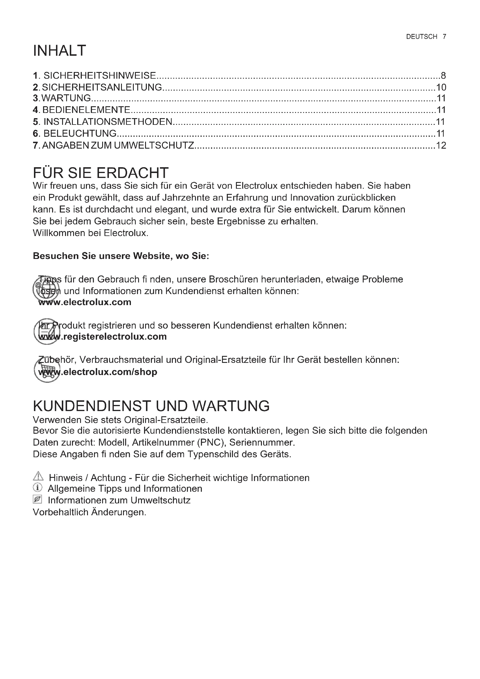 Verwenden Sie stets Original-Ersatzteile. Bevor Sie die autorisierte Kundendienststelle kontaktieren, legen Sie sich bitte die folgenden Daten zurecht: Modell, Artikelnummer (PNC), Seriennummer. Diese Angaben fi nden Sie auf dem Typenschild des Geräts. Hinweis / Achtung - Für die Sicherheit wichtige Informationen Allgemeine Tipps und Informationen Informationen zum Umweltschutz Vorbehaltlich Änderungen. DEUTSCH8 www.electrolux.com