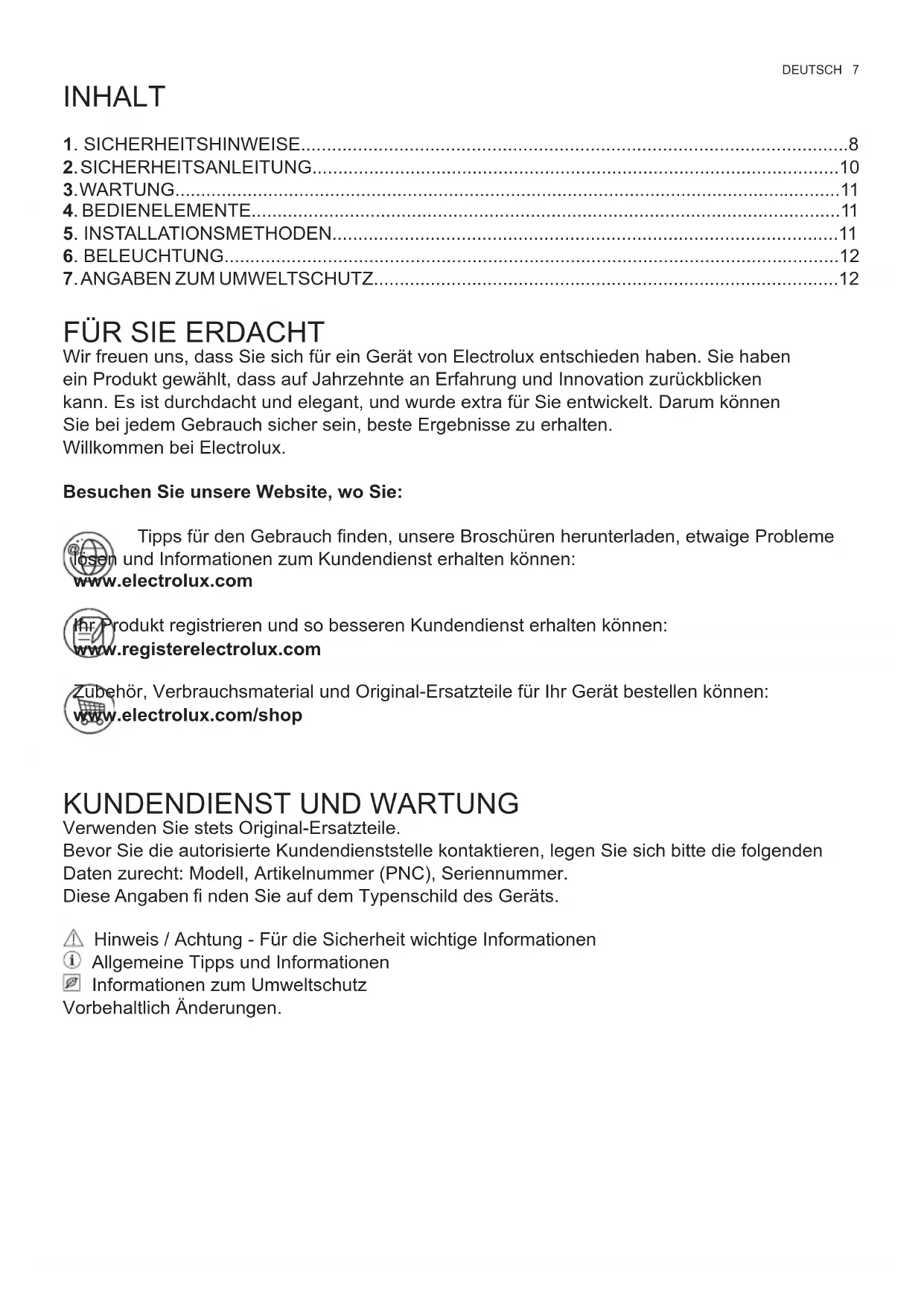 Verwenden Sie stets Original-Ersatzteile. Bevor Sie die autorisierte Kundendienststelle kontaktieren, legen Sie sich bitte die folgenden Daten zurecht: Modell, Artikelnummer (PNC), Seriennummer. Diese Angaben fi nden Sie auf dem Typenschild des Geräts. Hinweis / Achtung - Für die Sicherheit wichtige Informationen Allgemeine Tipps und Informationen Informationen zum Umweltschutz Vorbehaltlich Änderungen. DEUTSCH8 www.electrolux.com
