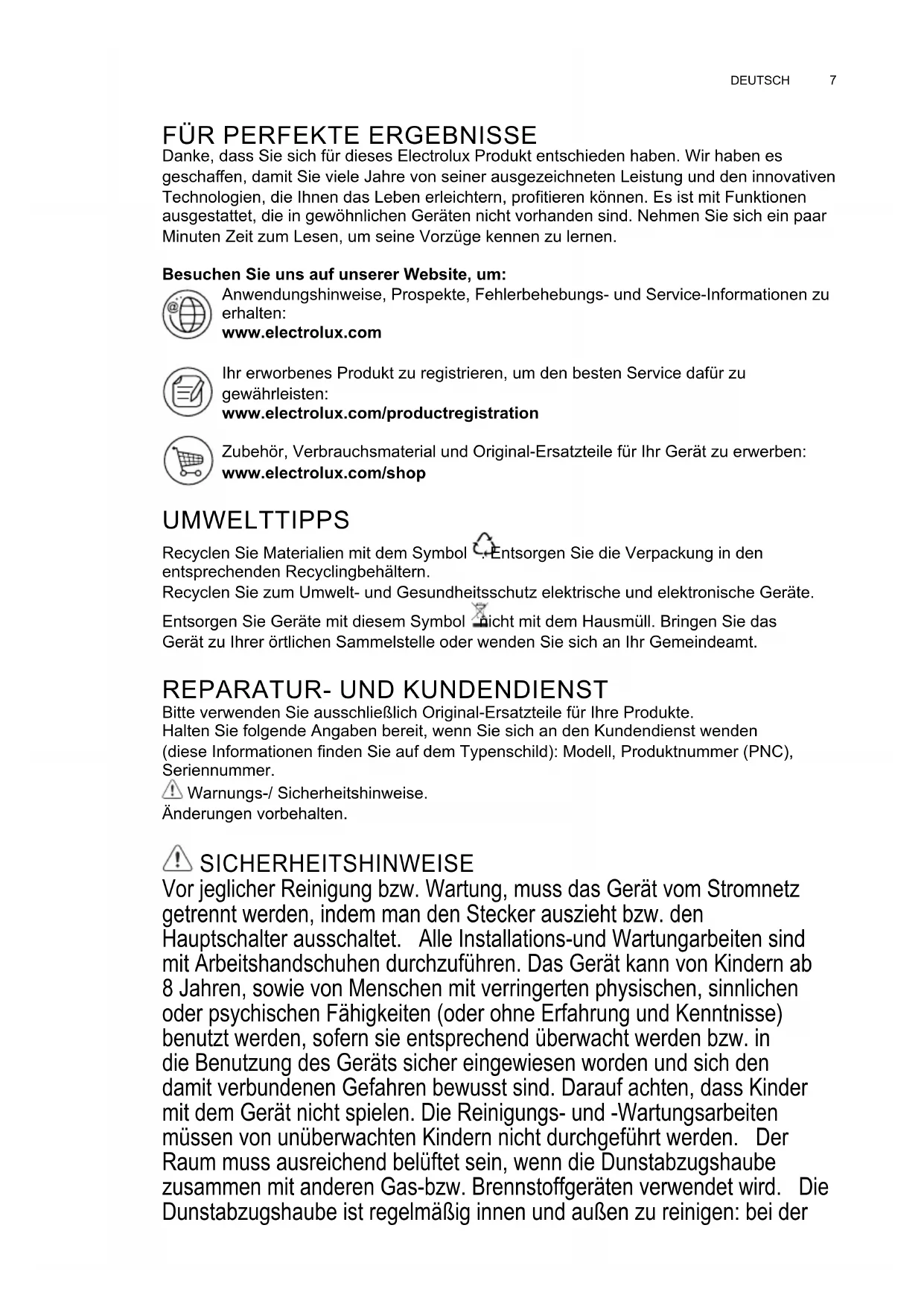 Bitte verwenden Sie ausschließlich Original-Ersatzteile für Ihre Produkte Halten Sie folgende Angaben bereit, wenn Sie sich an den Kundendienst wenden (diese Informationen nden Sie auf dem Typenschild): Modell, Produktnummer (PNC), Seriennummer Warnungs-/ Sicherheitshinweise Änderungen vorbehalten SICHERHEITSHINWEISE Vor jeglicher Reinigung bzw. Wartung, muss das Gerät vom Stromnetz getrennt werden, indem man den Stecker auszieht bzw. den Hauptschalter ausschaltet. Alle Installations-und Wartungarbeiten sind mit Arbeitshandschuhen durchzuführen. Das Gerät kann von Kindern ab 8 Jahren, sowie von Menschen mit verringerten physischen, sinnlichen oder psychischen Fähigkeiten (oder ohne Erfahrung und Kenntnisse) benutzt werden, sofern sie entsprechend überwacht werden bzw. in die Benutzung des Geräts sicher eingewiesen worden und sich den damit verbundenen Gefahren bewusst sind. Darauf achten, dass Kinder mit dem Gerät nicht spielen. Die Reinigungs- und -Wartungsarbeiten müssen von unüberwachten Kindern nicht durchgeführt werden. Der Raum muss ausreichend belüftet sein, wenn die Dunstabzugshaube zusammen mit anderen Gas-bzw. Brennstoffgeräten verwendet wird. Die Dunstabzugshaube ist regelmäßig innen und außen zu reinigen: bei der DE GEBRAUCHSANLEITUNGwww.electrolux.com