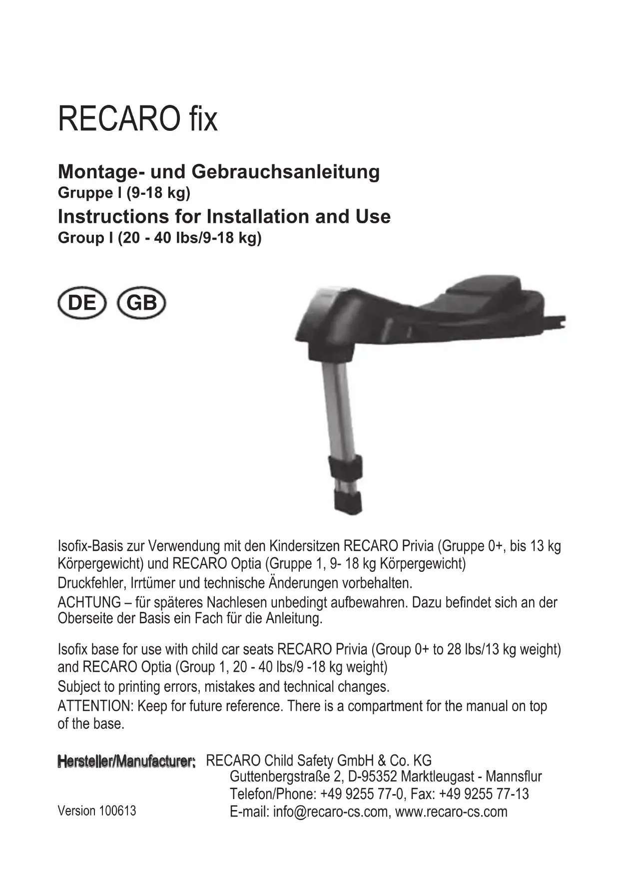 Montage- und Gebrauchsanleitung Gruppe I (9-18 kg) Isox-Basis zur Verwendung mit den Kindersitzen RECARO Privia (Gruppe 0+, bis 13 kg Körpergewicht) und RECARO Optia (Gruppe 1, 9- 18 kg Körpergewicht) Druckfehler, Irrtümer und technische Änderungen vorbehalten. ACHTUNG – für späteres Nachlesen unbedingt aufbewahren. Dazu bendet sich an der Oberseite der Basis ein Fach für die Anleitung. Version 100613 Hersteller/Manufacturer: RECARO Child Safety GmbH & Co. KG Guttenbergstraße 2, D-95352 Marktleugast - Mannsur Telefon/Phone: +49 9255 77-0, Fax: +49 9255 77-13 E-mail: info@recaro-cs.com, www.recaro-cs.com Instructions for Installation and Use Group I (20 - 40 lbs/9-18 kg) Isox base for use with child car seats RECARO Privia (Group 0+ to 28 lbs/13 kg weight) and RECARO Optia (Group 1, 20 - 40 lbs/9 -18 kg weight) Subject to printing errors, mistakes and technical changes. ATTENTION: Keep for future reference. There is a compartment for the manual on top of the base. RECARO fixFR
