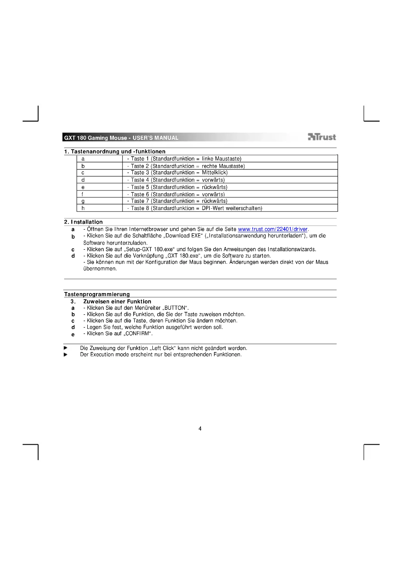 Laden Sie die Anleitung für Ihr Maus kostenlos im PDF-Format! Finden Sie Ihr Handbuch Kusan GXT 180 - TRUST und nehmen Sie Ihr elektronisches Gerät wieder in die Hand. Auf dieser Seite sind alle Dokumente veröffentlicht, die für die Verwendung Ihres Geräts notwendig sind. Kusan GXT 180 von der Marke TRUST.