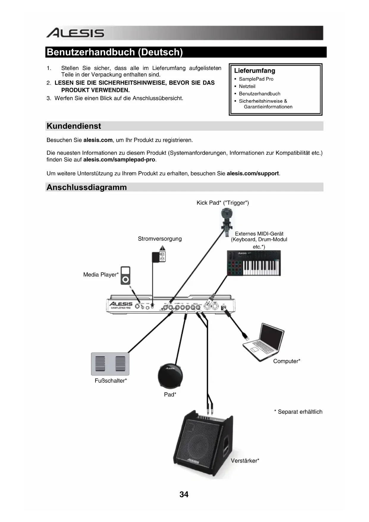 Kundendienst Besuchen Sie alesis.com, um Ihr Produkt zu registrieren. Die neuesten Informationen zu diesem Produkt (Systemanforderungen, Informationen zur Kompatibilität etc.) finden Sie auf alesis.com/samplepad-pro. Um weitere Unterstützung zu Ihrem Produkt zu erhalten, besuchen Sie alesis.com/support.