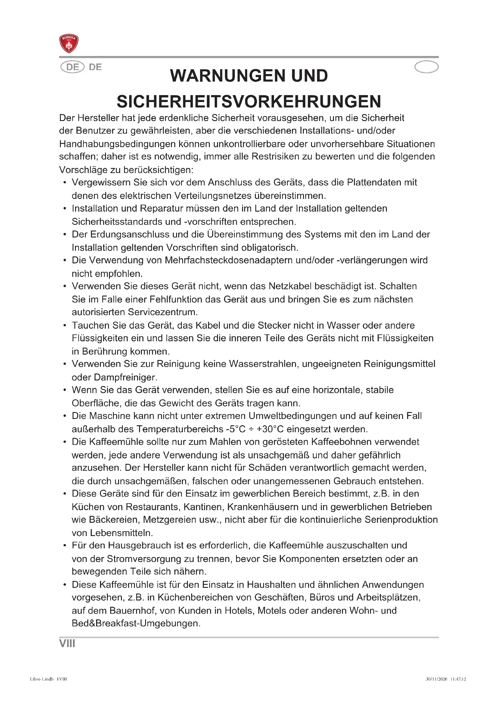 Das Handbuch richtet sich an den Benutzer und/oder Wartungspersonal der Maschine und gilt als integraler Bestandteil der Maschine. Der Zweck dieses Handbuchs besteht darin, Informationen für den korrekten Gebrauch der Maschine und eine angemessene Wartung zu liefern sowie die Sicherheit des Bedieners zu gewährleisten. Das Handbuch muss während der gesamten Lebensdauer der Maschine aufbewahrt und an jeden anderen Benutzer oder späteren Besitzer weitergegeben werden. Die in diesem Handbuch enthaltenen Informationen ersetzen nicht die Sicherheitshinweise und technischen Daten für Installation und Betrieb, die direkt auf die Maschine und die Verpackung angewendet werden. Dieses Handbuch spiegelt den aktuellen Stand der Technik wider und kann nicht nur deshalb als unzulänglich betrachtet werden, weil es aufgrund neuer Erfahrungen Libro 1.indb 1XLibro 1.indb 1X 30/11/2020 11:47:1230/11/2020 11:47:12XI aktualisiert wurde. Der Hersteller behält sich auch das Recht vor, das Handbuch zu ändern, ohne die Verpflichtung, frühere Ausgaben zu aktualisieren, außer in Ausnahmefällen. Eine unsachgemäße oder von der in diesem Handbuch beschriebenen Verwendung des Geräts abweichende Verwendung schließt jede Garantiebedingung oder Herstellerverantwortung aus; die Verwendung muss von einer erwachsenen und verantwortlichen Person vorgenommen werden. Dieses Handbuch ist sorgfältig aufzubewahren, da der Hersteller nicht für Personen- oder Sachschäden haftet, die an der Maschine entstehen, wenn sie nicht entsprechend ihrer Beschreibung verwendet wird oder wenn die Wartungs- und Sicherheitshinweise nicht beachtet werden. Libro 1.indb 1XILibro 1.indb 1XI 30/11/2020 11:47:1230/11/2020 11:47:12XII FR FR