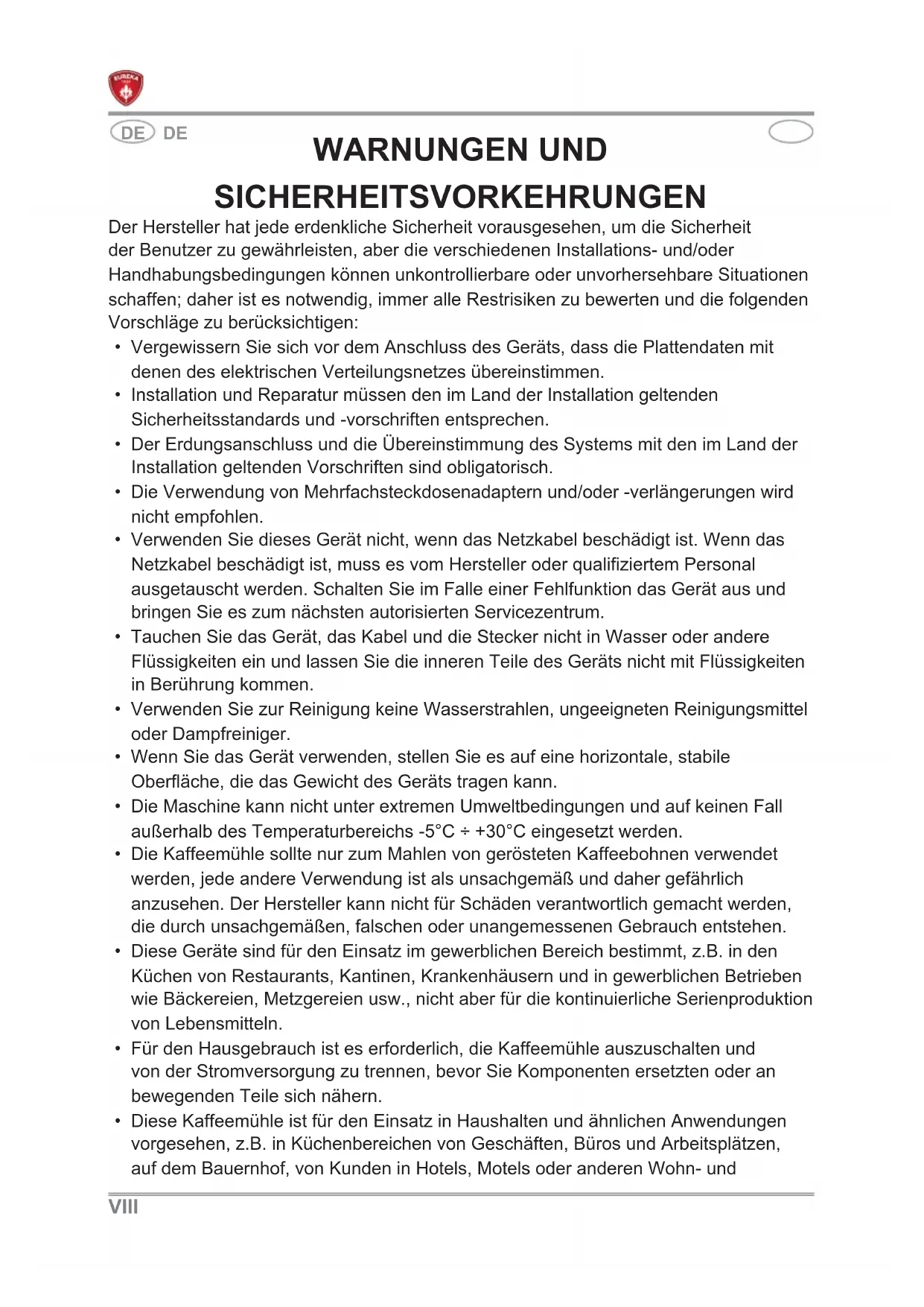 - Die Kaffeemühle sollte nur zum Mahlen von gerösteten Kaffeebohnen verwendet werden, jede andere Verwendung ist als unsachgemäß und daher gefährlich anzusehen. Der Hersteller kann nicht für Schäden verantwortlich gemacht werden, die durch unsachgemäßen, falschen oder unangemessenen Gebrauch entstehen.