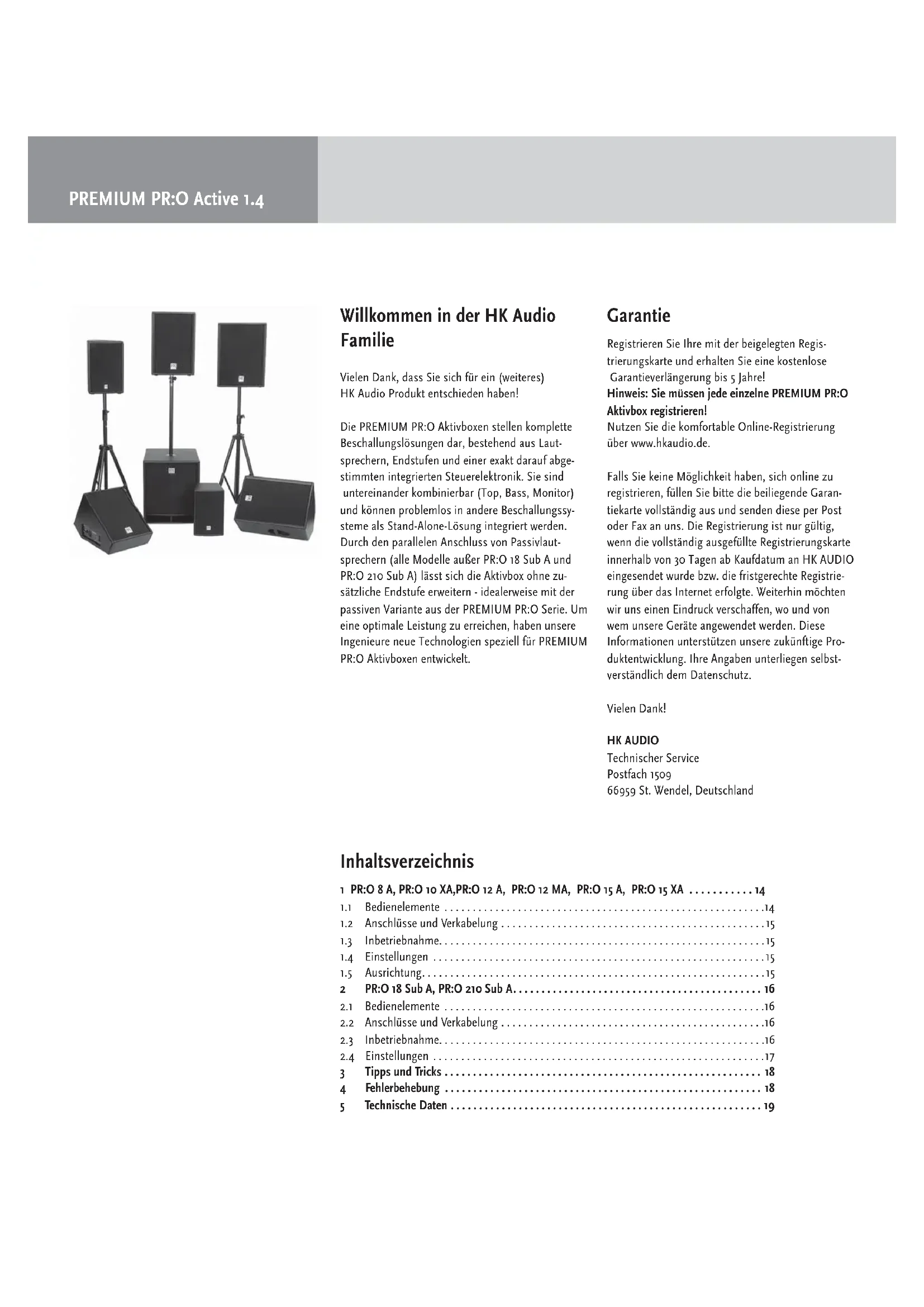 - PR:O 12 MA + PR:O 12 M active, stereo active/passive, mono Monitoring Systems 4 x PR:O 8 A + 2 x PR:O 210 Sub A 4 x PR:O 8 A + 2 x PR:O 18 Sub A11 English 5 Technical Data PR:O 8 A PR:O 10 XA PR:O 12 A PR:O 12 MA PR:O 15 A PR:O 15 XA PR:O 18 Sub A PR:O 210 Sub A Frequency response +/- 3dB: 89 Hz - 19 kHz 89 Hz - 19 kHz 85 Hz - 19 kHz 85 Hz - 19 kHz 55 Hz - 19 kHz 55 Hz - 19 kHz 48 Hz – fx 60 Hz – fx Frequency response -10 dB: 63 Hz - 19 kHz 67 Hz - 19 kHz 78 Hz - 19 kHz 78 Hz - 19 kHz 48 Hz - 19 kHz 48 Hz - 19 kHz 38 Hz – fx 40 Hz – fx Max SPL (Half Space): 118 dB 121 dB 123 dB 123 dB 123 dB 123 dB 125 dB 123 dB Loudspeakers: Bass / midrange woofer 8" 10" 12" 12" 15" 15" 18" 2x 10" High-frequency driver 1" 1" 1" 1" 1" 1" - - HF protection (passive): Dyn. protective circuit Dyn. protective circuit Dyn. protective circuit Dyn. protective circuit Dyn. protective circuit Dyn. protective circuit Dyn. protective circuit Dyn. prot. circuit Horn directivity: 80° x 80 CD horn 90° x 60 CD horn 60° x 40 CD horn 60° x 40° CD horn 60° x 40° CD horn 60° x 40° CD horn - - Power amps: 1x 600 W 1x 600 W 1x 600 W 1x 600 W 1x 600 W 1x 600 W 1x 600 Watt 1x 600 Watt Class D - 4 ohms Class D - 4 ohms Class D - 4 ohms Class D - 4 ohms Class D - 4 ohms Class D - 4 ohms Class D - 4 ohms Class D - 4 ohms Limiters: RMS Limiter yes yes yes yes yes yes no no Peak Limiter yes yes yes yes yes yes no no Subsonic Filter: 35 Hz 35 Hz 35 Hz 68 Hz 35 Hz 35 Hz 35 Hz 35 Hz Cutoff frequency - - - - - - 75 - 150 Hz variable 75 - 150 Hz variable of the active crossover (12 dB/ octave) EQ: Tone knob Tone knob Tone knob - Tone knob Tone knob - - Connectors: Line/Mic combi jack: 1x combi XLR/1/4" 1x combi XLR/1/4" 1x combi XLR/1/4" 1x combi XLR/1/4" 1x combi XLR/1/4" 1x combi XLR/1/4" 2x 1x combi XLR/1/4" 2x 1x combi XLR/1/4" balanced Through, balanced: 1x XLR Through 1x XLR Through 1x XLR Through 1x XLR Through 1x XLR Through 1x XLR Through 2x XLR Through 2x XLR Through Out, balanced: - - - - - - 2x XLR L/R Out Mid/High 2x XLR L/R Out Mid/High Parallel Speaker Out* 1x Speakon 1x Speakon 1x Speakon 1x Speakon 1x Speakon 1x Speakon - - Pole mount: MonoTilt™ DuoTilt 3/7 DuoTilt 3/7 - DuoTilt 3/7 DuoTilt 3/7 M20 threaded base plate 2x M20 thread. base plate Rigging points: 2x M8 3x M8 3x M8 3x M8 3x M8 3x M8 - - Weight: 11 kg / 24.3 lbs. 13,9 kg / 30.6 lbs. 19,5 kg / 43 lbs. 17,1 kg / 37,7 lbs. 23,5 kg / 51,8 lbs. 22,4 kg / 49,4 lbs. 39,8 kg / 87,8 lbs. 27,2 kg / 55 lbs. Dimensions (WxHxD) 27 x 42 x 27 cm 32 x 48 x 29 cm 39 x 57 x 36 cm 39 x 55,5 x 38 cm 47 x 61,5 x 41,5 cm 47 x 61,5 x 44,5 cm 53 x 61 x 64 cm 36 x 61 x 53 cm *) Min impedance 8 ohm/300 WPREMIUM PR:O Active 1.4 Willkommen in der HK Audio Familie Vielen Dank, dass Sie sich für ein (weiteres) HK Audio Produkt entschieden haben! Die PREMIUM PR:O Aktivboxen stellen komplette Beschallungslösungen dar, bestehend aus Laut- sprechern, Endstufen und einer exakt darauf abge- stimmten integrierten Steuerelektronik. Sie sind untereinander kombinierbar (Top, Bass, Monitor) und können problemlos in andere Beschallungssy- steme als Stand-Alone-Lösung integriert werden. Durch den parallelen Anschluss von Passivlaut- sprechern (alle Modelle außer PR:O 18 Sub A und PR:O 210 Sub A) lässt sich die Aktivbox ohne zu- sätzliche Endstufe erweitern - idealerweise mit der passiven Variante aus der PREMIUM PR:O Serie. Um eine optimale Leistung zu erreichen, haben unsere Ingenieure neue Technologien speziell für PREMIUM PR:O Aktivboxen entwickelt. Garantie Registrieren Sie Ihre mit der beigelegten Regis- trierungskarte und erhalten Sie eine kostenlose Garantieverlängerung bis 5 Jahre! Hinweis: Sie müssen jede einzelne PREMIUM PR:O Aktivbox registrieren! Nutzen Sie die komfortable Online-Registrierung über www.hkaudio.de. Falls Sie keine Möglichkeit haben, sich online zu registrieren, füllen Sie bitte die beiliegende Garan- tiekarte vollständig aus und senden diese per Post oder Fax an uns. Die Registrierung ist nur gültig, wenn die vollständig ausgefüllte Registrierungskarte innerhalb von 30 Tagen ab Kaufdatum an HK AUDIO eingesendet wurde bzw. die fristgerechte Registrie- rung über das Internet erfolgte. Weiterhin möchten wir uns einen Eindruck verschaffen, wo und von wem unsere Geräte angewendet werden. Diese Informationen unterstützen unsere zukünftige Pro- duktentwicklung. Ihre Angaben unterliegen selbst- verständlich dem Datenschutz. Vielen Dank! HK AUDIO Technischer Service Postfach 1509 66959 St. Wendel, Deutschland Inhaltsverzeichnis 1 PR:O 8 A, PR:O 10 XA,PR:O 12 A, PR:O 12 MA, PR:O 15 A, PR:O 15 XA p. 14