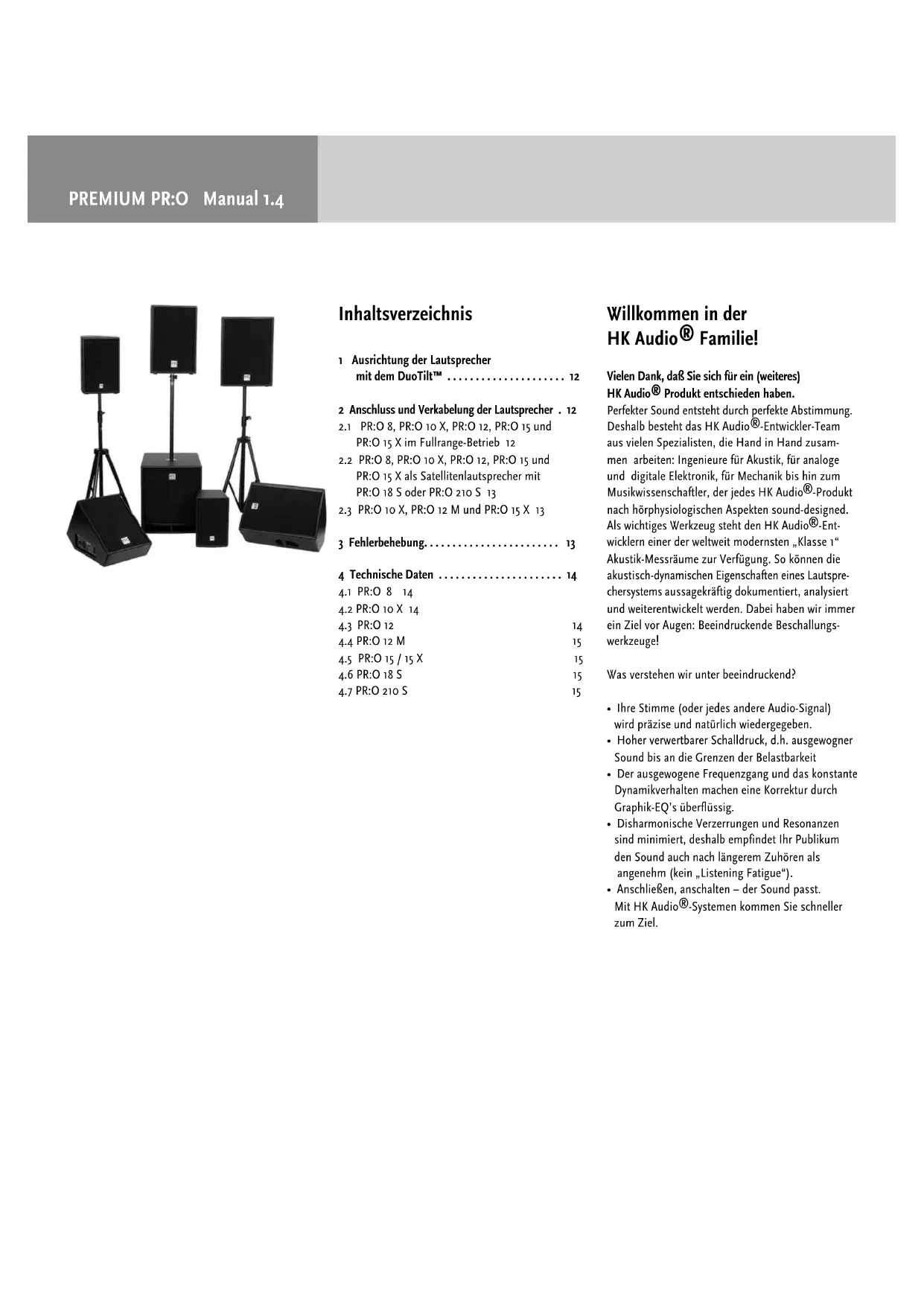 -Systemen kommen Sie schneller zum Ziel.11 Deutsch Facts & Features DuoTilt™ – bessere Ausnutzung der Schallenergie Der neu entwickelte DuoTilt™ Hochständerflansch ermöglicht eine effizientere Ausnutzung der Schallenergie. Mit zwei verschiedenen Aufstellwinkeln (3°, 7°) können die Lautsprecher optimal auf das Publikum ausgerichtet werden. Störende Decken-reflexionen werden vermieden, der Sound wird druckvoller und klarer. In die PR:O 8 A ist ein HK Audio Mono Tilt ™ mit 3° Neigungswinkel integriert. Passiv Crossover in Bass-Systemen Die PREMIUM Bässe PR:O 18 S und PR:O 210 S sind mit einer auf wändigen Frequenzweiche ausgestattet, die dem Basslautsprecher ausschließlich die tiefen Frequenzen, der angeschlossenen Satellitenbox exklu- siv die Mitten und Hochanteile zuweist. So entsteht ein homogenes Soundsystem ohne die sonst üblichen Soundprobleme durch Phasenüberlagerungen zwi- schen Subwoofer und Topteil. Modular System Die PREMIUM PR:O Series ist so konstruiert, dass alle Topteile optimal mit den beiden Subwoofern kombinierbar sind. Modularität versteht sich auch akustisch, das heißt, alle Boxenmodelle sind akus- tisch aufeinander abgestimmt, wie alle HK Audio