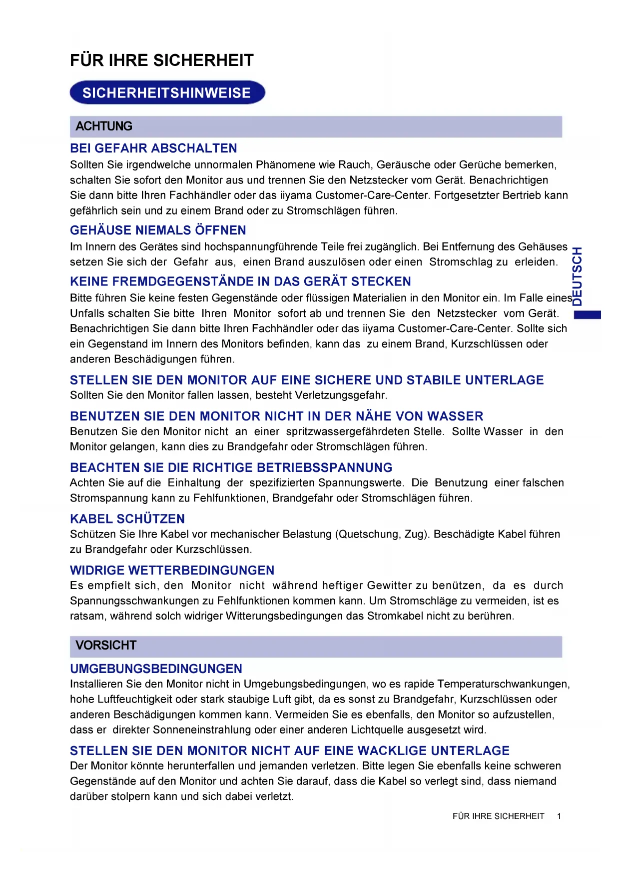 Schützen Sie Ihre Kabel vor mechanischer Belastung (Quetschung, Zug). Beschädigte Kabel führen zu Brandgefahr oder Kurzschlüssen. WIDRIGE WETTERBEDINGUNGEN Es empfielt sich, den Monitor nicht während heftiger Gewitter zu benützen, da es durch Spannungsschwankungen zu Fehlfunktionen kommen kann. Um Stromschläge zu vermeiden, ist es ratsam, während solch widriger Witterungsbedingungen das Stromkabel nicht zu berühren. VORSICHT UMGEBUNGSBEDINGUNGEN Installieren Sie den Monitor nicht in Umgebungsbedingungen, wo es rapide Temperaturschwankungen, hohe Luftfeuchtigkeit oder stark staubige Luft gibt, da es sonst zu Brandgefahr, Kurzschlüssen oder anderen Beschädigungen kommen kann. Vermeiden Sie es ebenfalls, den Monitor so aufzustellen, dass er direkter Sonneneinstrahlung oder einer anderen Lichtquelle ausgesetzt wird. STELLEN SIE DEN MONITOR NICHT AUF EINE WACKLIGE UNTERLAGE Der Monitor könnte herunterfallen und jemanden verletzen. Bitte legen Sie ebenfalls keine schweren Gegenstände auf den Monitor und achten Sie darauf, dass die Kabel so verlegt sind, dass niemand darüber stolpern kann und sich dabei verletzt.DEUTSCH VORSICHT SONSTIGES ERGONOMISCHE HINWEISE Um eine Ermüdung der Augen auszuschliessen, sollten Sie den Monitor nicht vor einem grellen Hintergrund oder in einem dunklen Raum benutzen. Um optimalen Sehkomfort zu gewährleisten, sollte die Oberkante des Monitors knapp unterhalb Ihrer Augenhöhe liegen und der Abstand zwischen Augen und Monitor 40-60 cm betragen. Wenn Sie den Monitor länger benutzen, sollten Sie mindestens 10 Minuten pro Stunde nicht in den Monitor schauen, um eine Überanstrengung der Augen zu vermeiden. MAGNETFELDBEEINFLUSSUNG Stellen Sie den Monitor nicht in die Nähe starker Magnetfelder, z.B. Lautsprecher oder Leuchtstofflampen. Durch andere Geräte könnte die Darstellung des Monitors beeinträchtigt werden, auch eine Geräuschentwicklung ist nicht auszuschliessen.